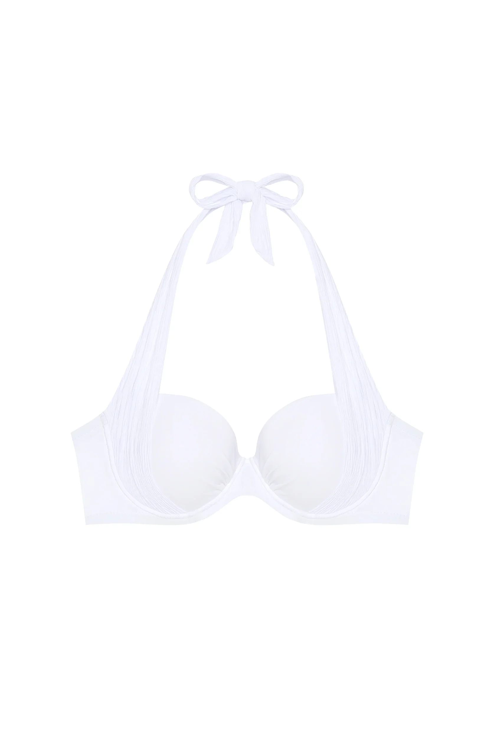 White half-cup underwired moulded cup bikini top. Cups gathered at the middle and on the side. Wide multiposition straps in pleated voile. Back hook.
