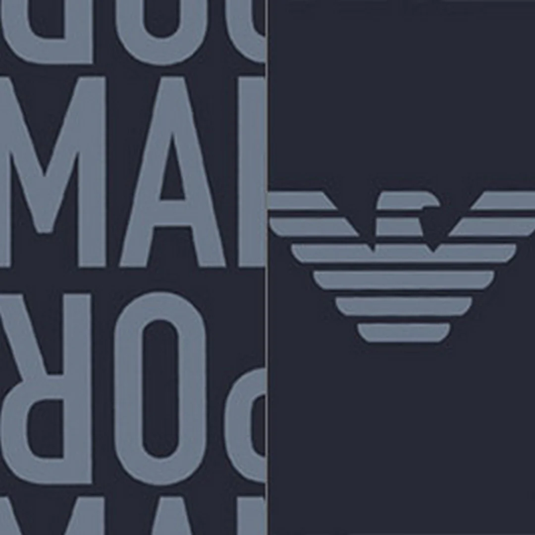 Il secondo paio, in tinta unita blu, si distingue per la lavorazione allover della scritta “Emporio Armani”, che aggiunge un tocco moderno e raffinato.