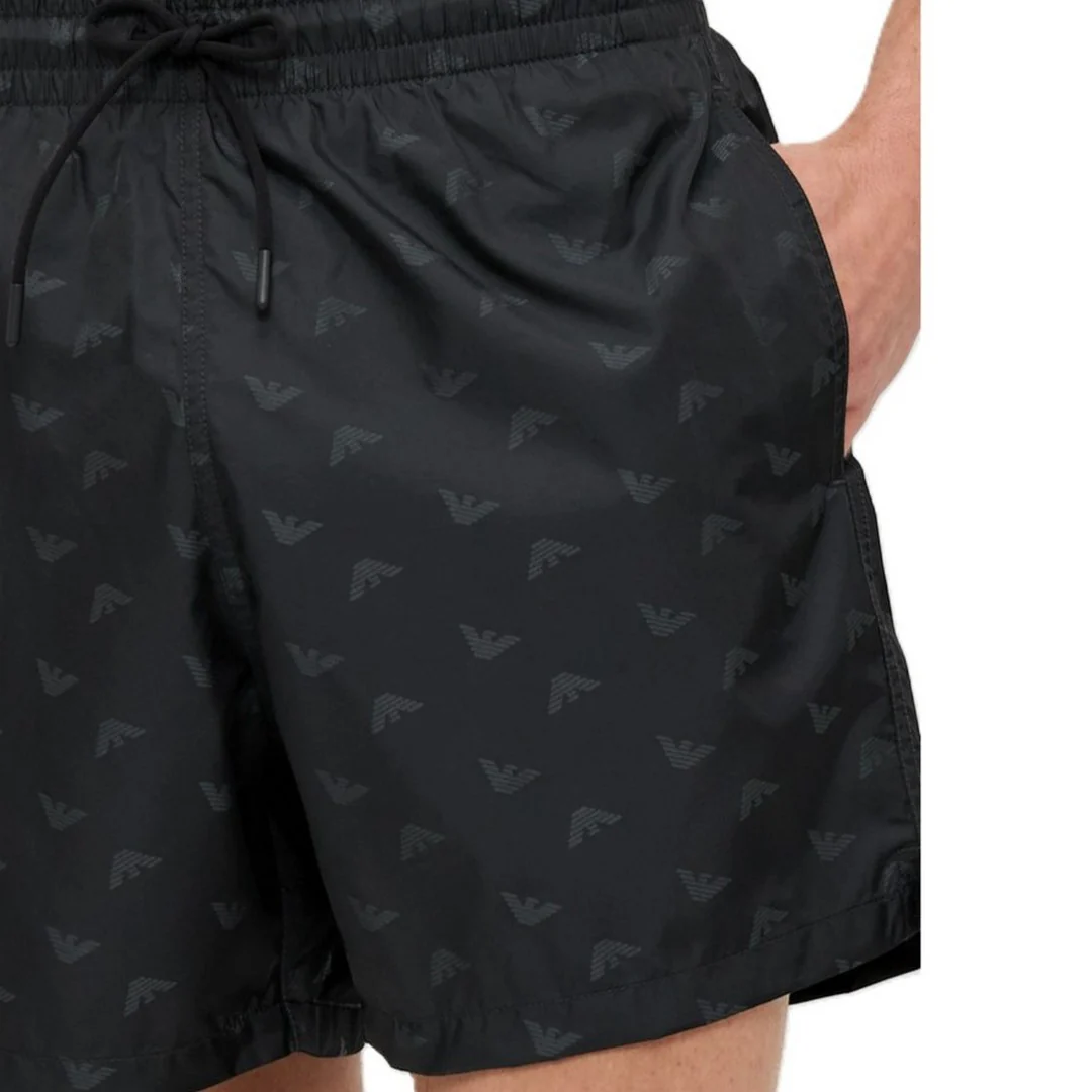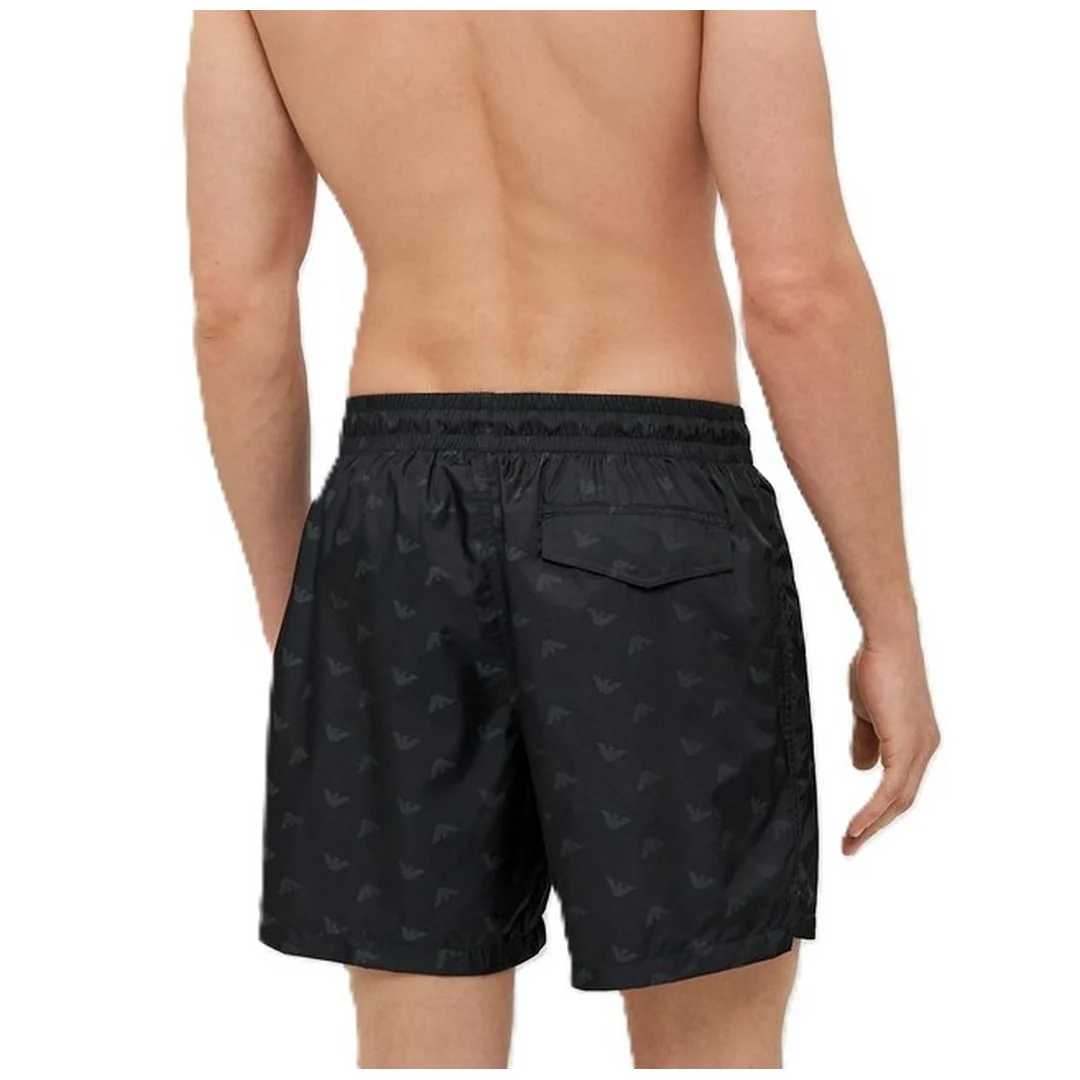 Costume modello pantaloncino da uomo della linea Emporio Armani Beachwear, con iconica stampa di piccole aquile grigie a contrasto su base nera.