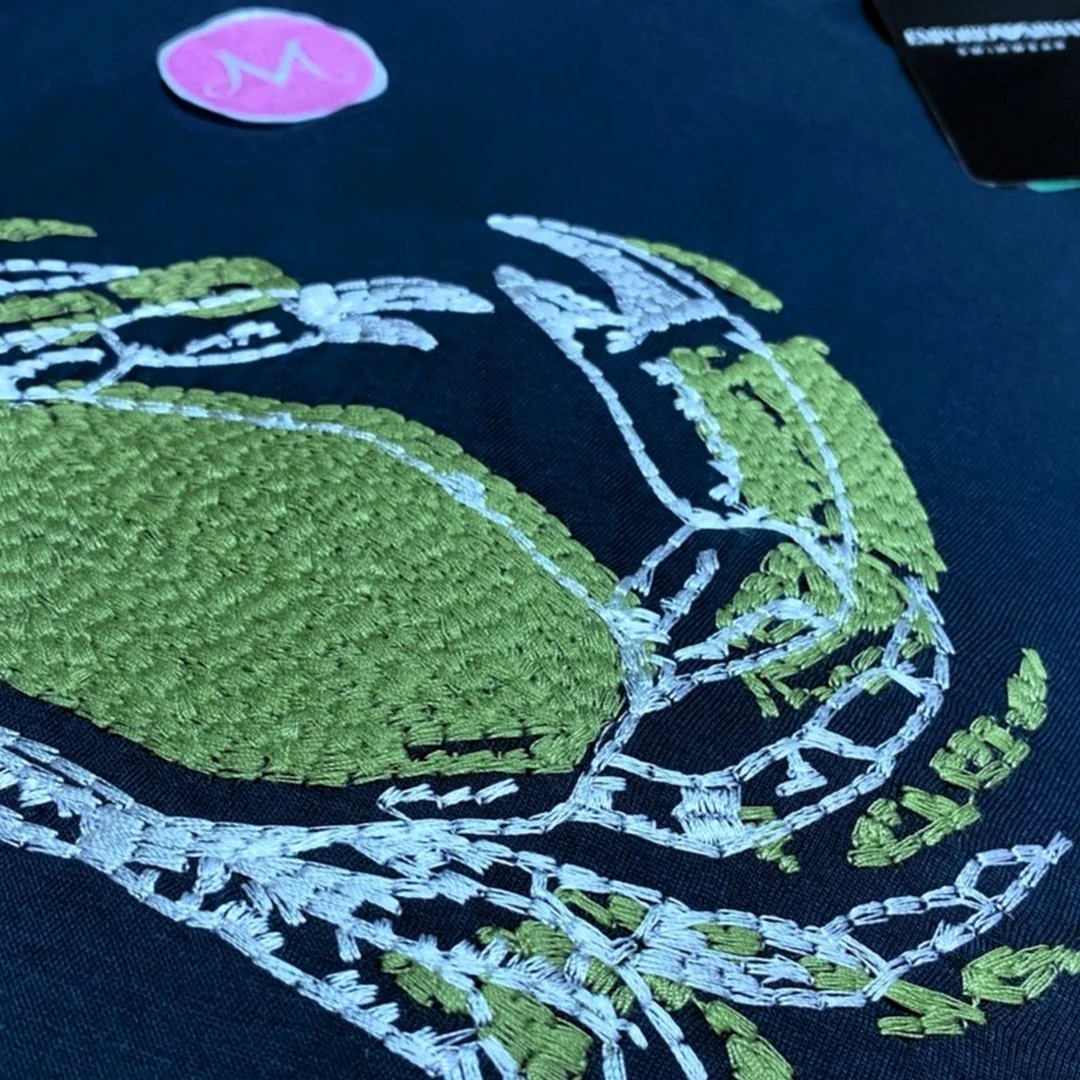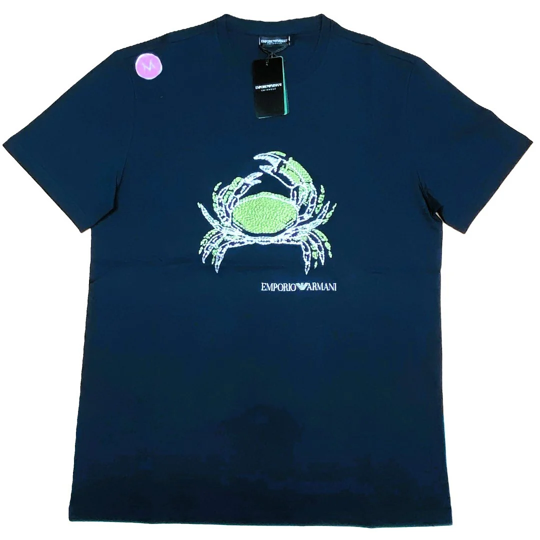 T-shirt da uomo Emporio Armani con un elegante e ironico granchio verde ricamato su fondo blu.