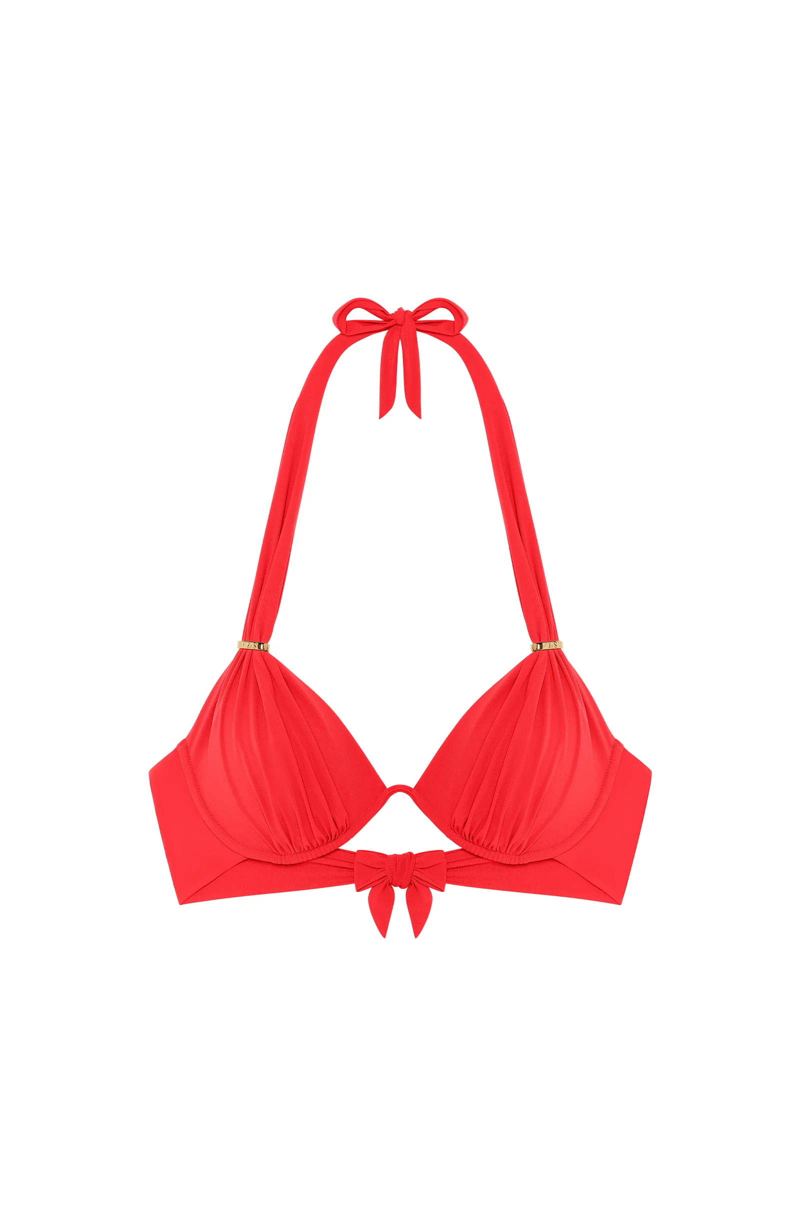 With its unique underwire and low-cut cups between the breasts, the bikini top FABIA is a timeless iconic model. Its modern and refined cut fits all body types. The gathers under the breasts create volume and the metallic loops along the straps allow you to play with the depth of the neckline.