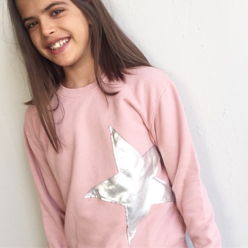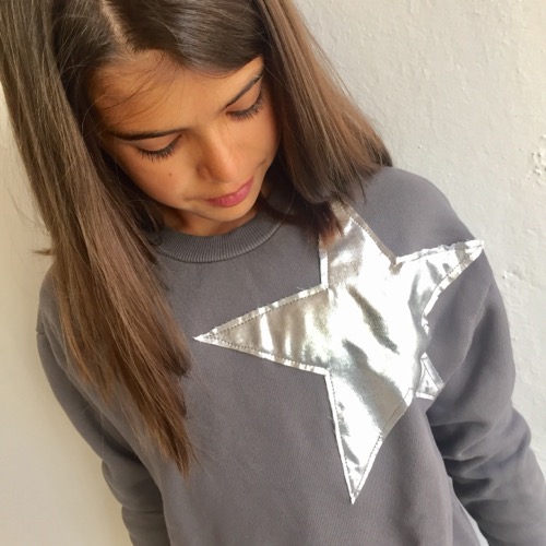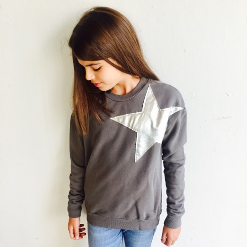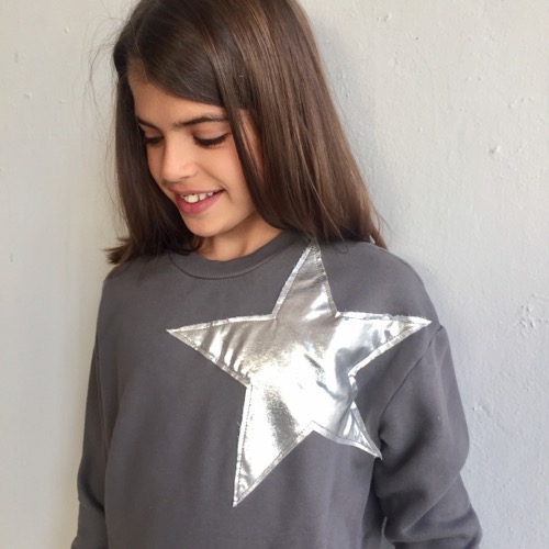 Felpa con maxi. Crea tu la tua felpa! Scegli nelle note il colore della base e della stella. Colori felpa base: grigio, cipria, nero. Colori stella: argento, oro, scozzese, pied de poule. Su richiesta, nelle note, è possibile chiedere l’applicazione stella bassa.