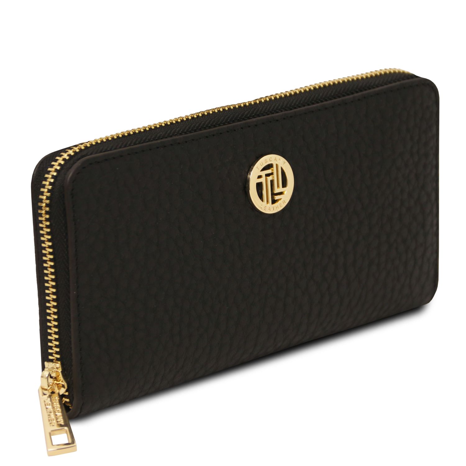 Il portafoglio nero di Tuscany Leather, realizzato in pelle di alta qualità, è caratterizzato da un design classico con finiture eleganti. La sua superficie liscia e la zip robusta lo rendono perfetto per l’uso quotidiano. Le numerose tasche interne offrono uno spazio ben organizzato per carte e banconote.