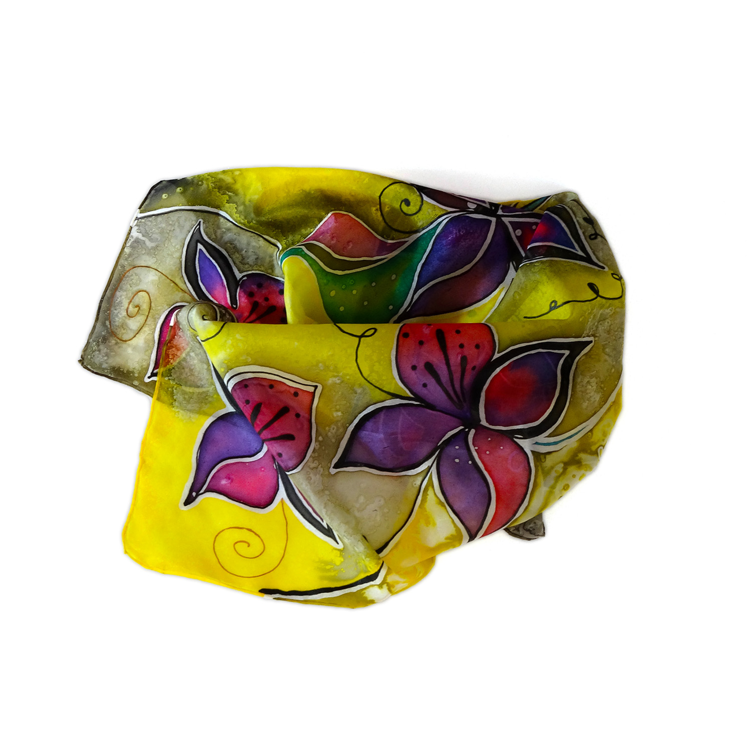 Foulard in pura seta dipinto a mano – Fiori in color: Delicate orchidee colorano un fantastico foulard, contrasti di colore risaltano tra i fiori.