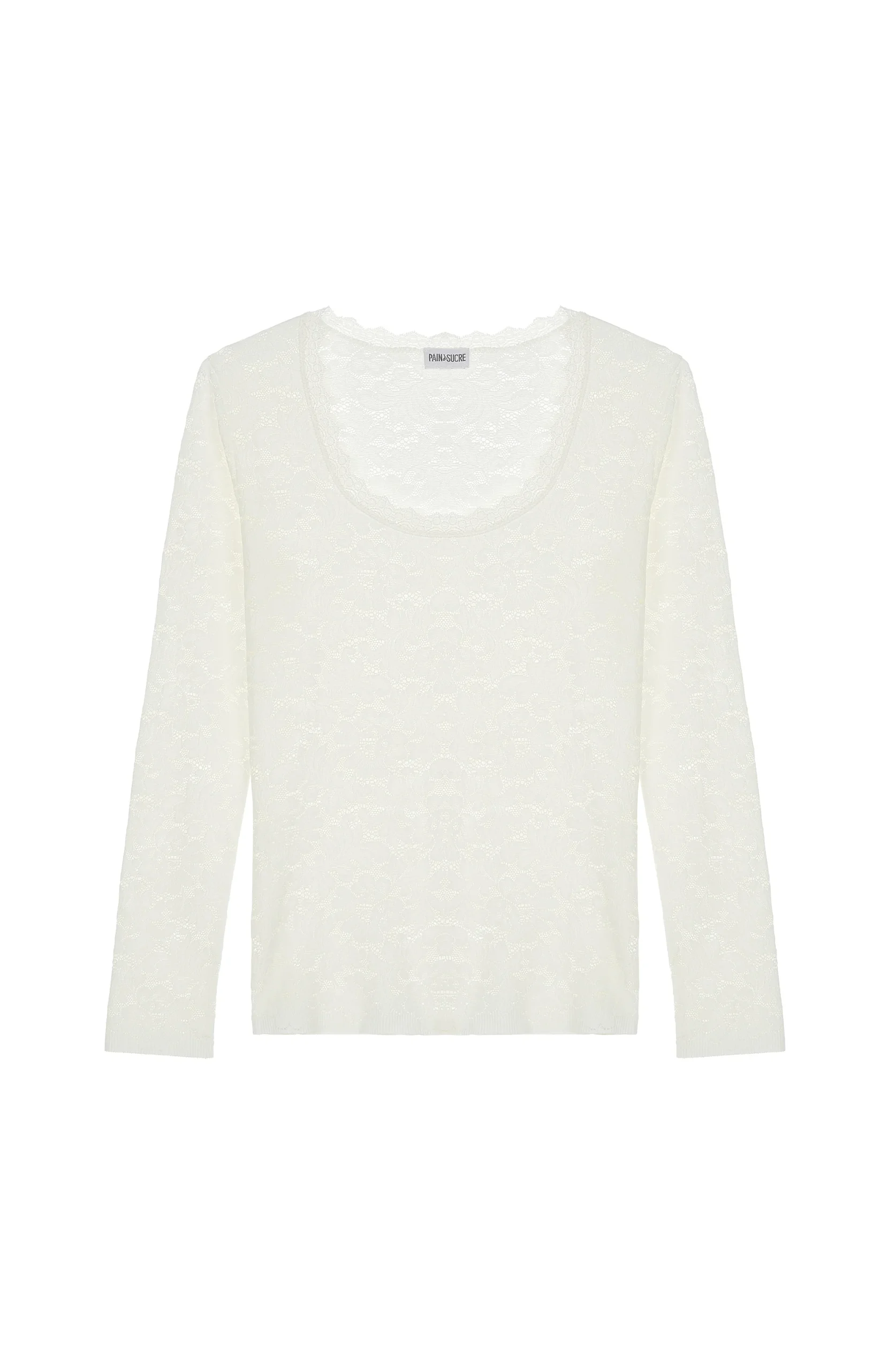 Foam white lace top, long-sleeves, round neckline. Matching lace finish.