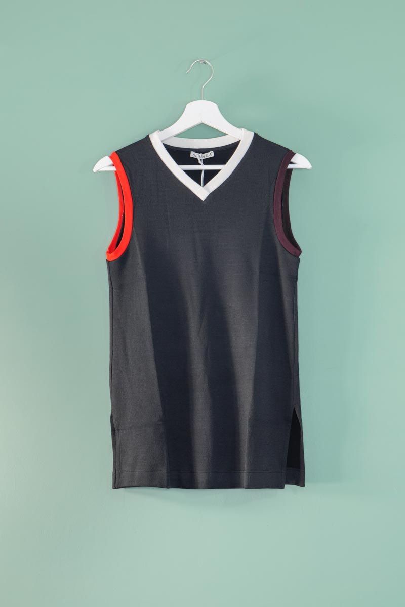 96% cotone organico 4% elastame Basica smanicata, scollo V profili combo contrasto.