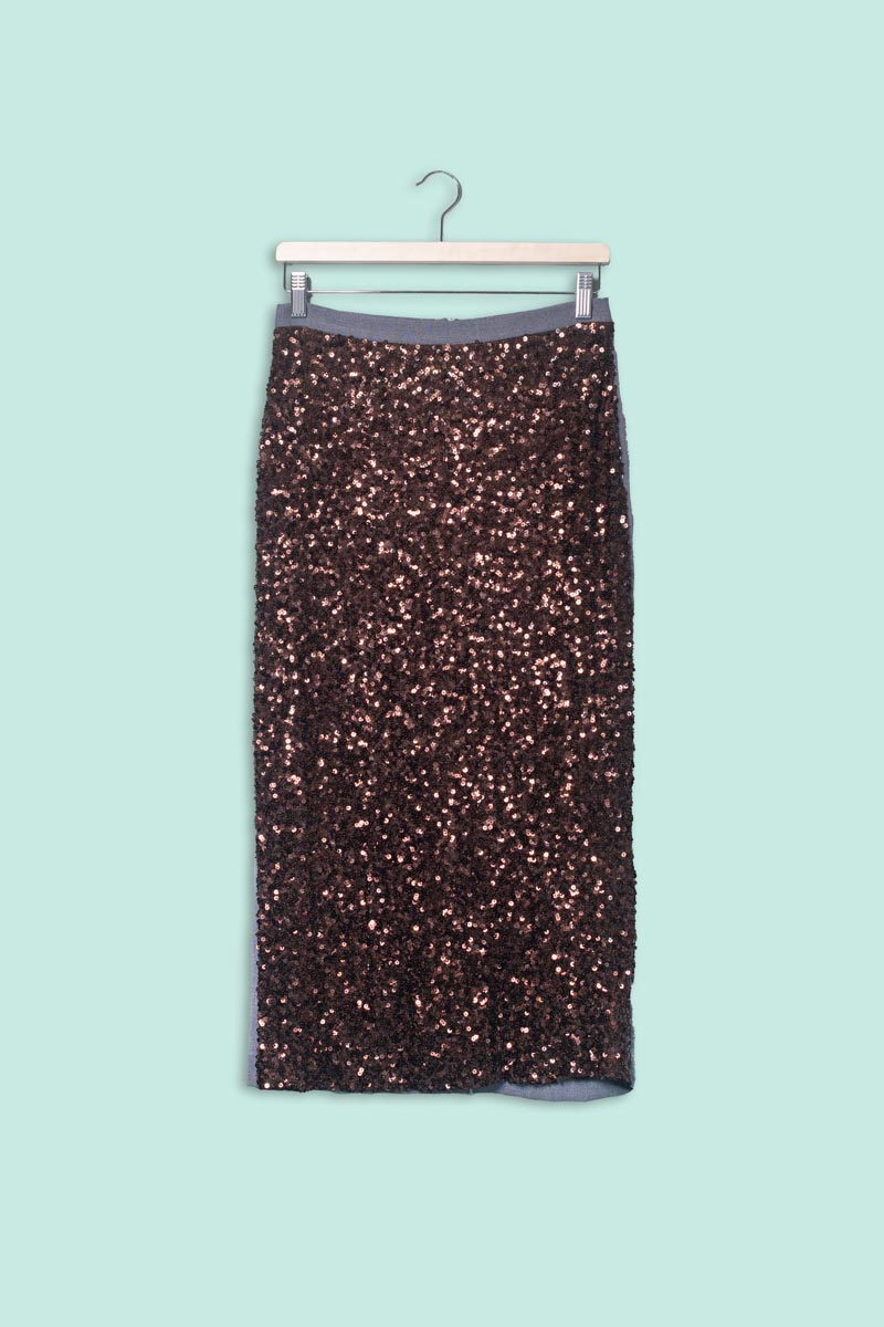 Gonna in poliestere e paillettes. retro in tessuto cadente e avanti con paillettes