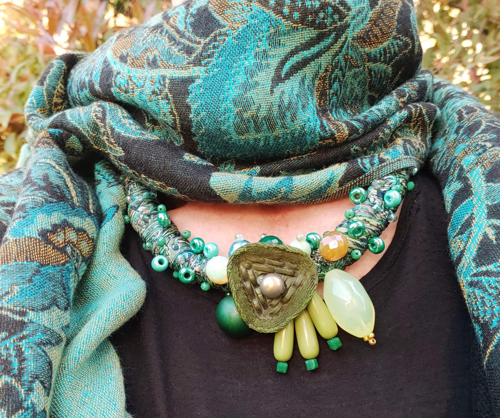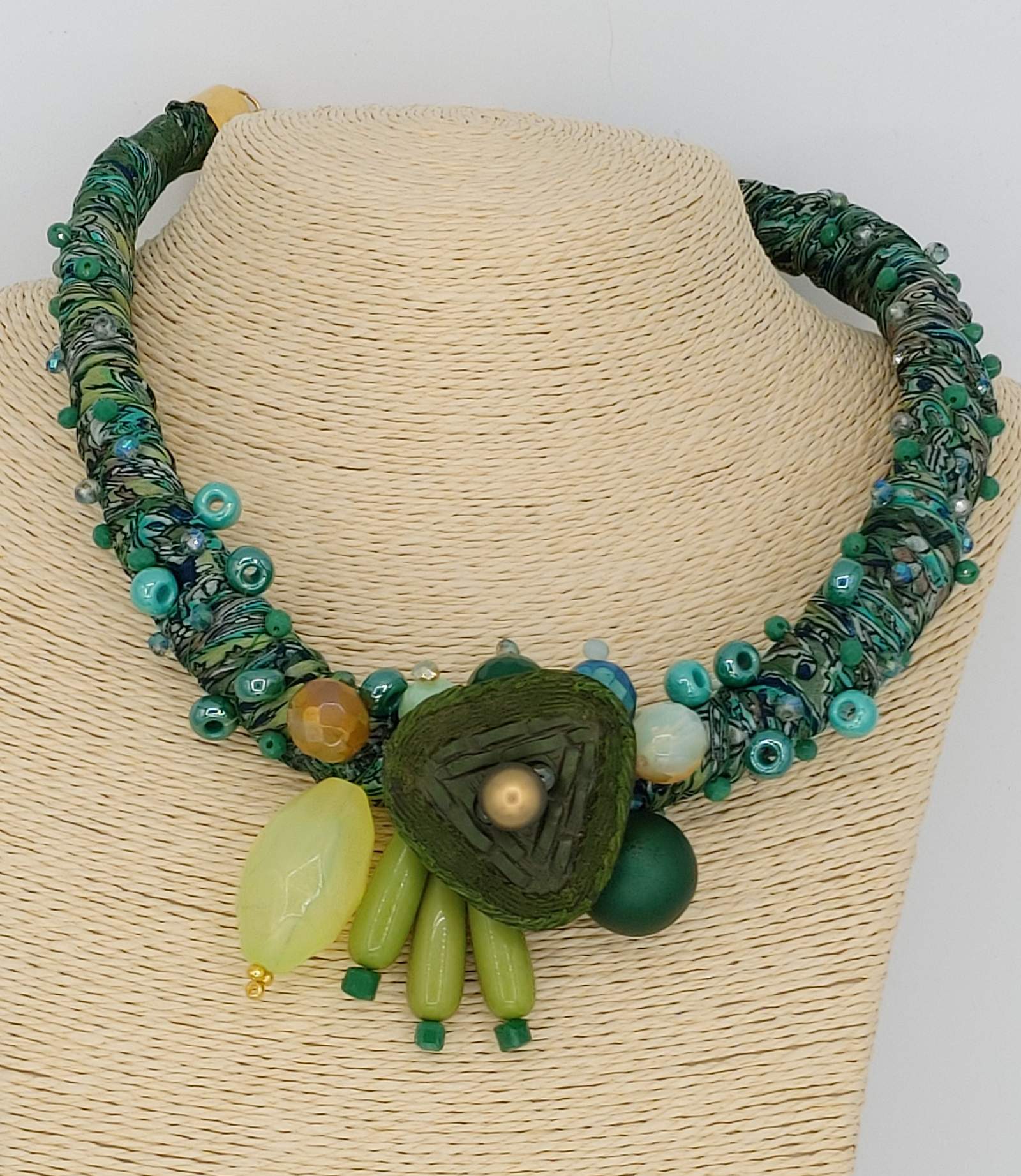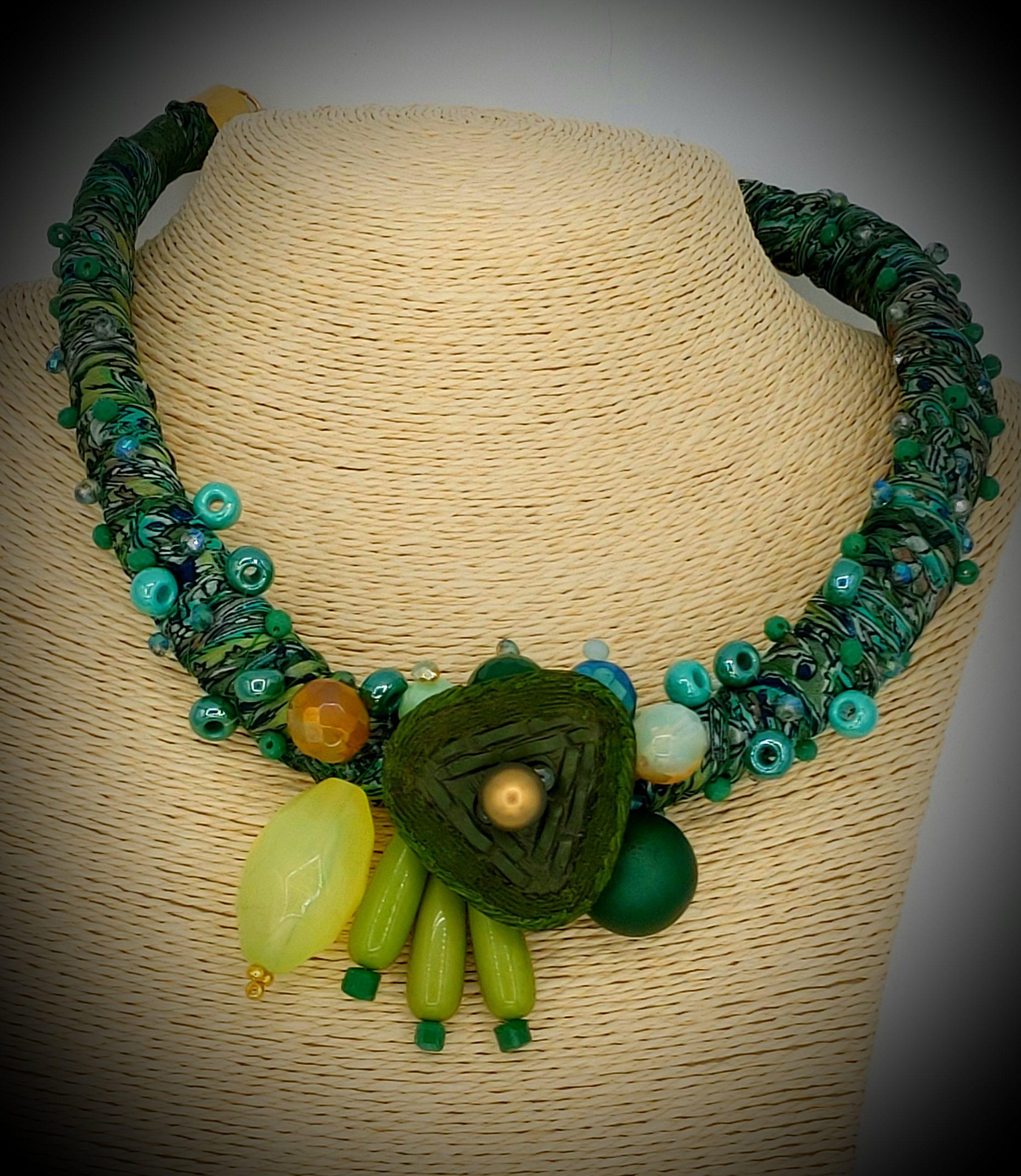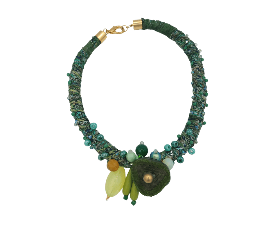 Necklace made of Indian silk fabric twisted with various types of yarns. Sewn beads of various kinds and materials. Lobster clasp closure. A unique work of art made by Eva Zuccolo