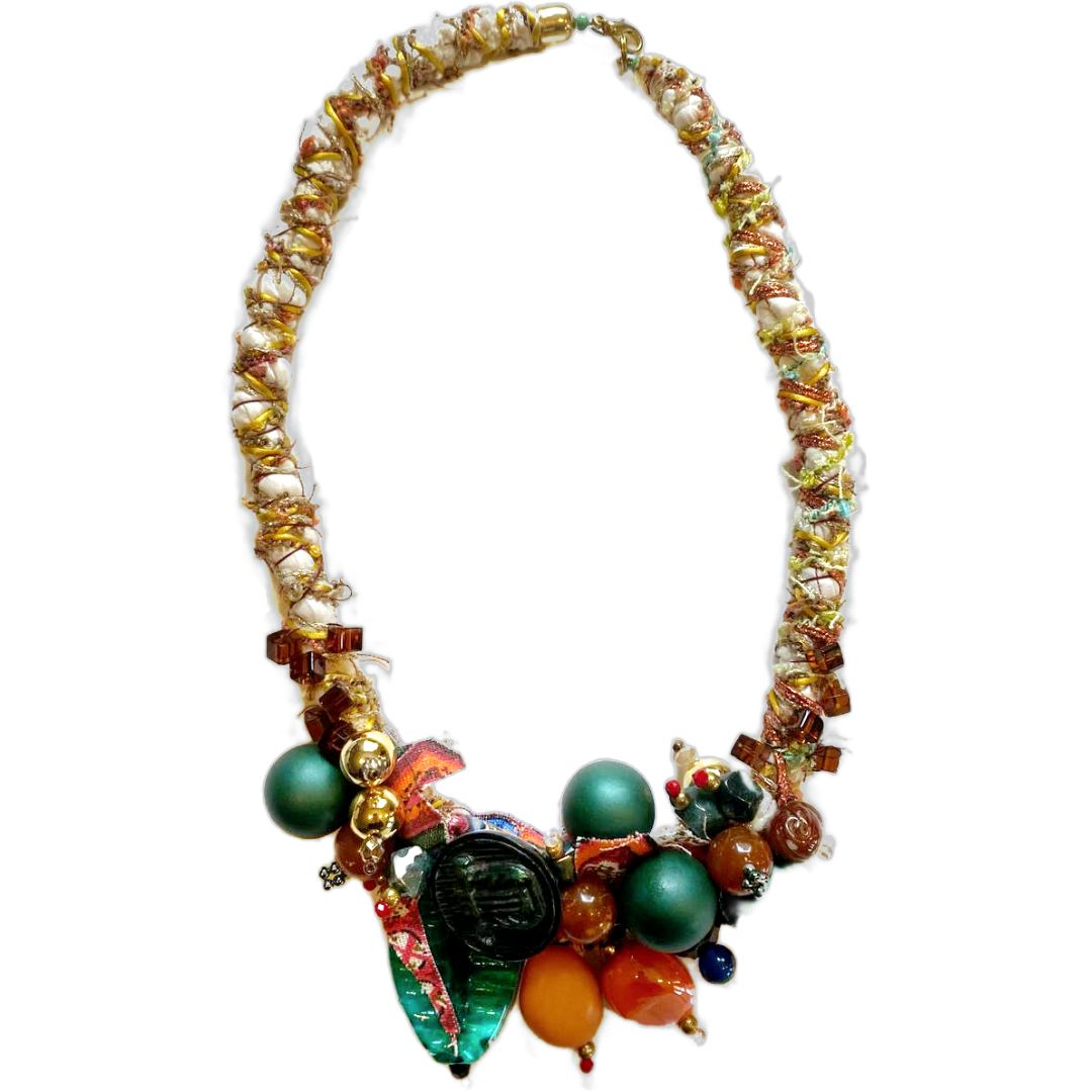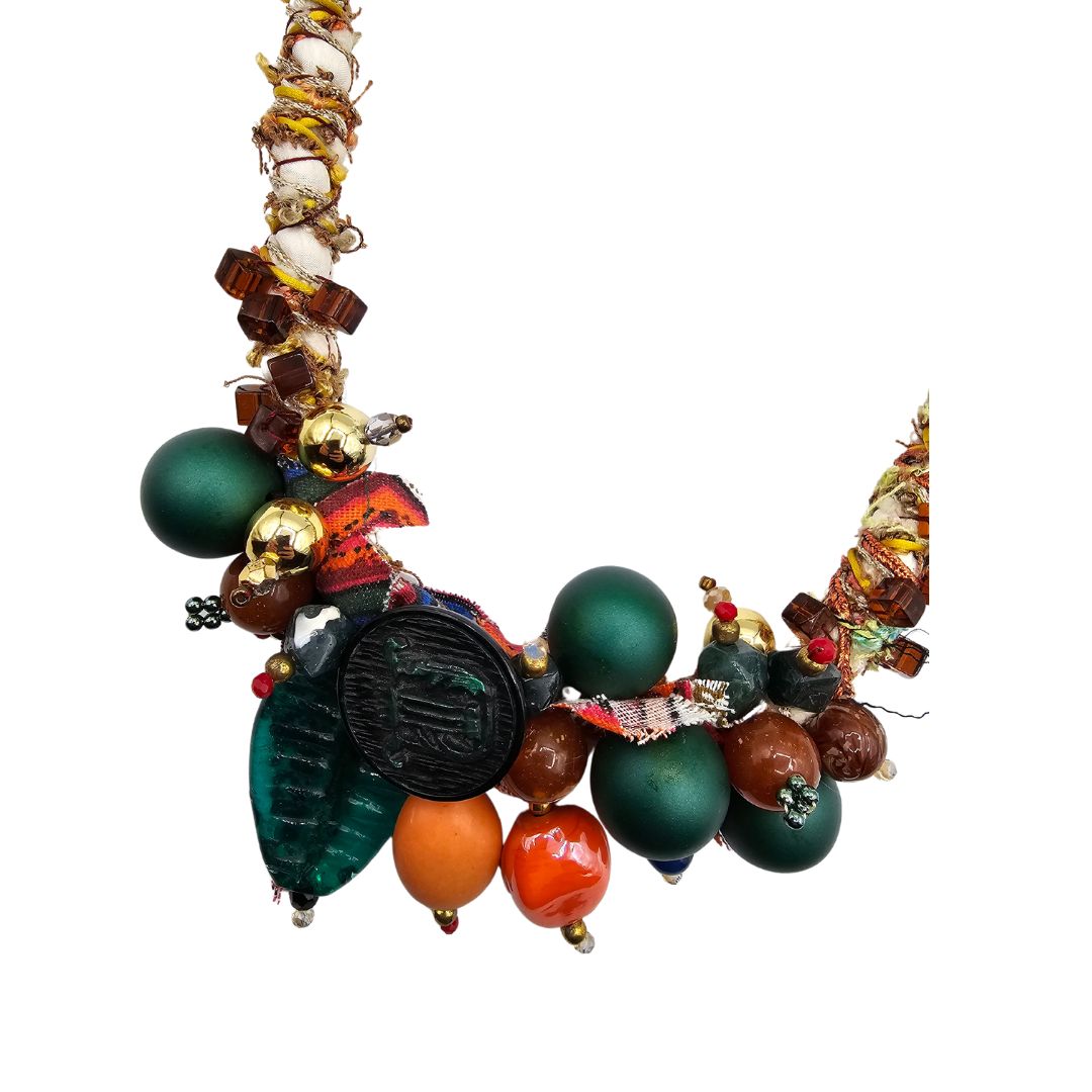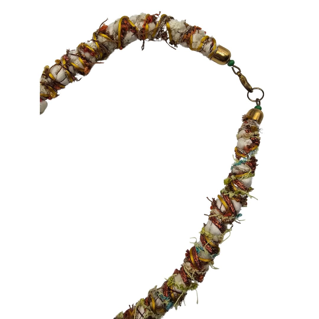 Necklace made of fabric twisted with various types of yarns. Sewn beads of various kinds and materials. Lobster clasp closure. A unique work of art made by Eva Zuccolo