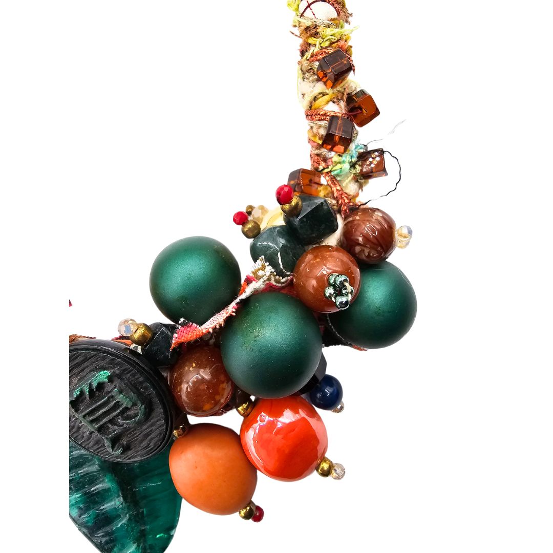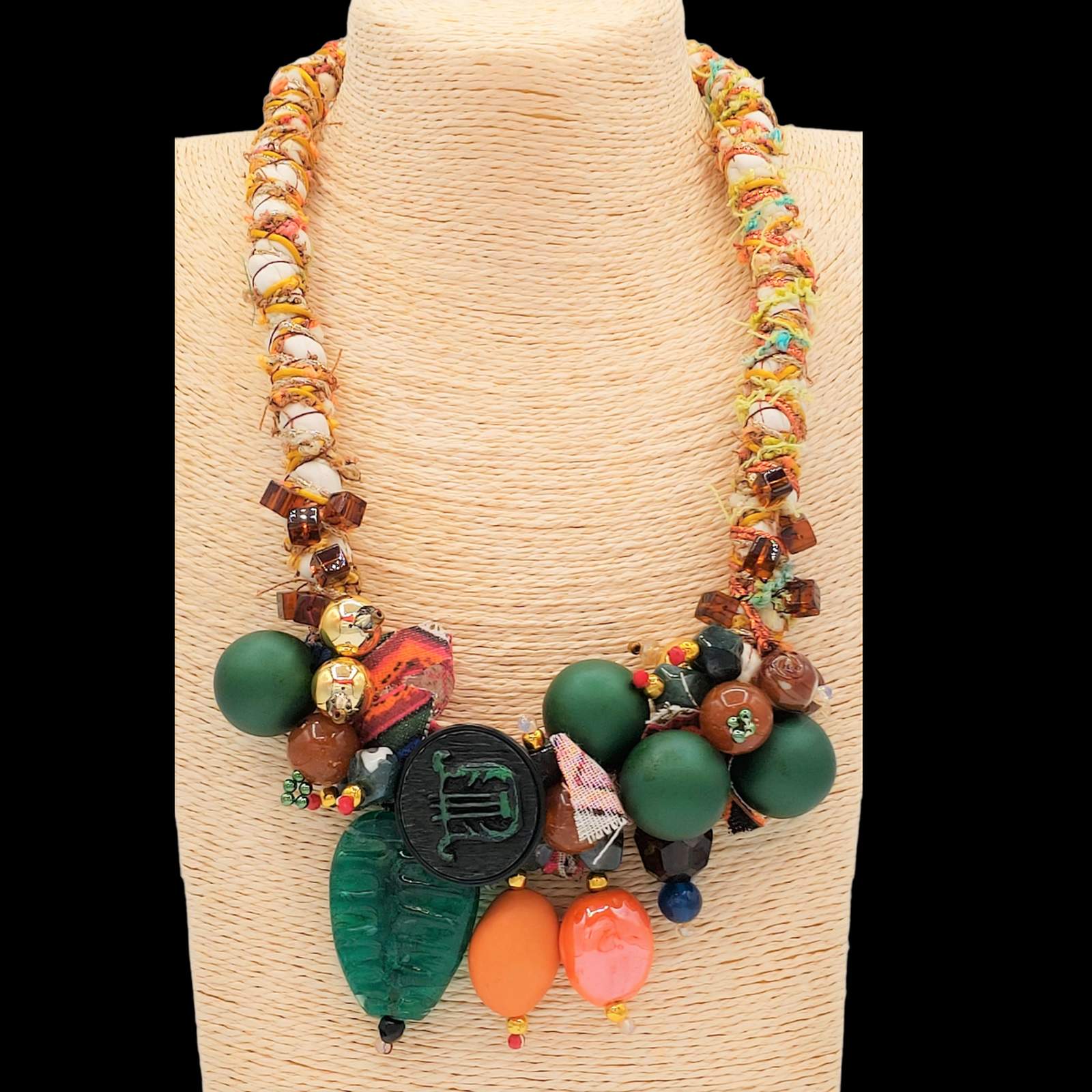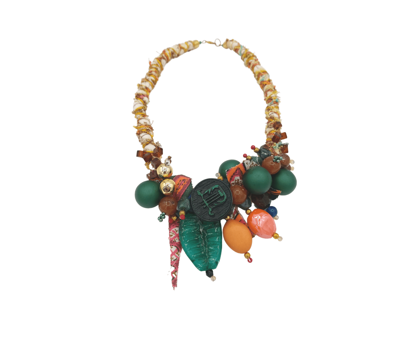 Necklace made of fabric twisted with various types of yarns. Sewn beads of various kinds and materials. Lobster clasp closure. A unique work of art made by Eva Zuccolo