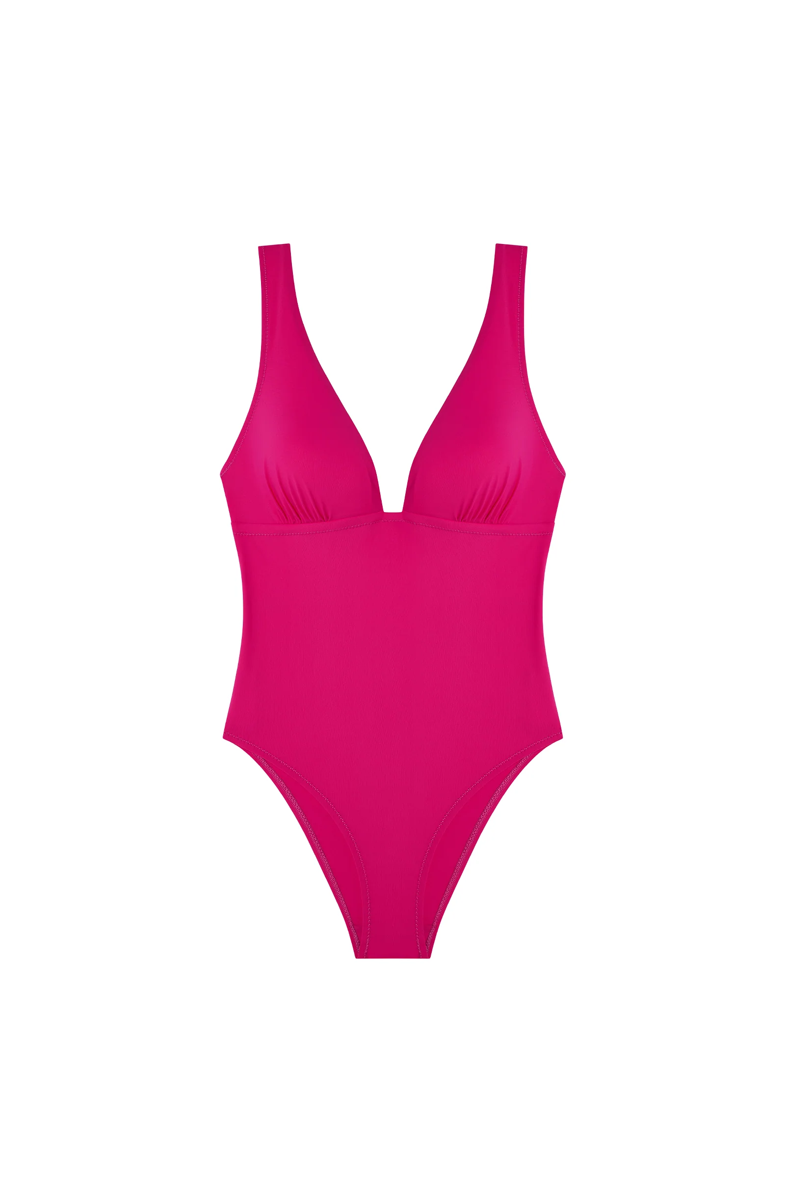 In a modern and bold style, the ARES swimsuit reinterprets the classic racer. At the front, the V-neckline enhances the décolleté. Its wide straps, worn over the shoulders, drape across the lower back around a golden zamak ring for a pleated effect of great elegance. Raspberry, a glowing, deliciously sweet pink.