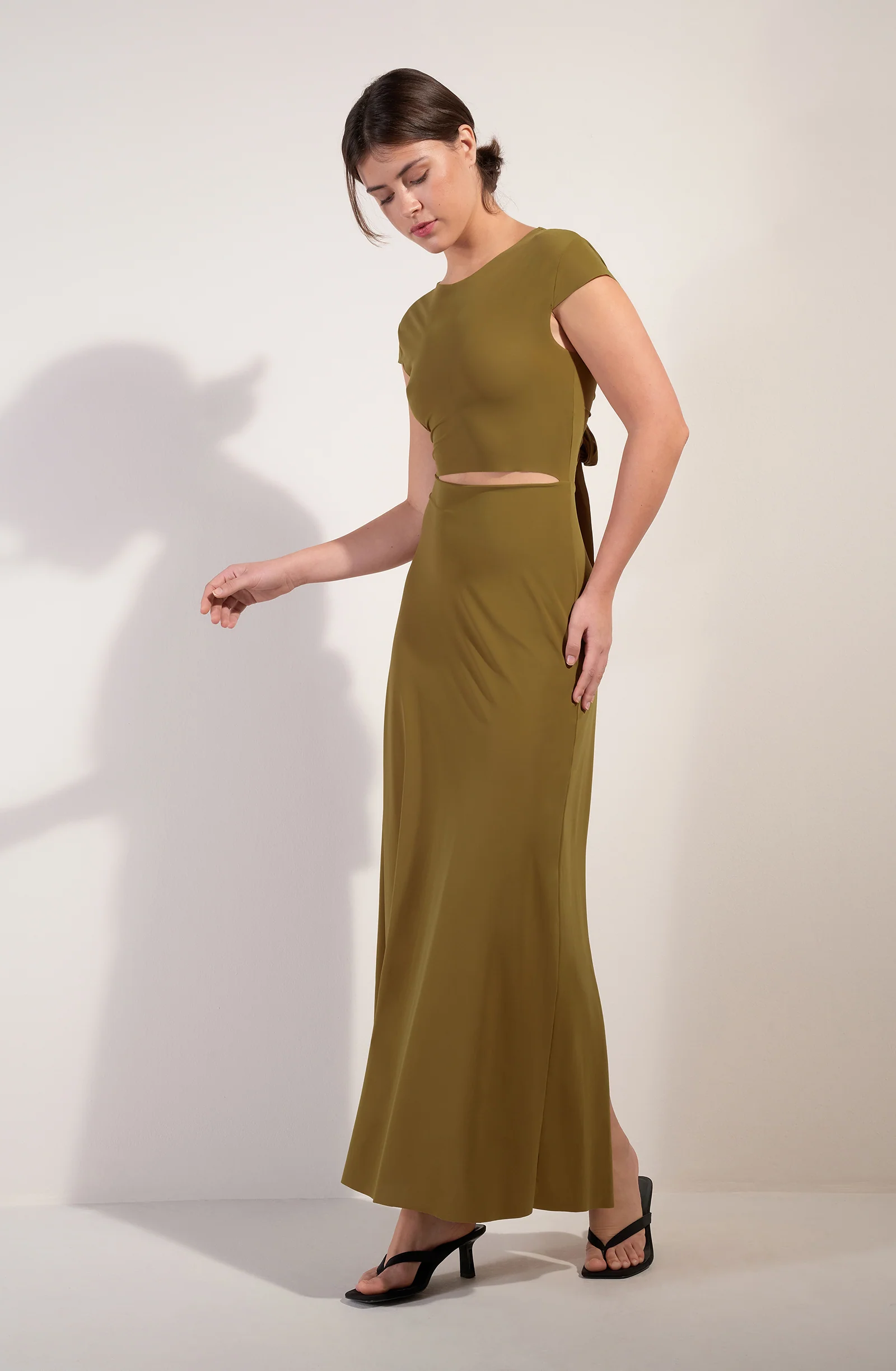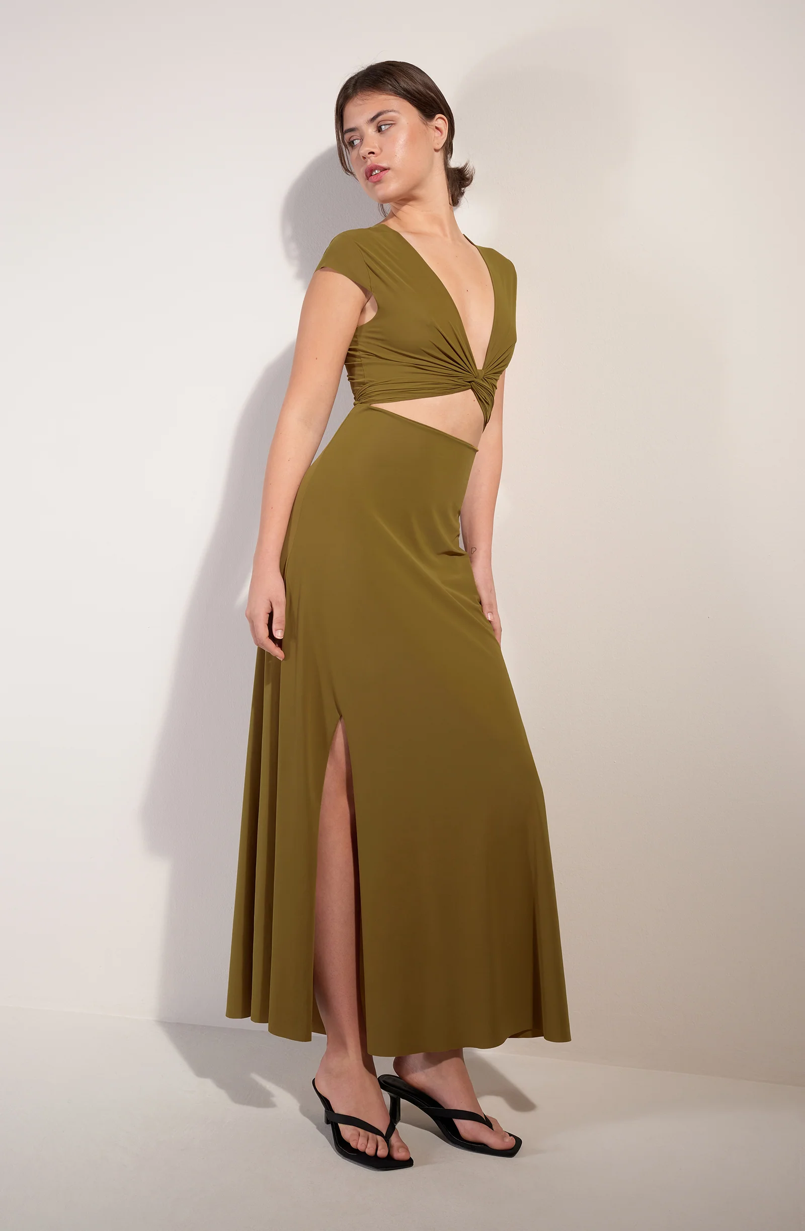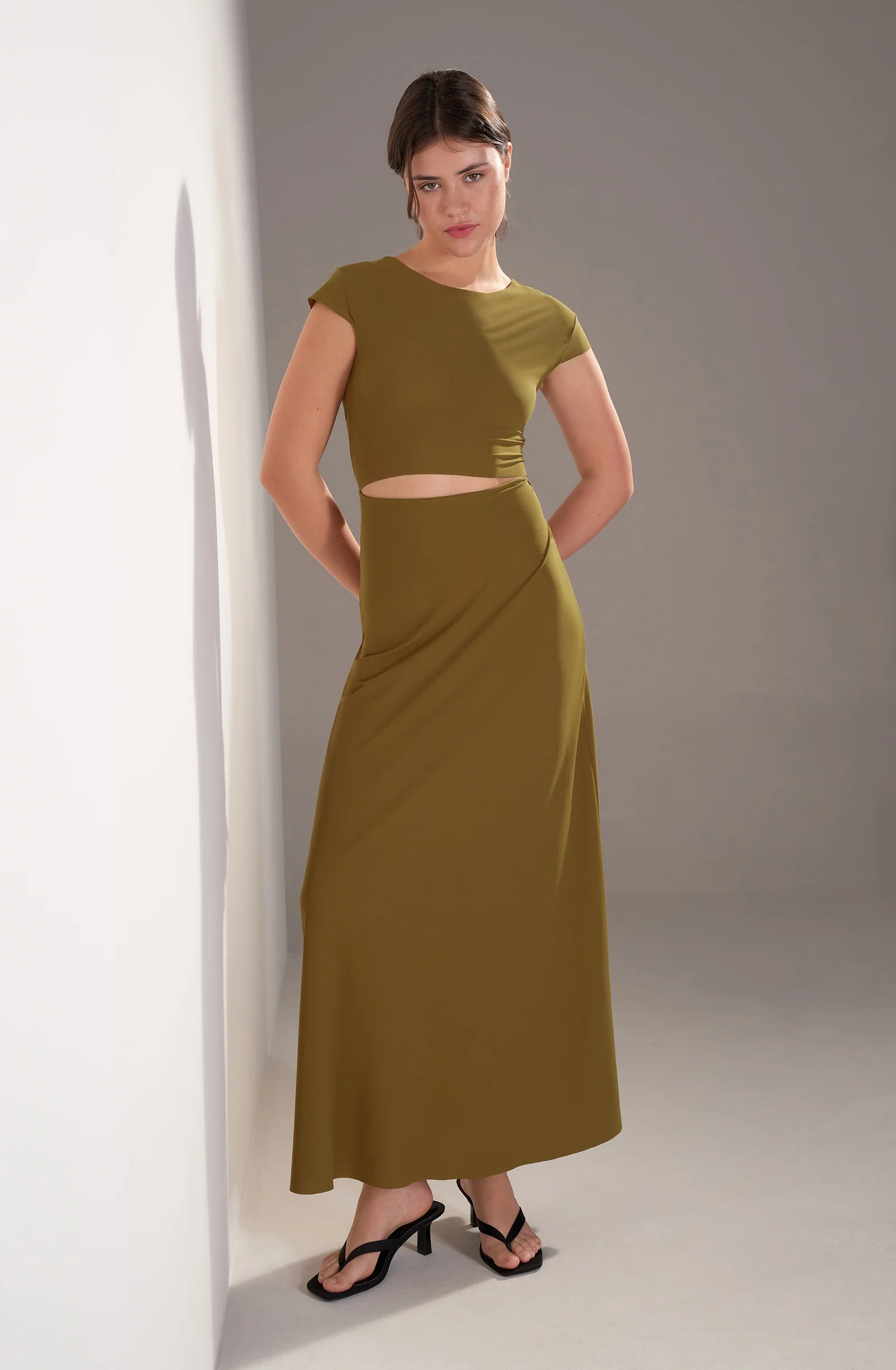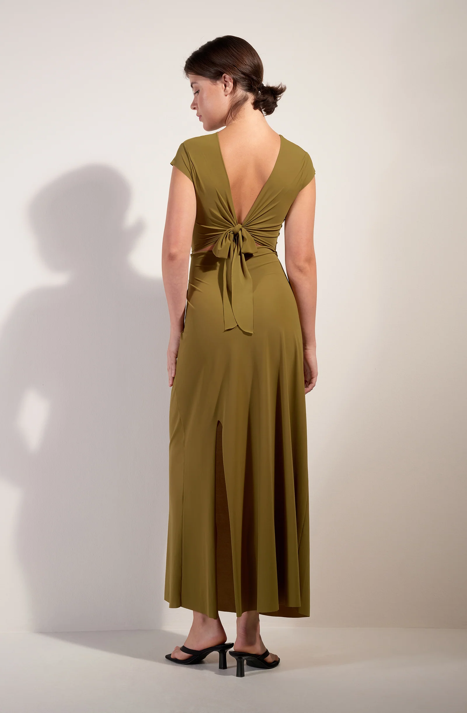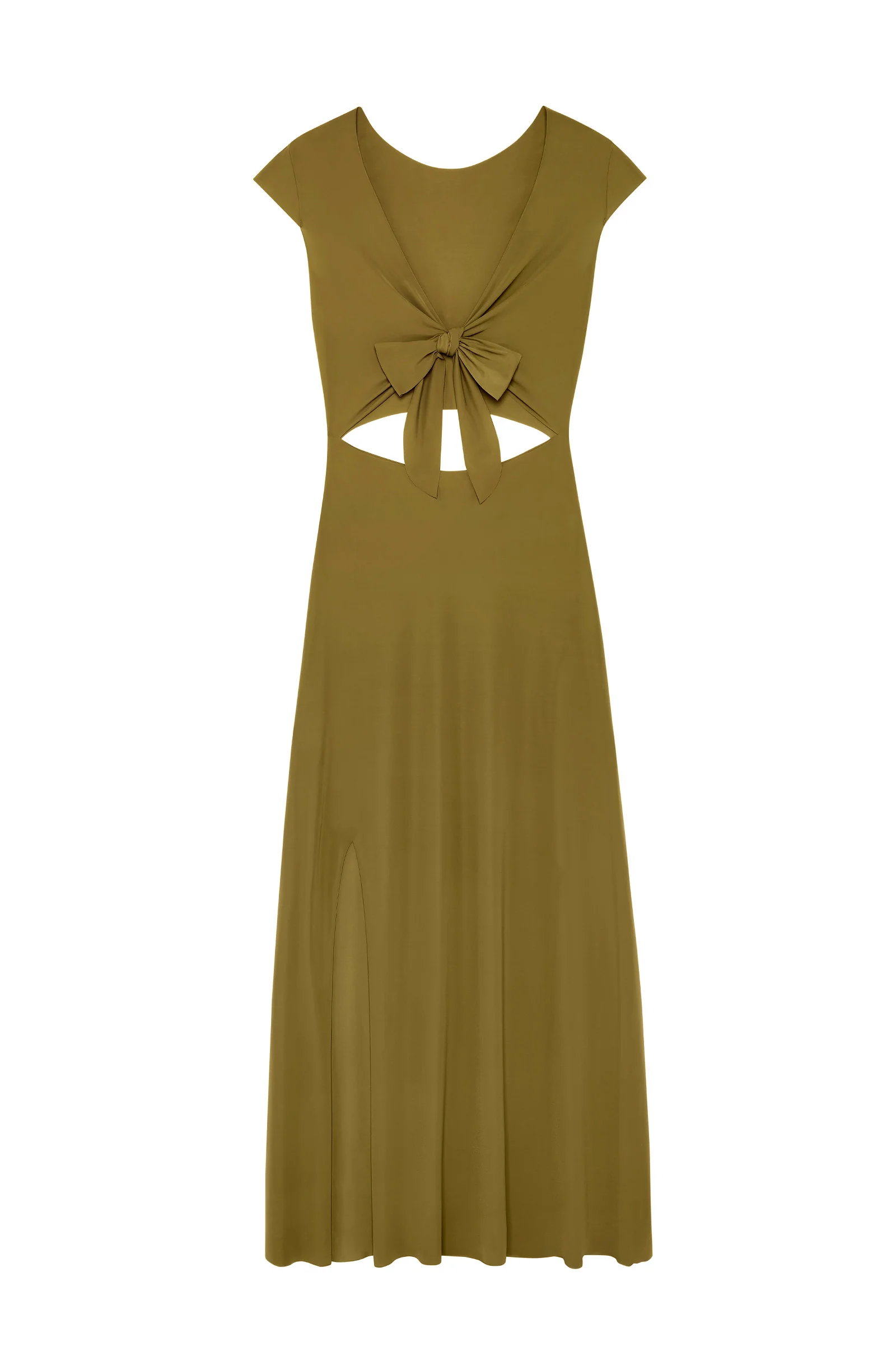 The long and flowing dress KOLIL combines a crop top and a straight skirt for a slender silhouette. Very light, it can be worn either front/back and can be tied in many different ways. Subtle play with necklines, it can change your style according to your wishes. Bronze, an authentic mineral shade, a blend of yellow and green.