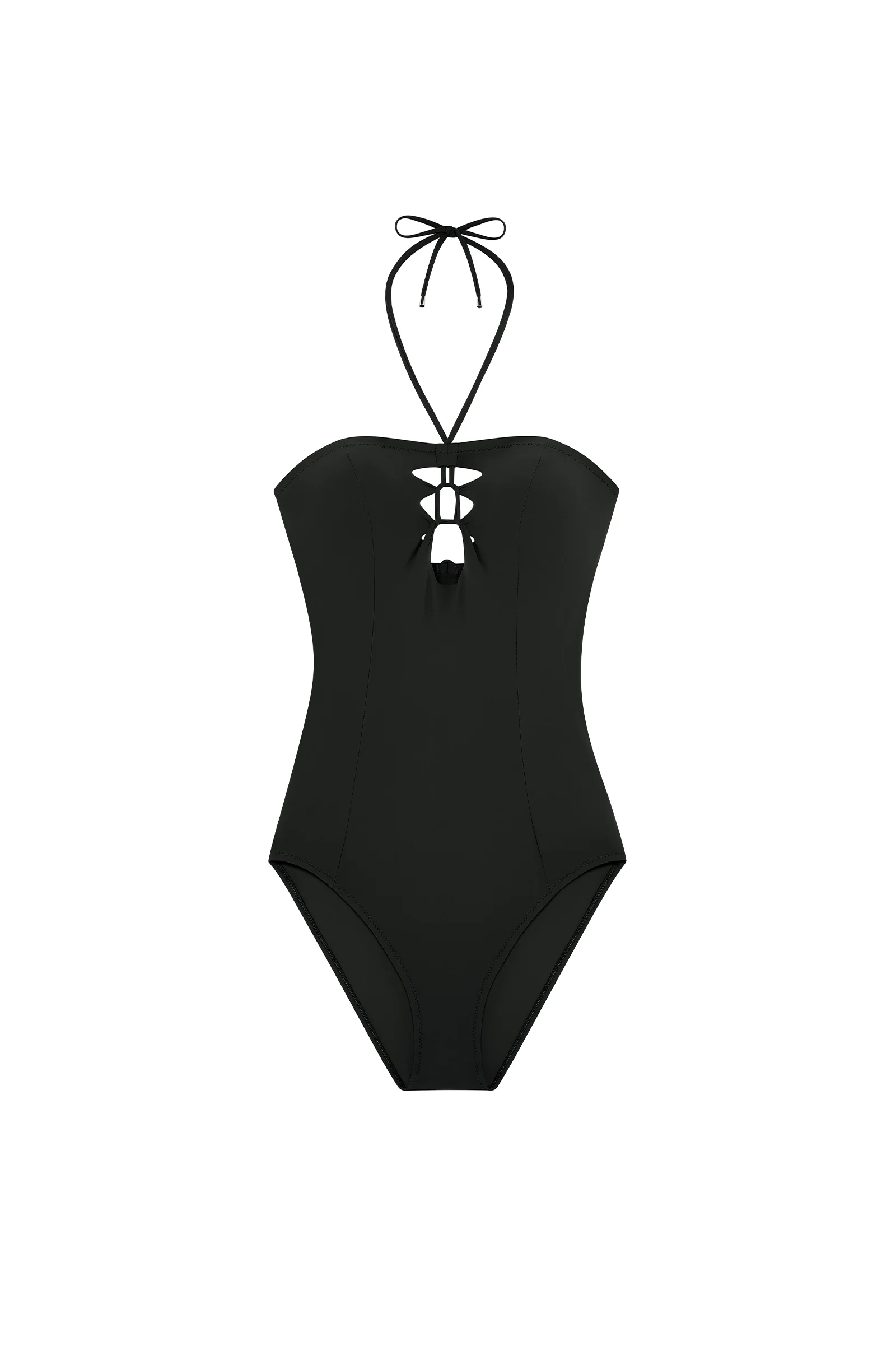 Delicately cut-out at the center and at the back, the LALIA bandeau one-piece swimsuit offers a sophisticated look. The Lycra, with raw-cut edges, intertwines in a macramé style. At the front, the princess seams refine the figure and add depth to the neckline. With its removable straps, this couture swimsuit is a remarkable graphic piece. The timeless black color is always elegant.