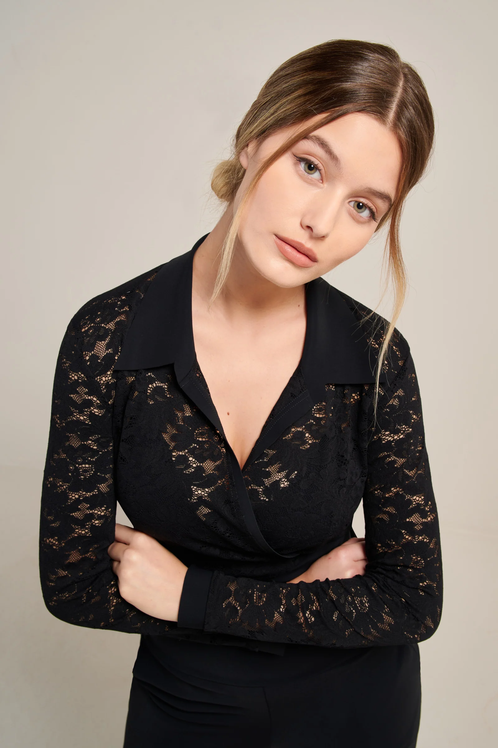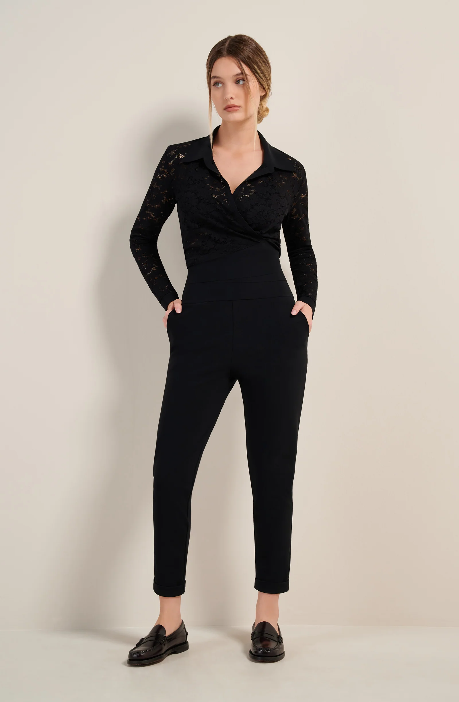 With its Bonded collar and cuffs, the lace wrap top LIHO looks like a blouse. Its wide belt can be easily tied and adjusted at the waist. Black, a timeless and always elegant colour.