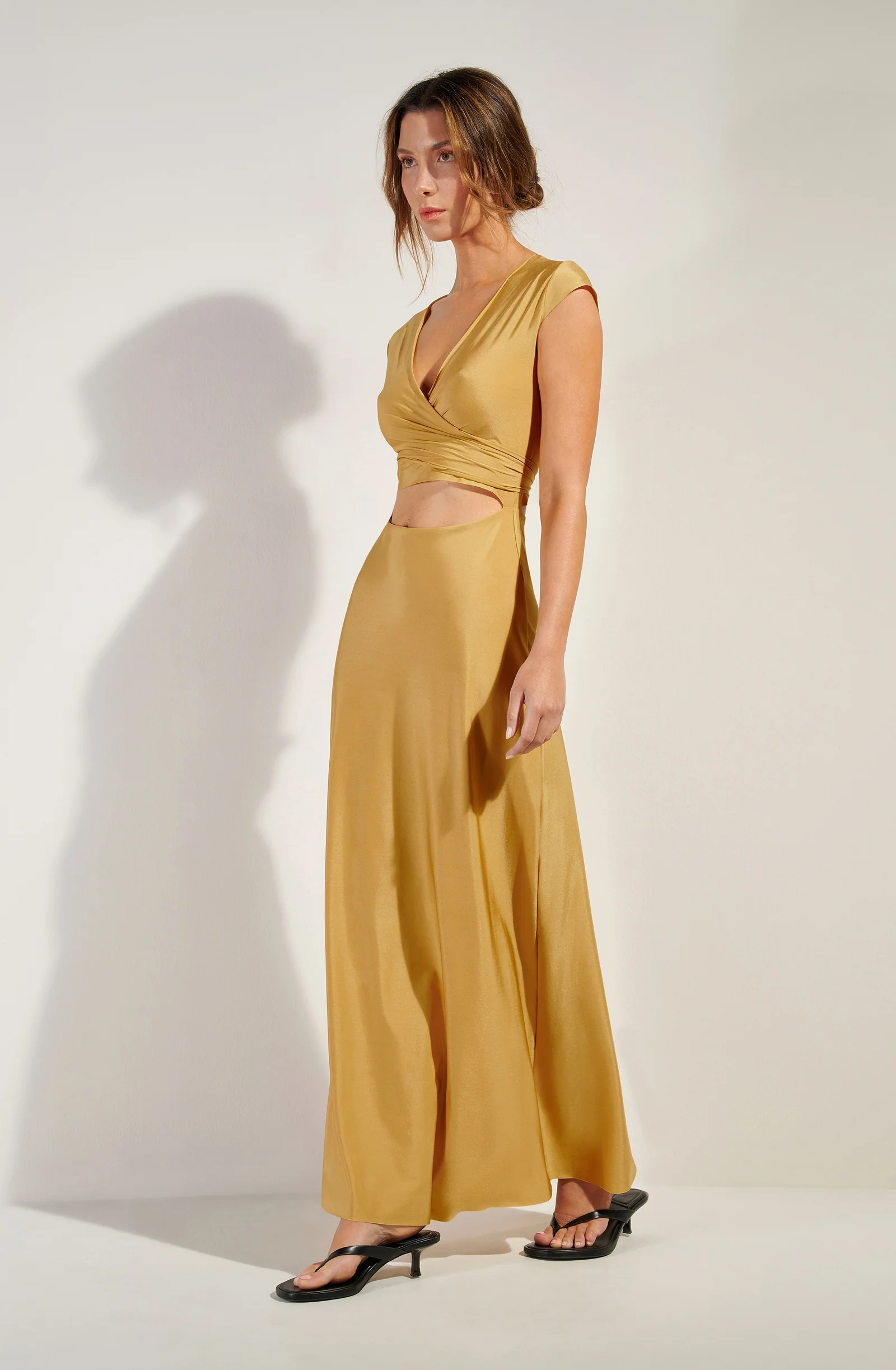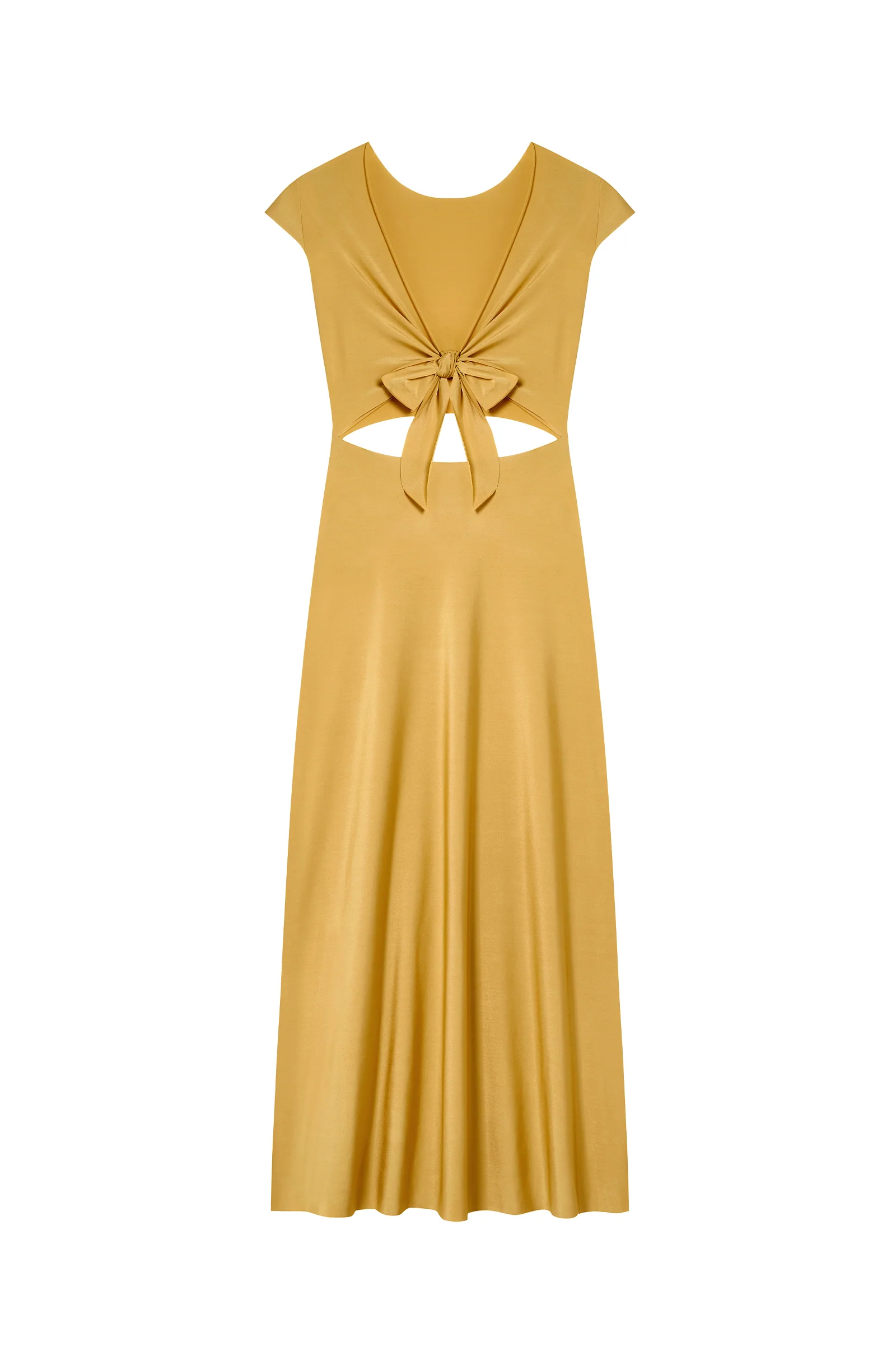 The LIL long, fluid dress combines a crop top and straight skirt for an elongated silhouette. A creative piece with a couture spirit, it can be worn front-to-back and tied in multiple ways to play with the neckline and celebrate femininity. Gold, a sunny golden yellow.