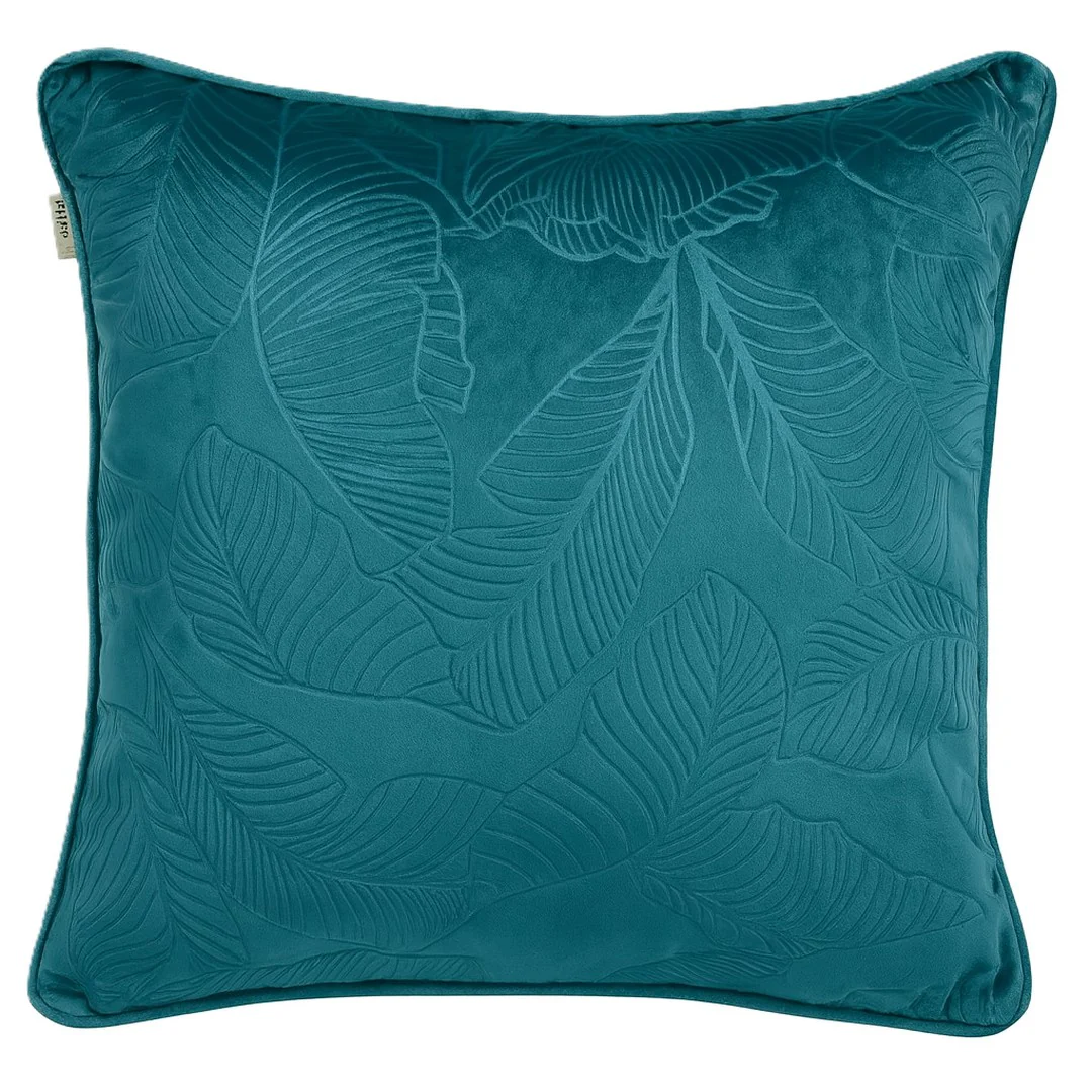 Fodera decorativa in velluto teal con elegante motivo fogliare in rilievo.