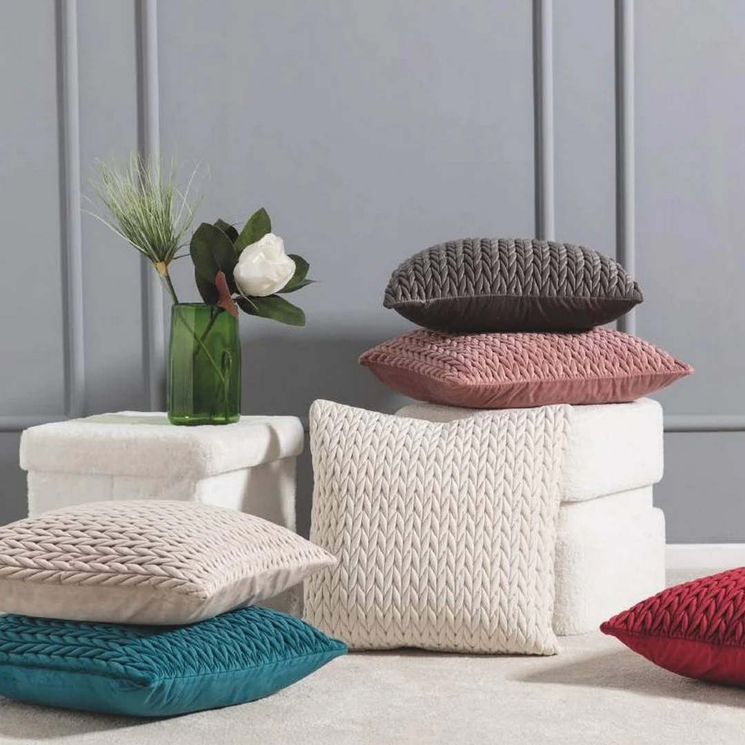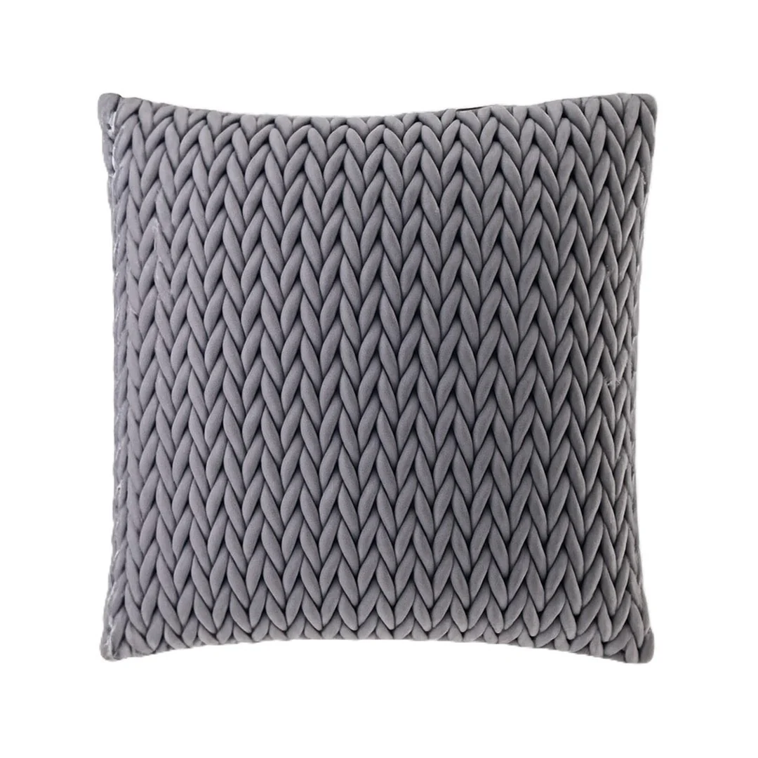 Fodera per cuscino arredo elegante in velluto trapuntato con motivo intrecciato, pensata per aggiungere lusso e raffinatezza a divani, poltrone e letti.