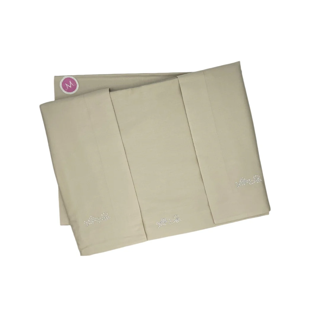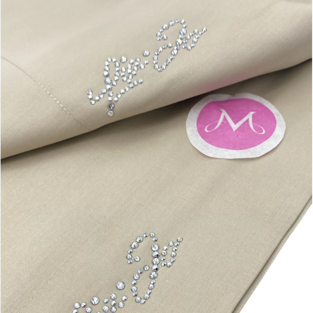 Lenzuolo sopra: 260×290 cm, decorato con il logo Liu Jo in cristalli Swarovski, un tocco glamour che aggiunge luminosità e raffinatezza.
