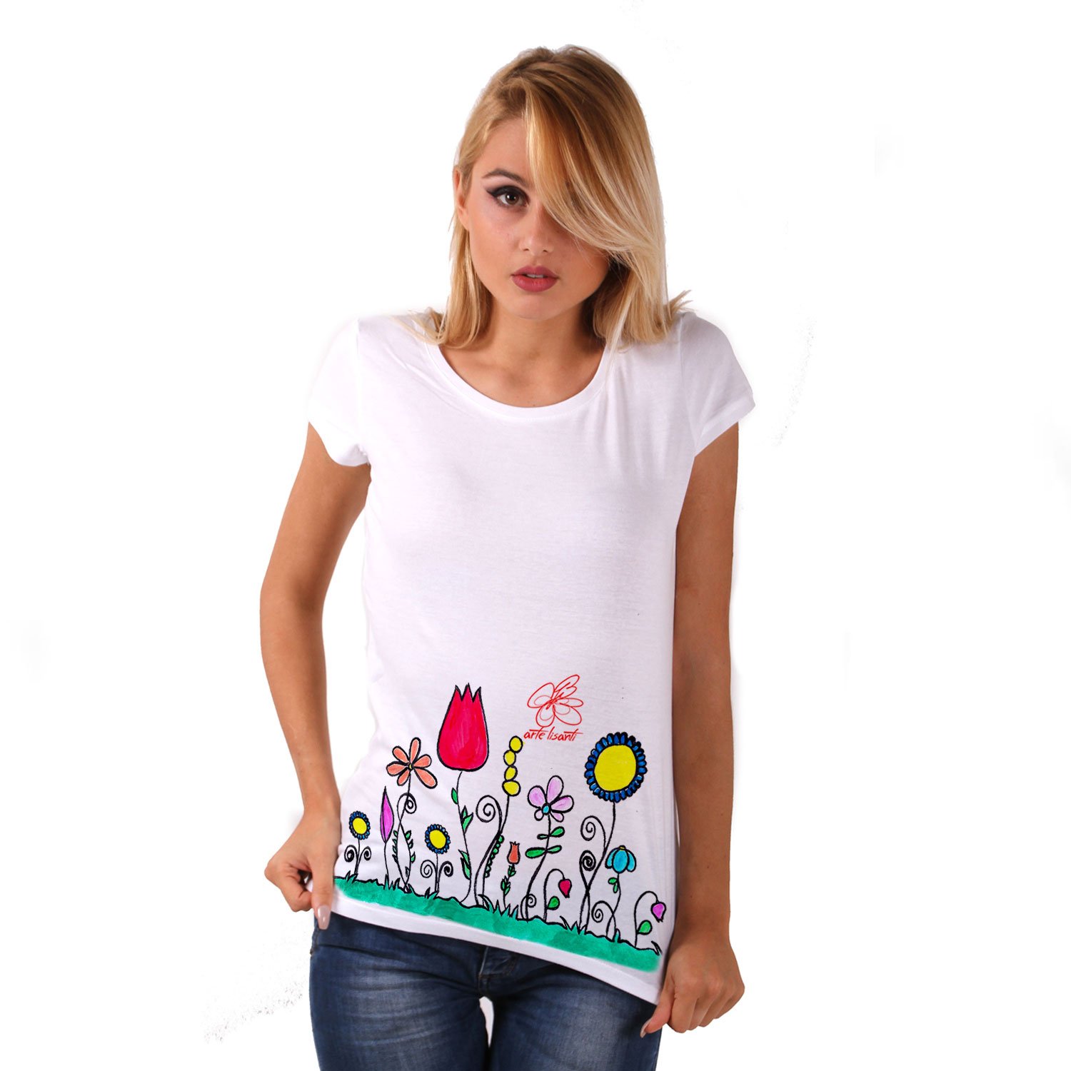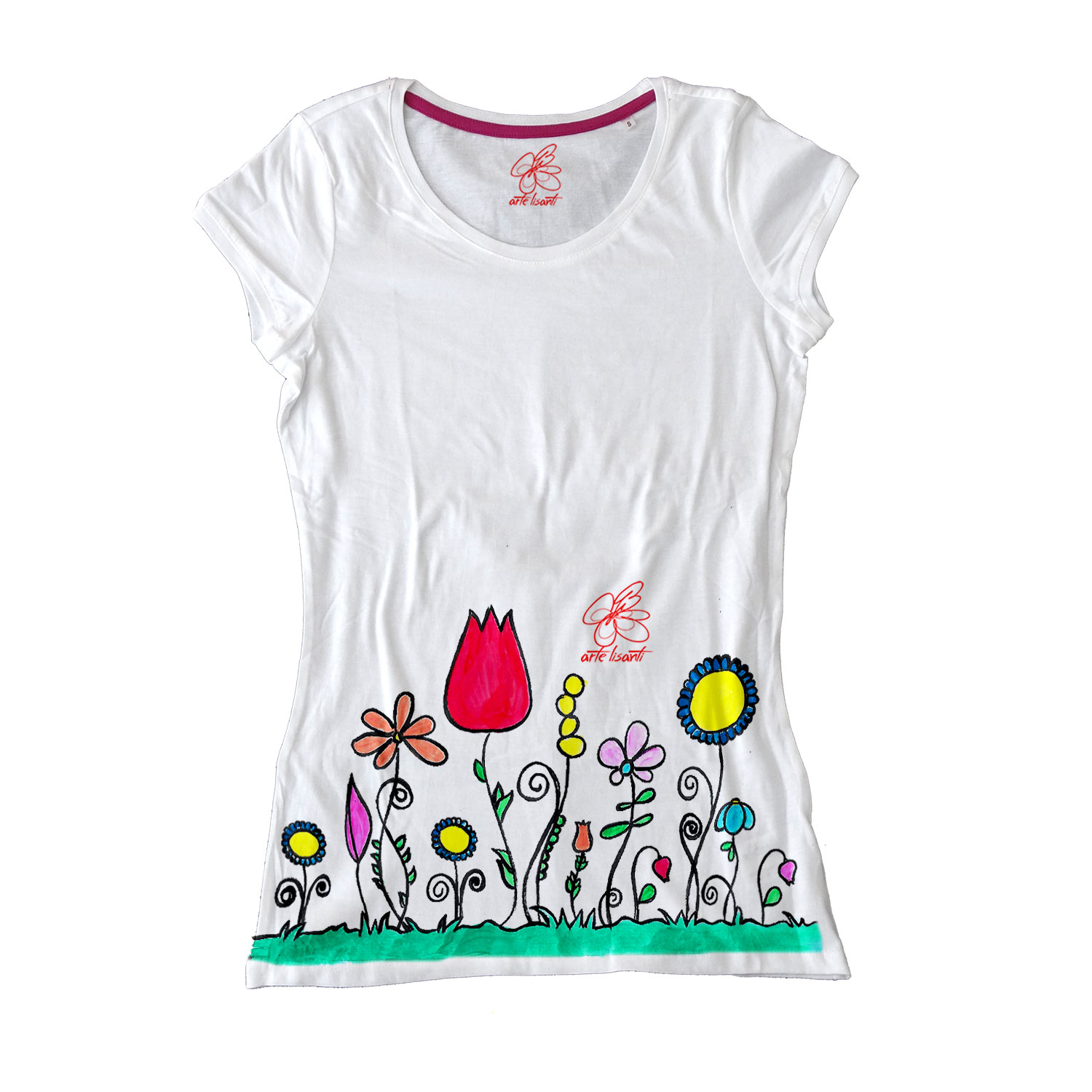 Maglietta dipinta a mano – Fiori naif: una splendida maglietta con dipinti a mano artigianali dei fiori in stile naif. Rappresentano con semplicità e candore fiori comuni della vita quotidiana, che divengono visione poetica e magica della realtà.