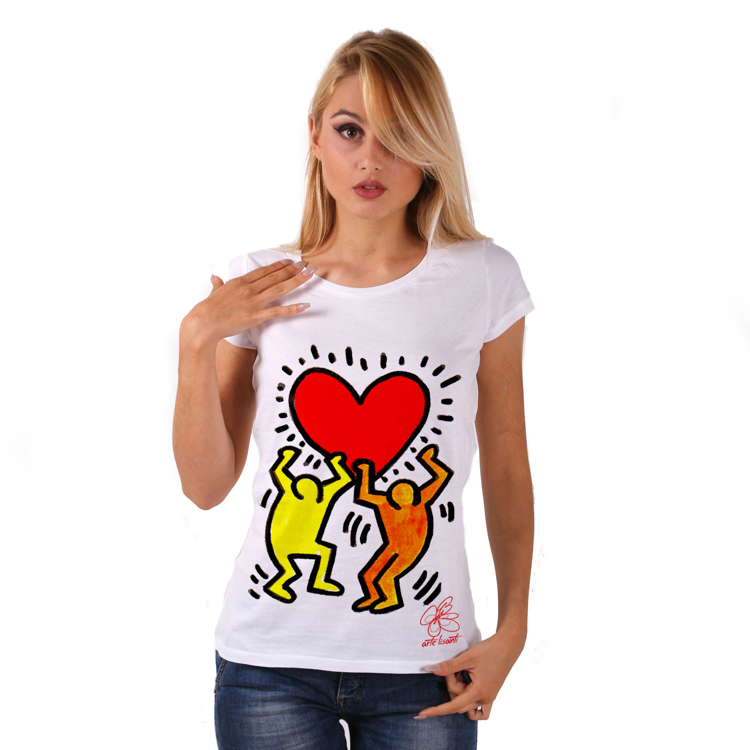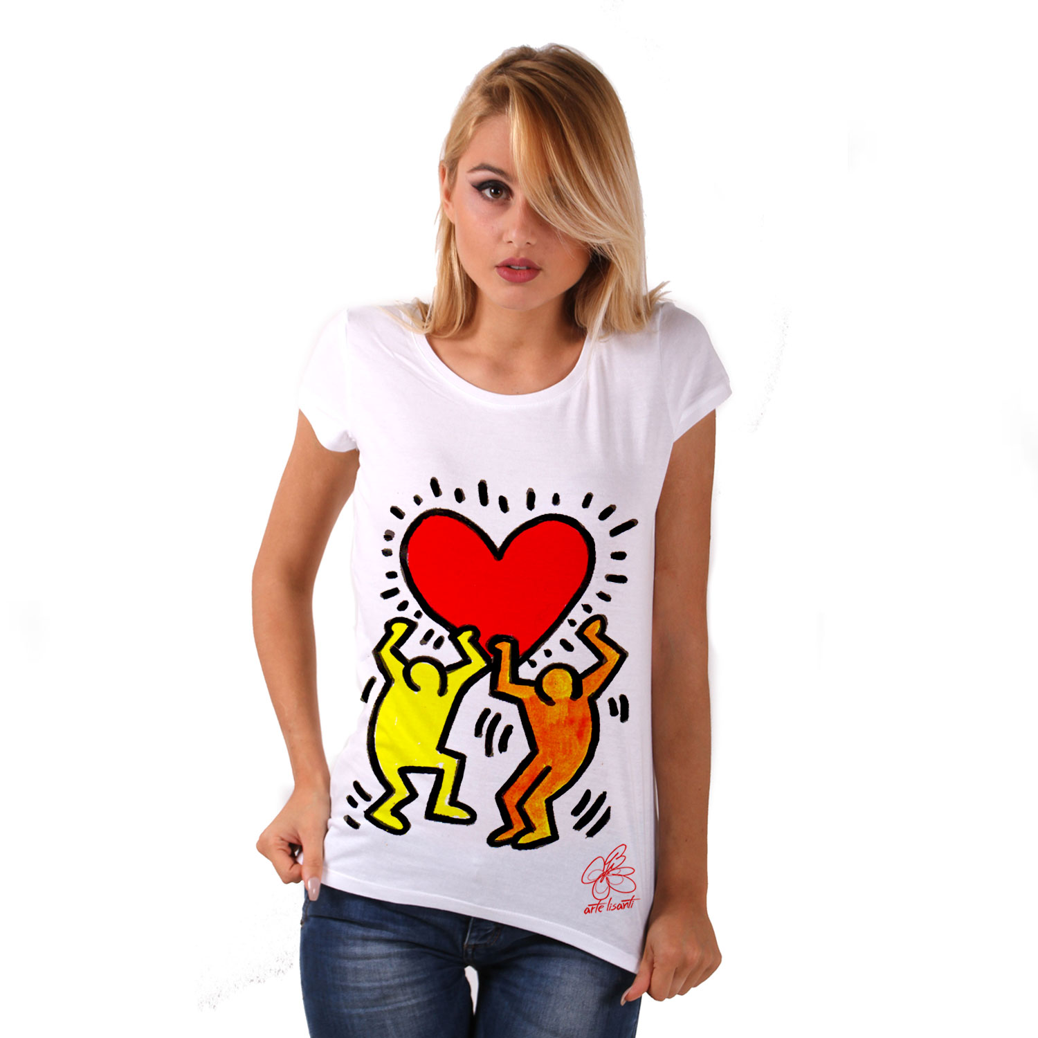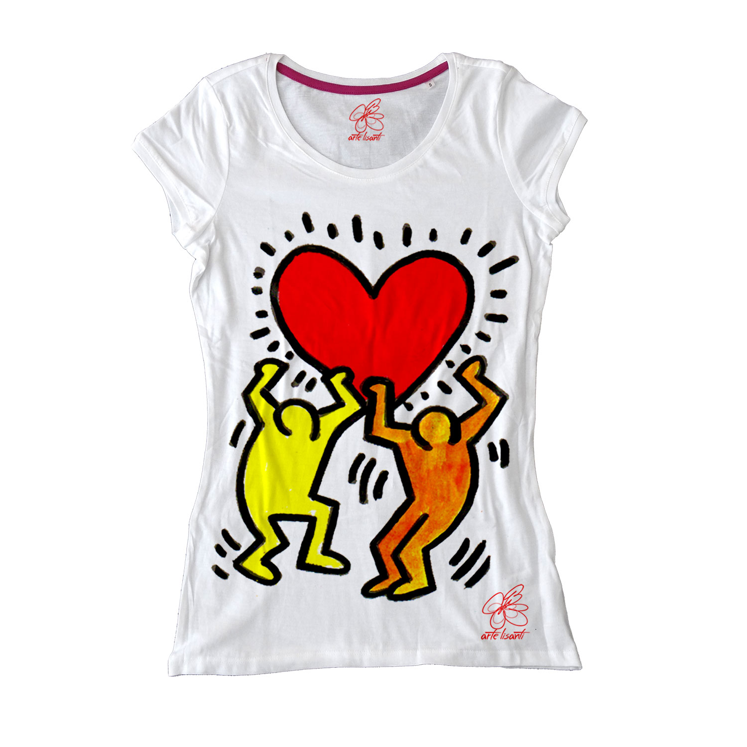 Maglietta dipinta a mano – Omaggio a Keith Haring: si rende omaggio ai famosi omini stilizzati dell’autore contemporaneo con colori brillanti dai toni pop!
