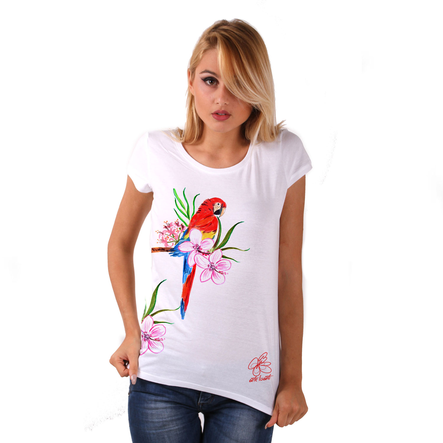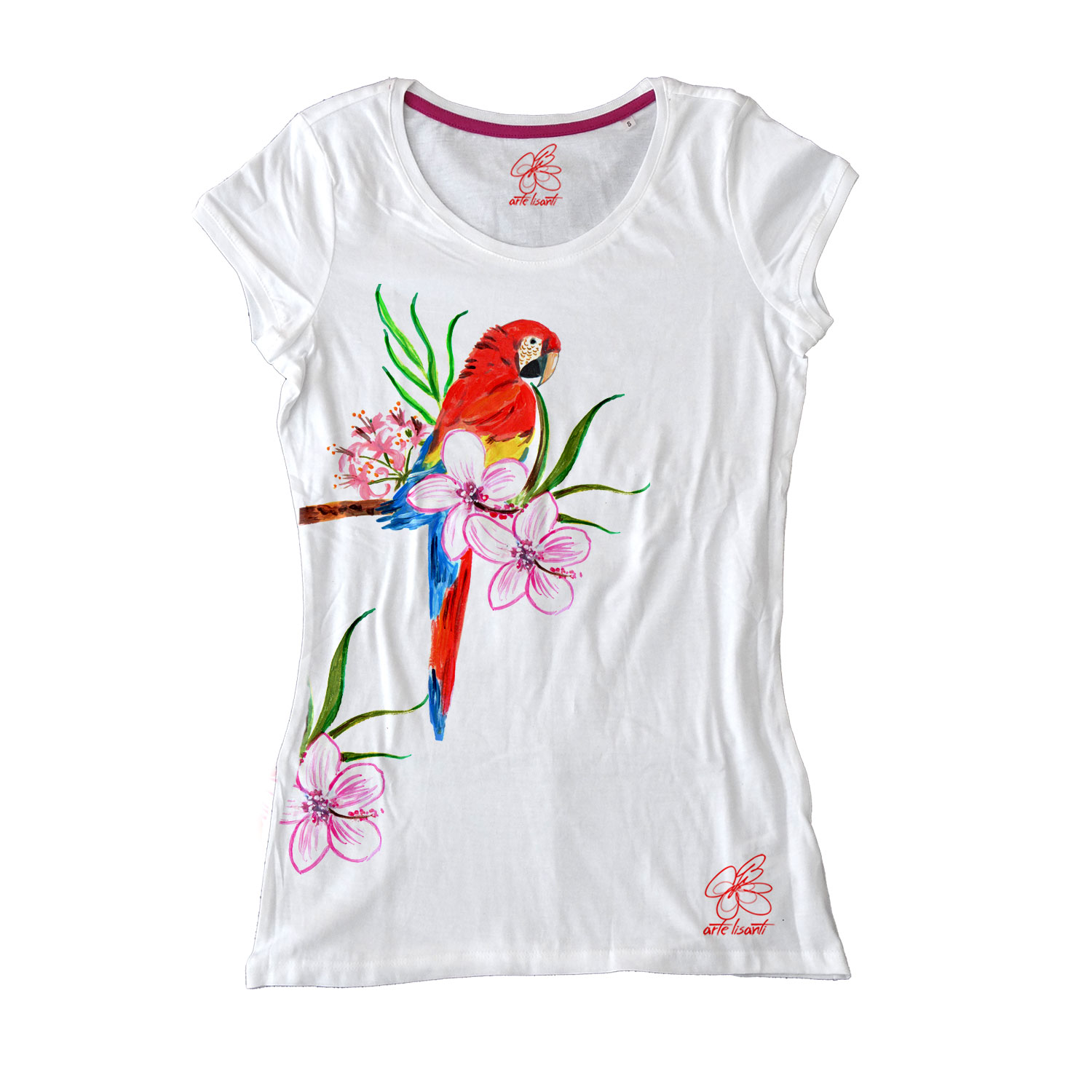 Maglietta dipinta a mano – Red parrot: Tropical effect con fiori tropicali e un colorato ed esotico pappagallo.