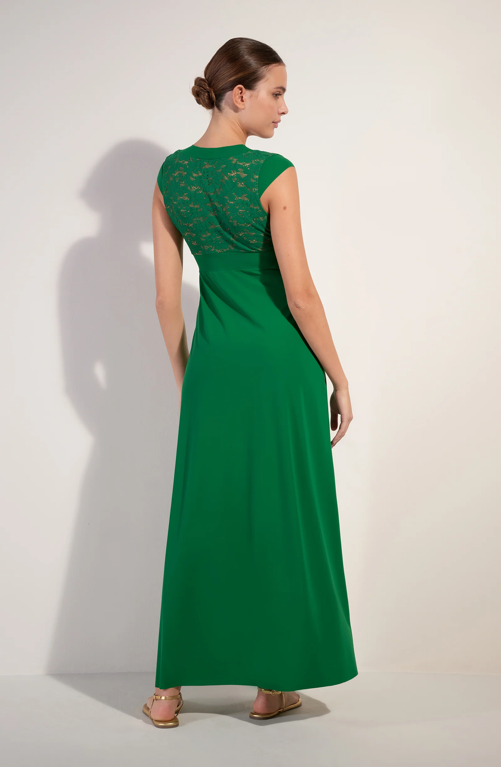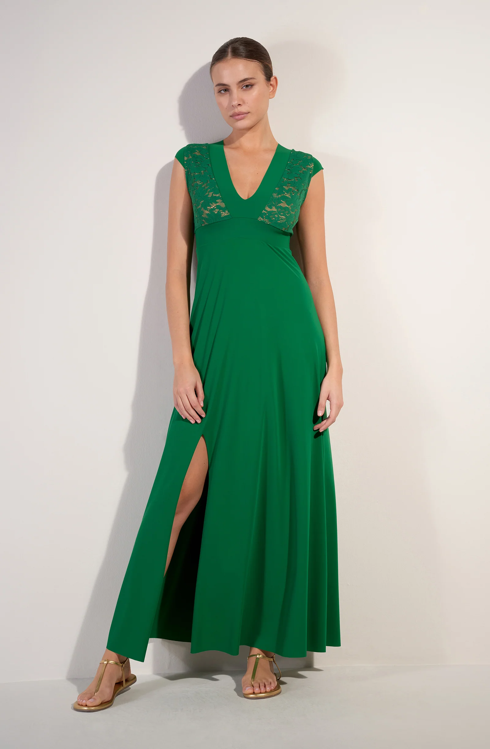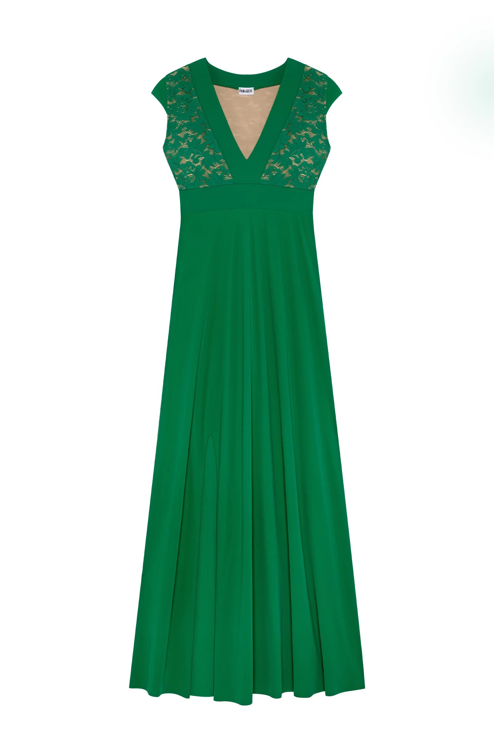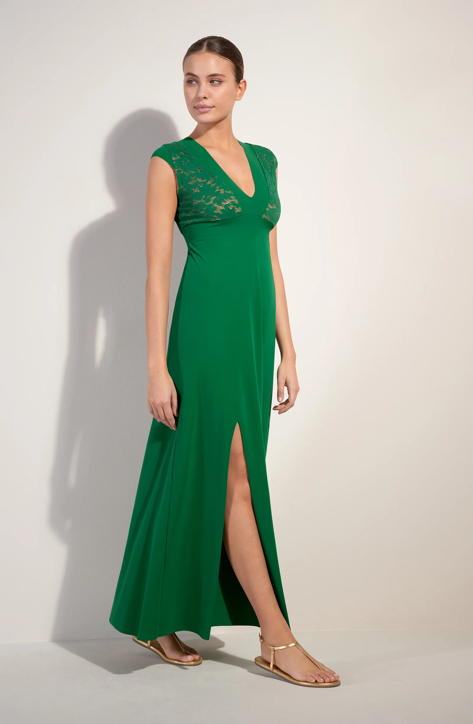 Long dress with side slit French lace V-neckline Neckline and underbust band in bonded fabric Cups and back lined with nude tulle Body and sleeves in Sensitive fabric 97% polyamide, 3% eslastane The studio model is 1.76 m tall and wears size S (Bust: 88 cm, Waist: 63 cm, Hips: 94 cm)