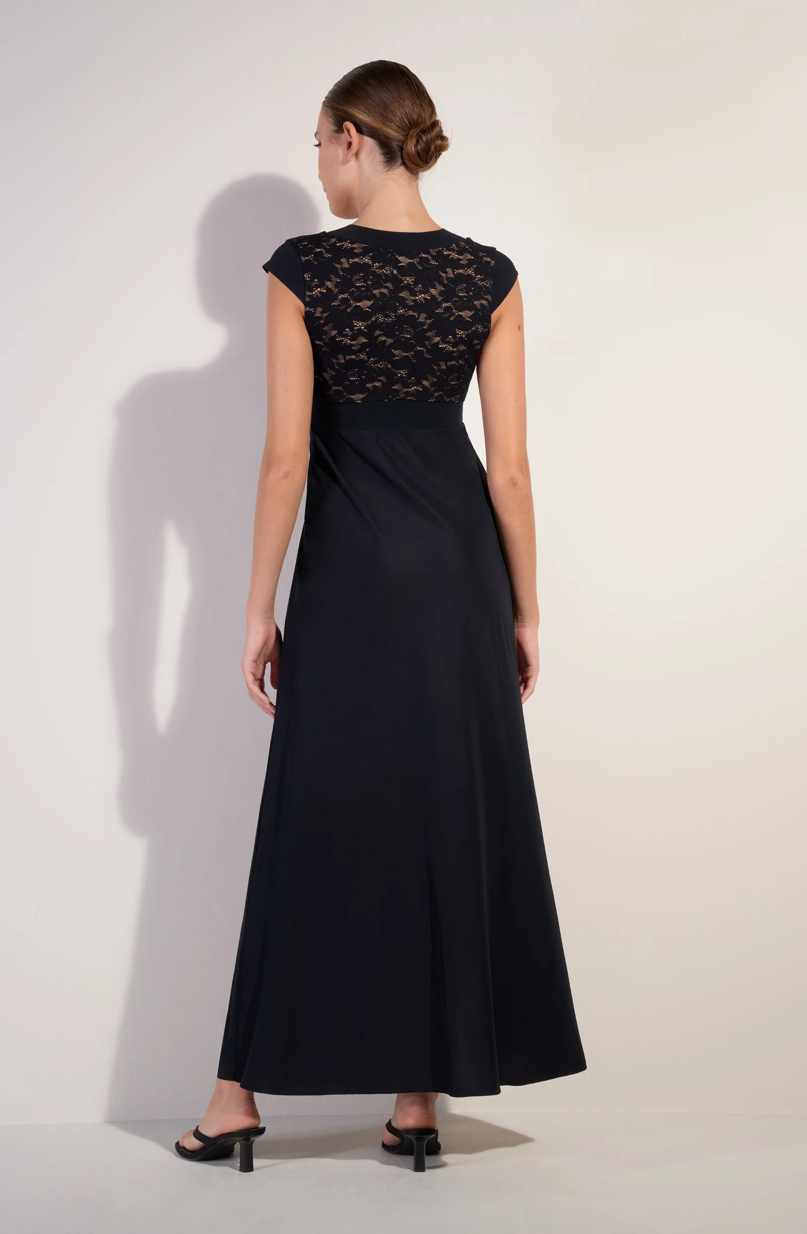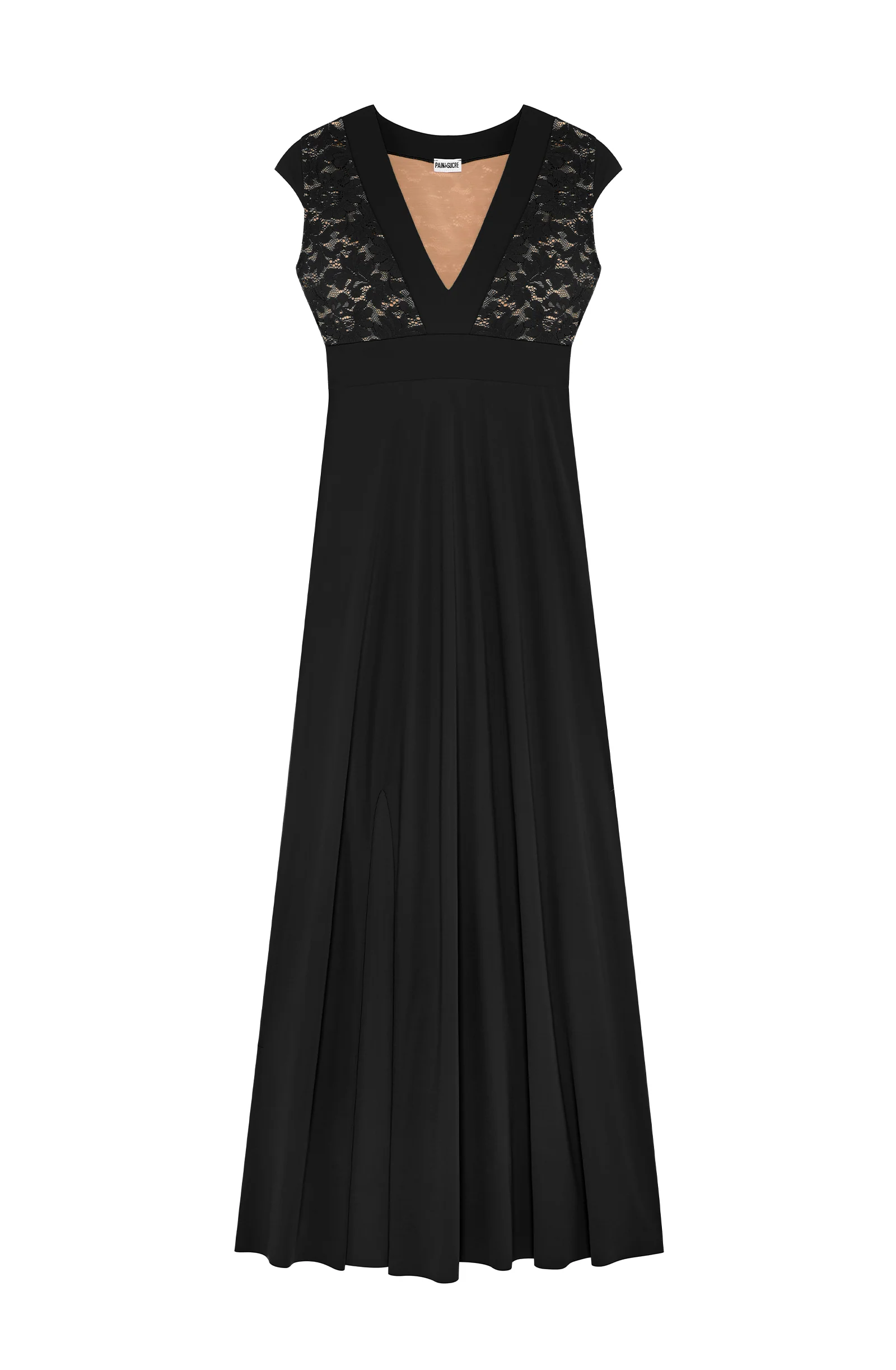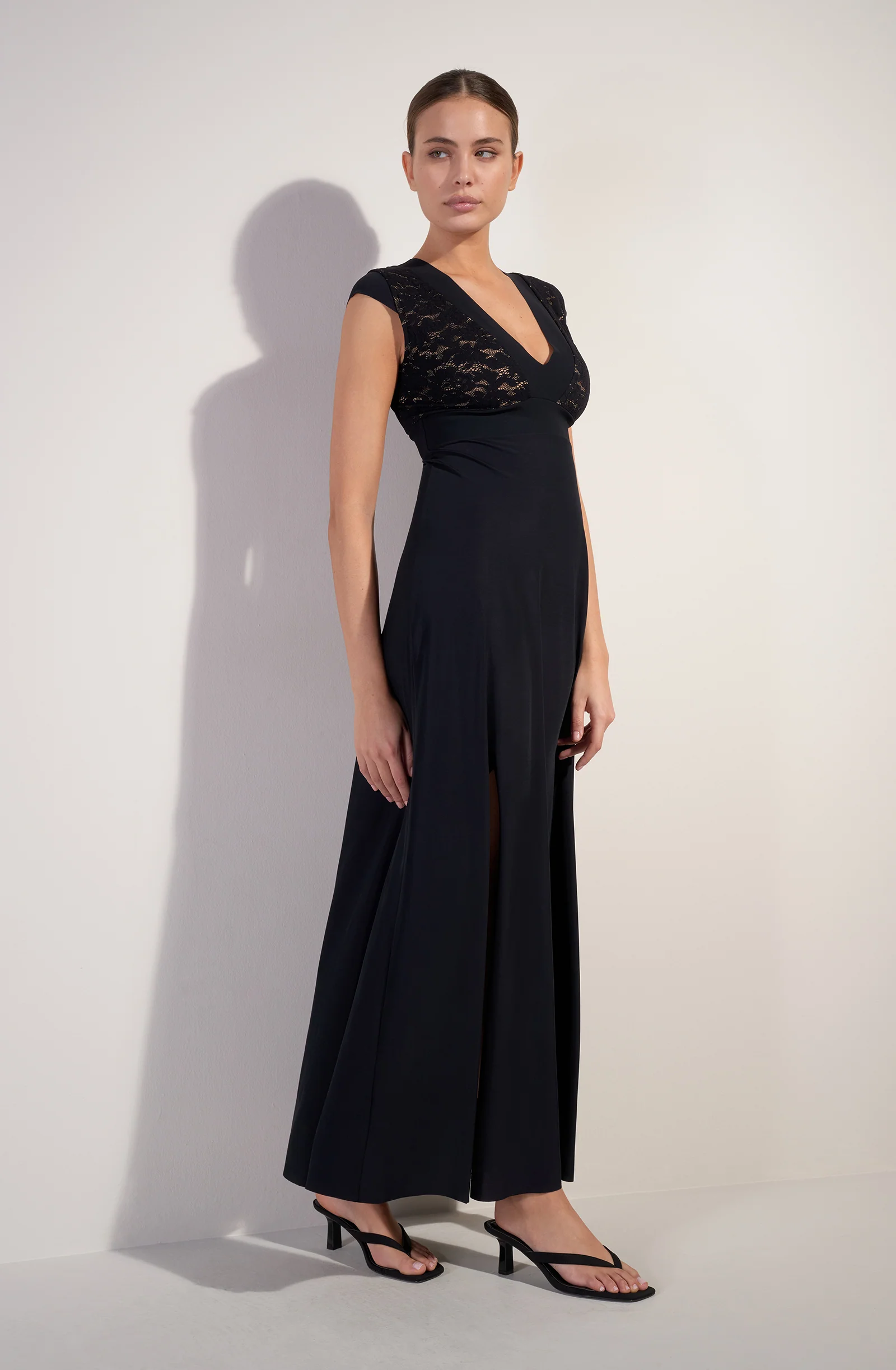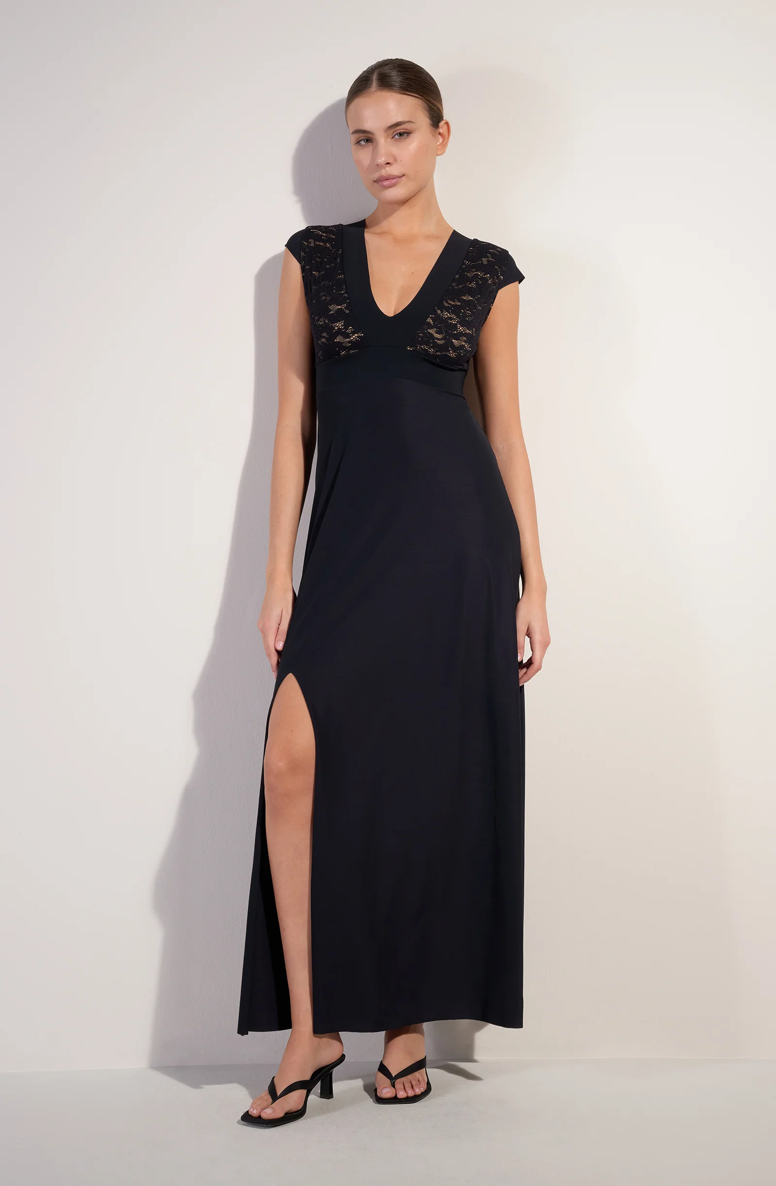 Long dress with side slit French lace V-neckline Neckline and underbust band in bonded fabric Cups and back lined with nude tulle Body and sleeves in Sensitive fabric 97% polyamide, 3% eslastane The studio model is 1.76 m tall and wears size S (Bust: 88 cm, Waist: 63 cm, Hips: 94 cm)