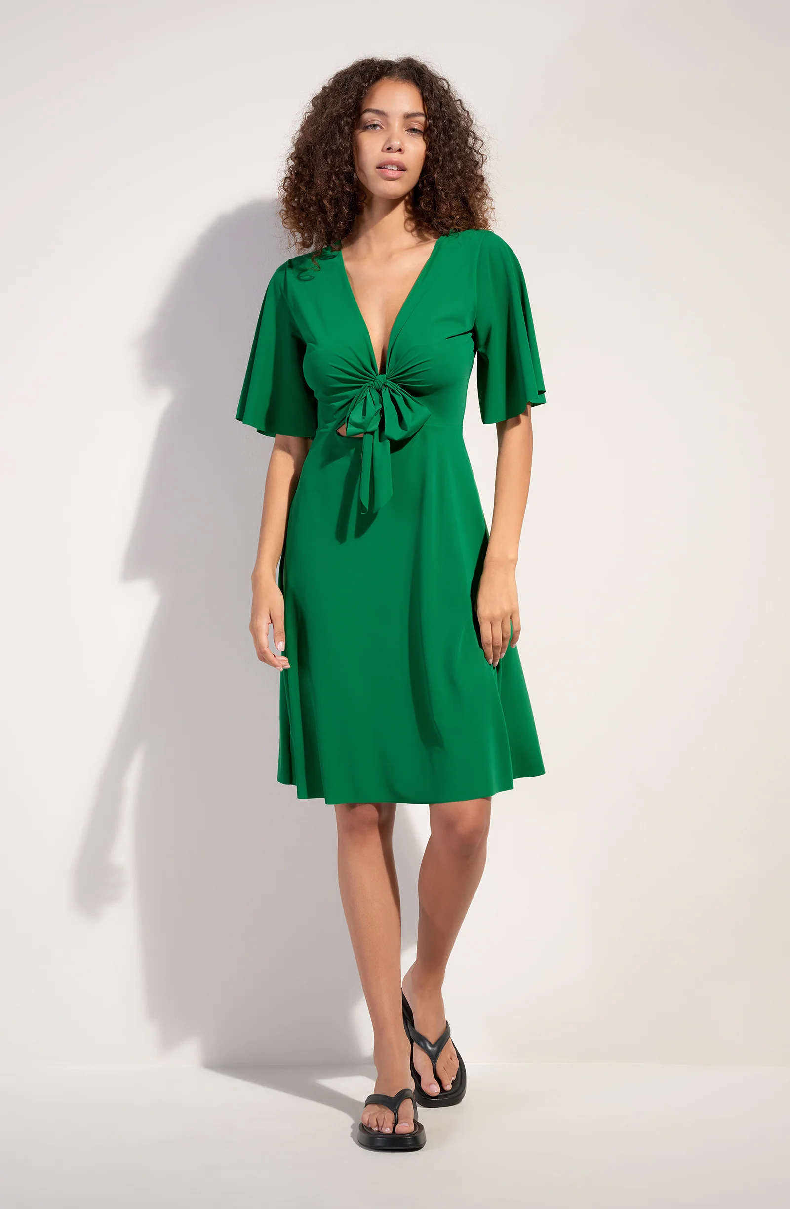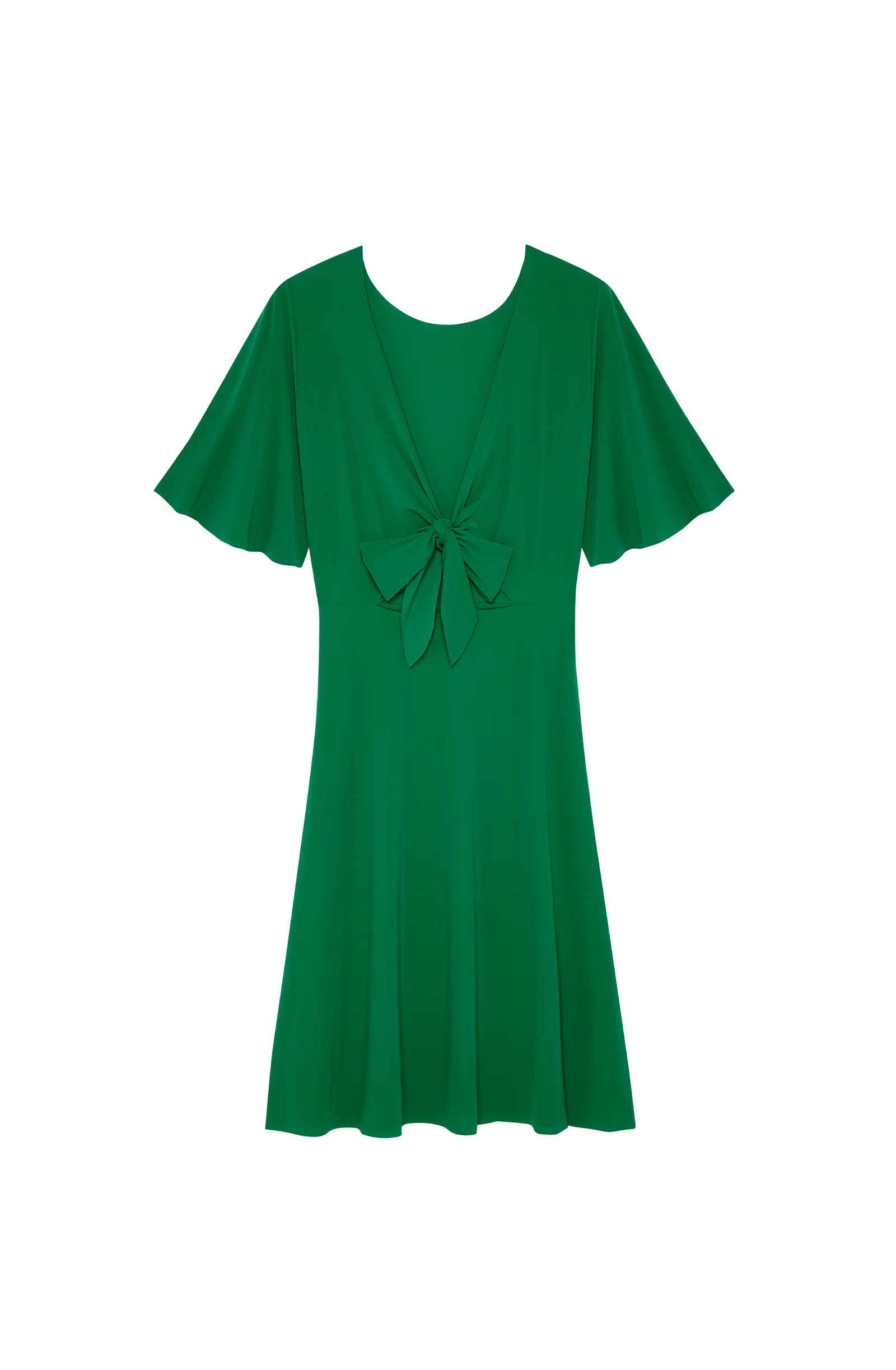 With its small butterfly sleeves, the NATT short dress, crafted from light voile, is a gem of lightness. It can be worn both ways to play with the décolletage, featuring a tie front with a wrap-effect design. Jade, a rich green that’s intensely soft and radiant.