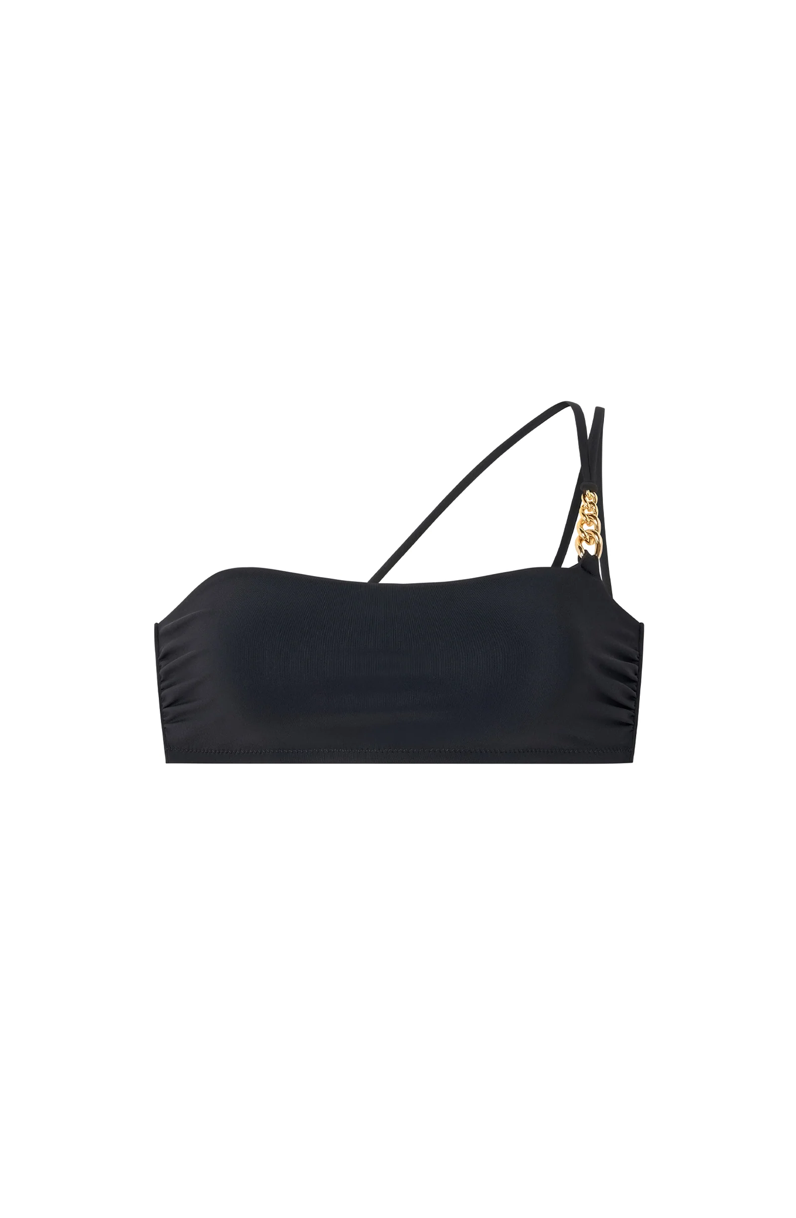 The NIANIA swim top plays with asymmetry with sophistication. This bandeau accentuates curves thanks to boning and side gathers. At the front, a gold chain reveals two thin straps to tie at the back for a graphic and sophisticated look. Black, a timeless and always elegant color.