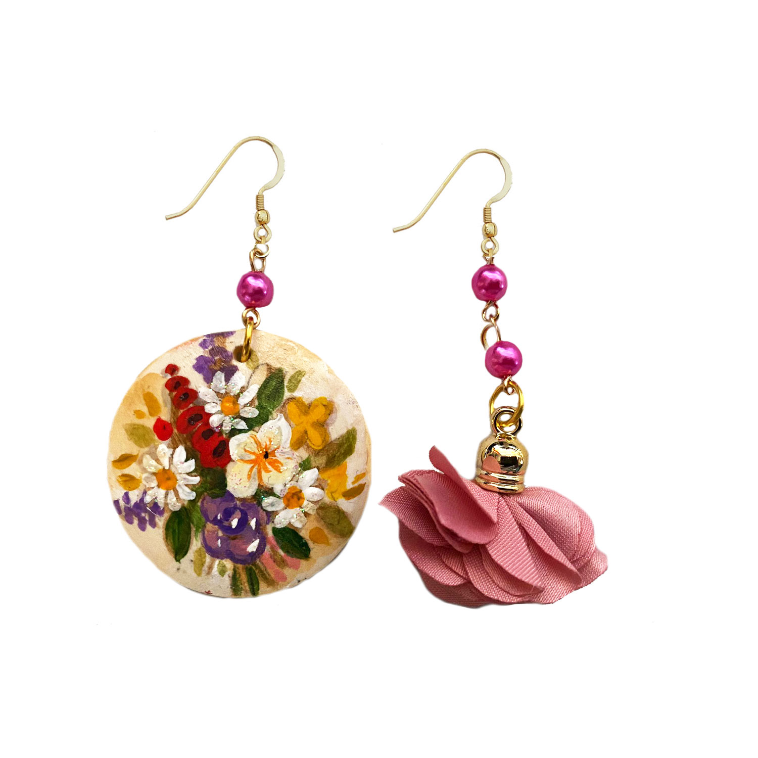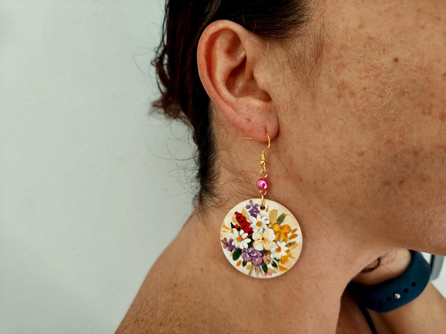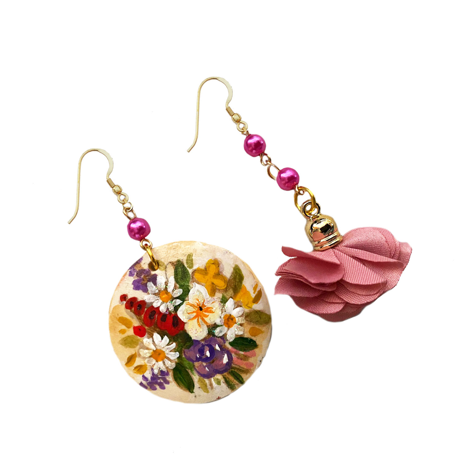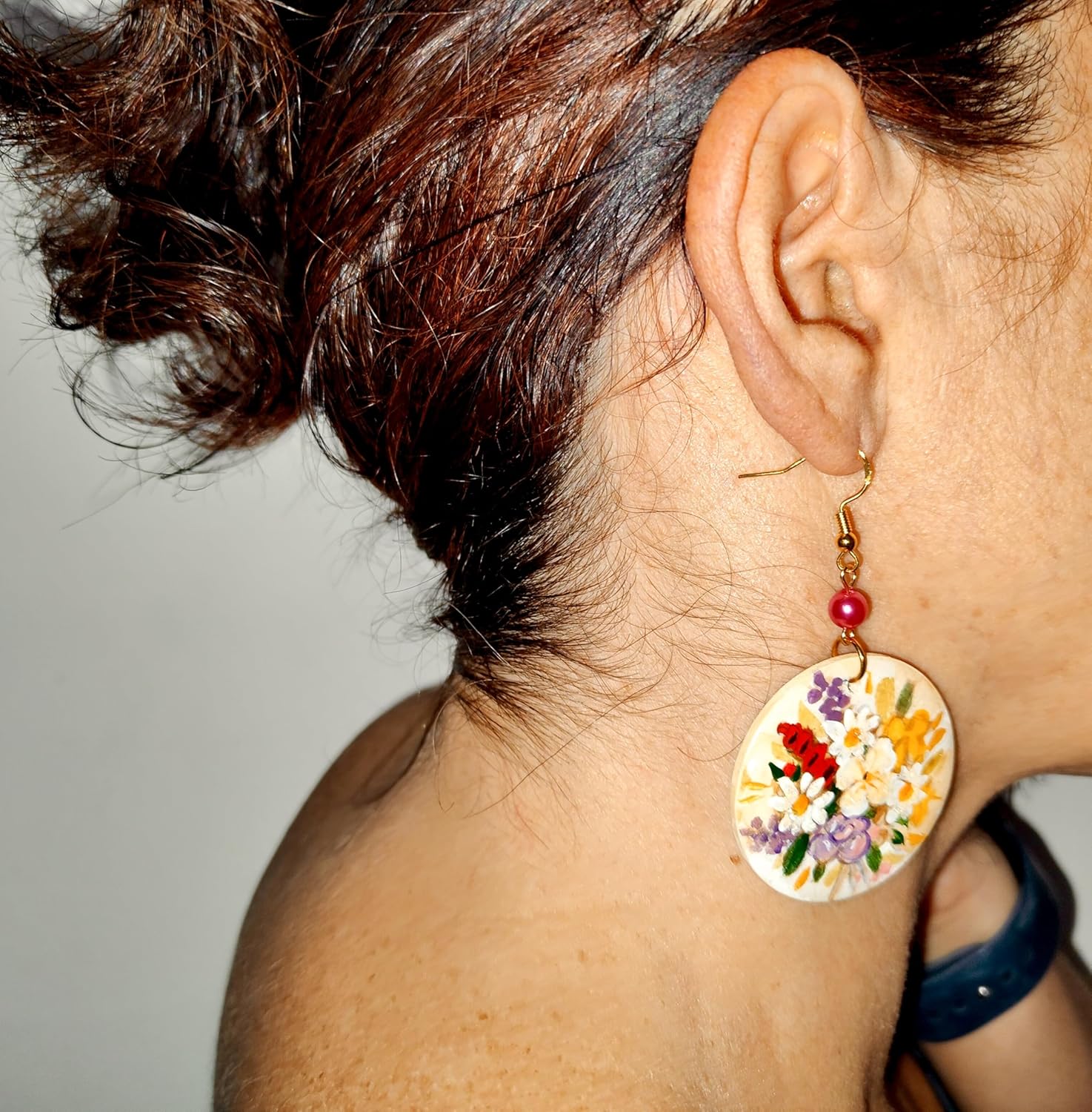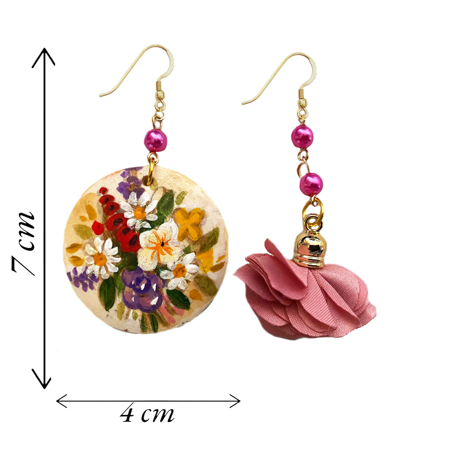 Orecchini dipinti a mano – Fiori Inglesi: Un inno alla bellezza naturale e alla pittura floreale con questi orecchini in legno dipinti a mano che raffigurano un vivace bouquet di fiori inglesi su delicata base beige. Ogni dettaglio è valorizzato da sfumature colorate e luminose, impreziosito da perle cerate che ne riprendono l’eleganza. Un gioiello raffinato e originale, che porta con sé la freschezza e l’armonia della natura in una forma da indossare.