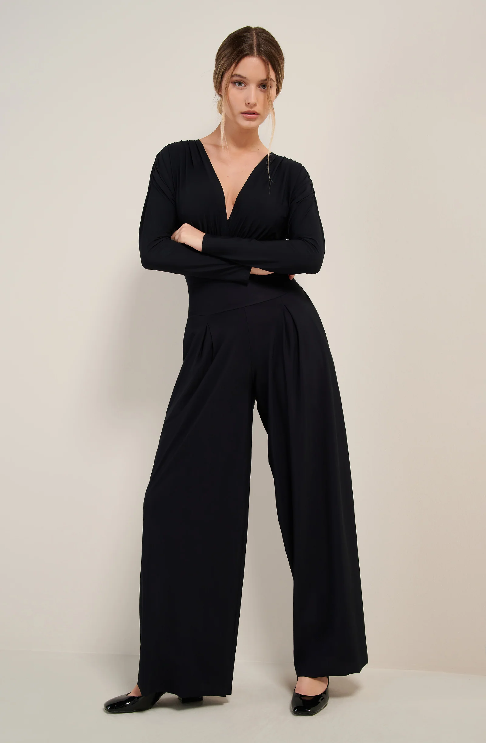 The loose trousers PANNA balance the silhouette with style and comfort. The wide stretch waistband follows the waist without constraining it and the soft delicately structured mesh of darts ensures a flowing effect. Black, a timeless and always elegant colour.
