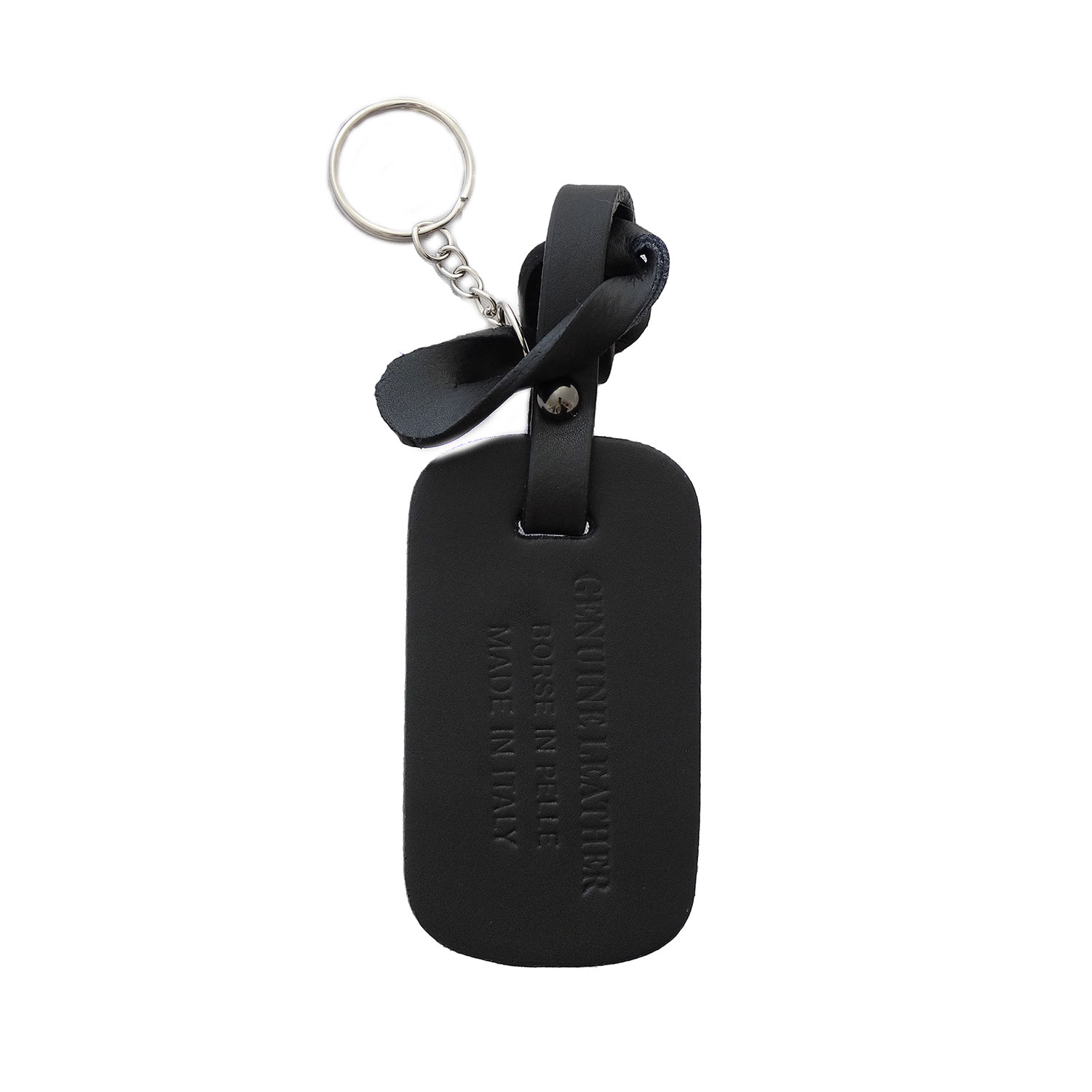 Dimensione: 8 cm. x 4,5 cm. Materiale: Pelle dipinta a mano. Minuteria: Toni color argento, Dotato di moschettone, Charm in pelle toni color argento.