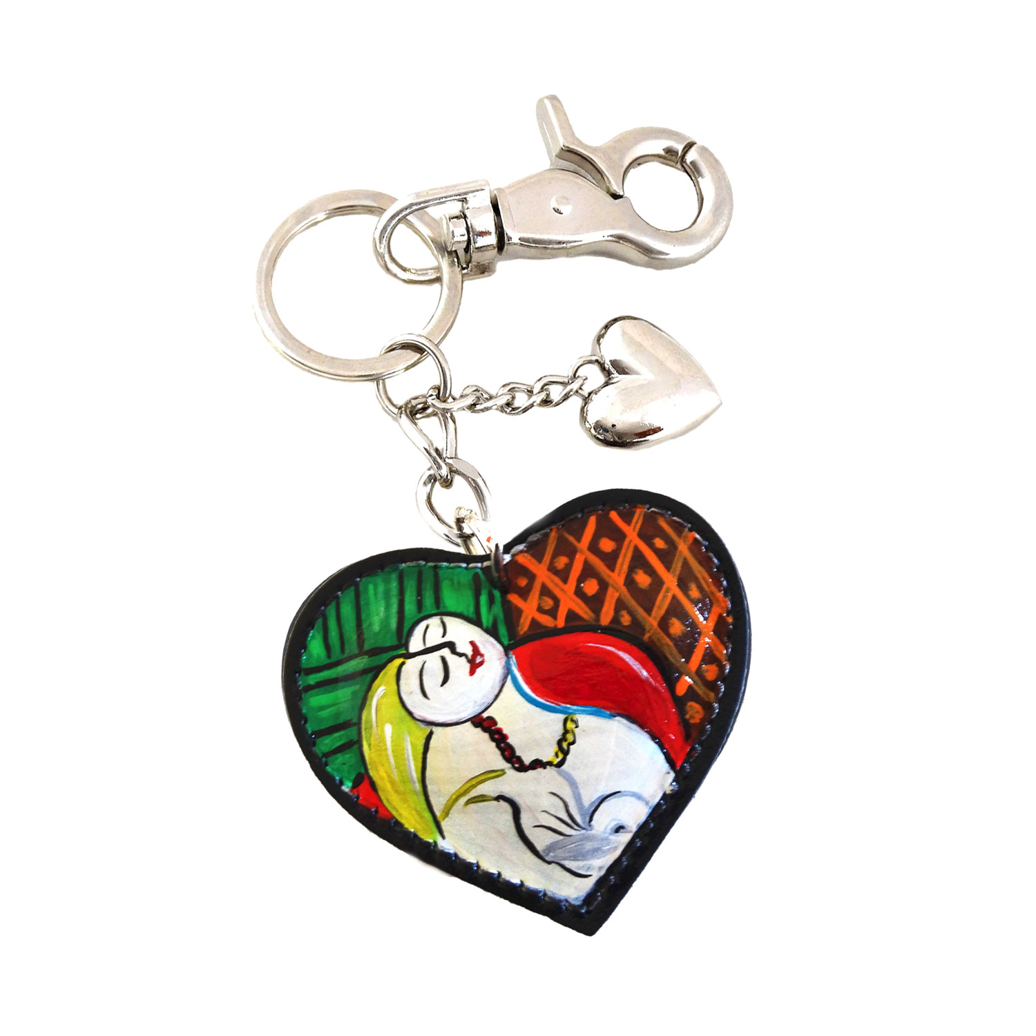 Dimensione: 6,5 cm. x 6 cm. Materiale: Pelle dipinta a mano. Minuteria: Toni color argento, Dotato di moschettone, Charm a forma di cuore toni color argento.