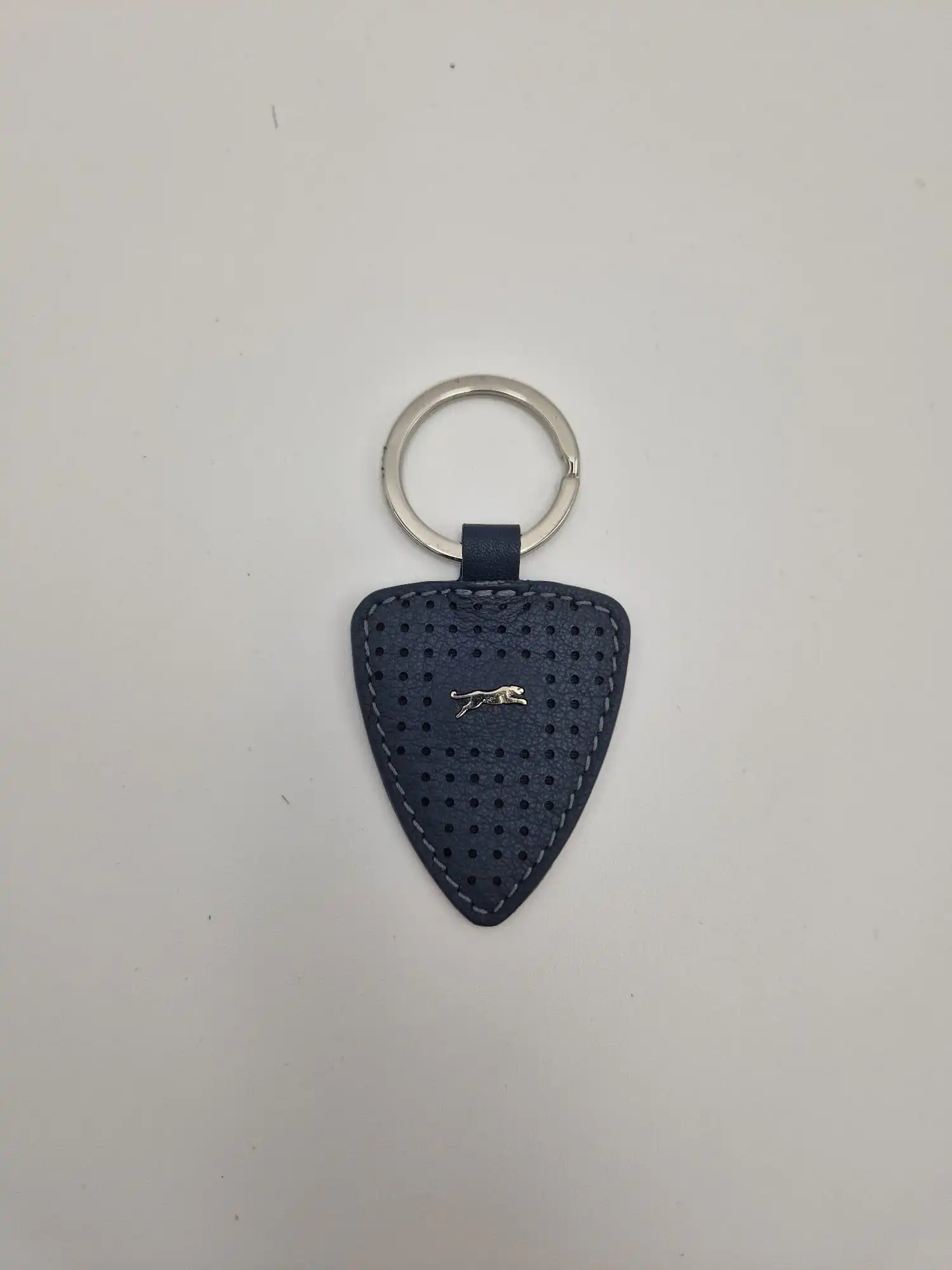 Portachiavi Jaguar in pelle blu, traforata con anello color argento.