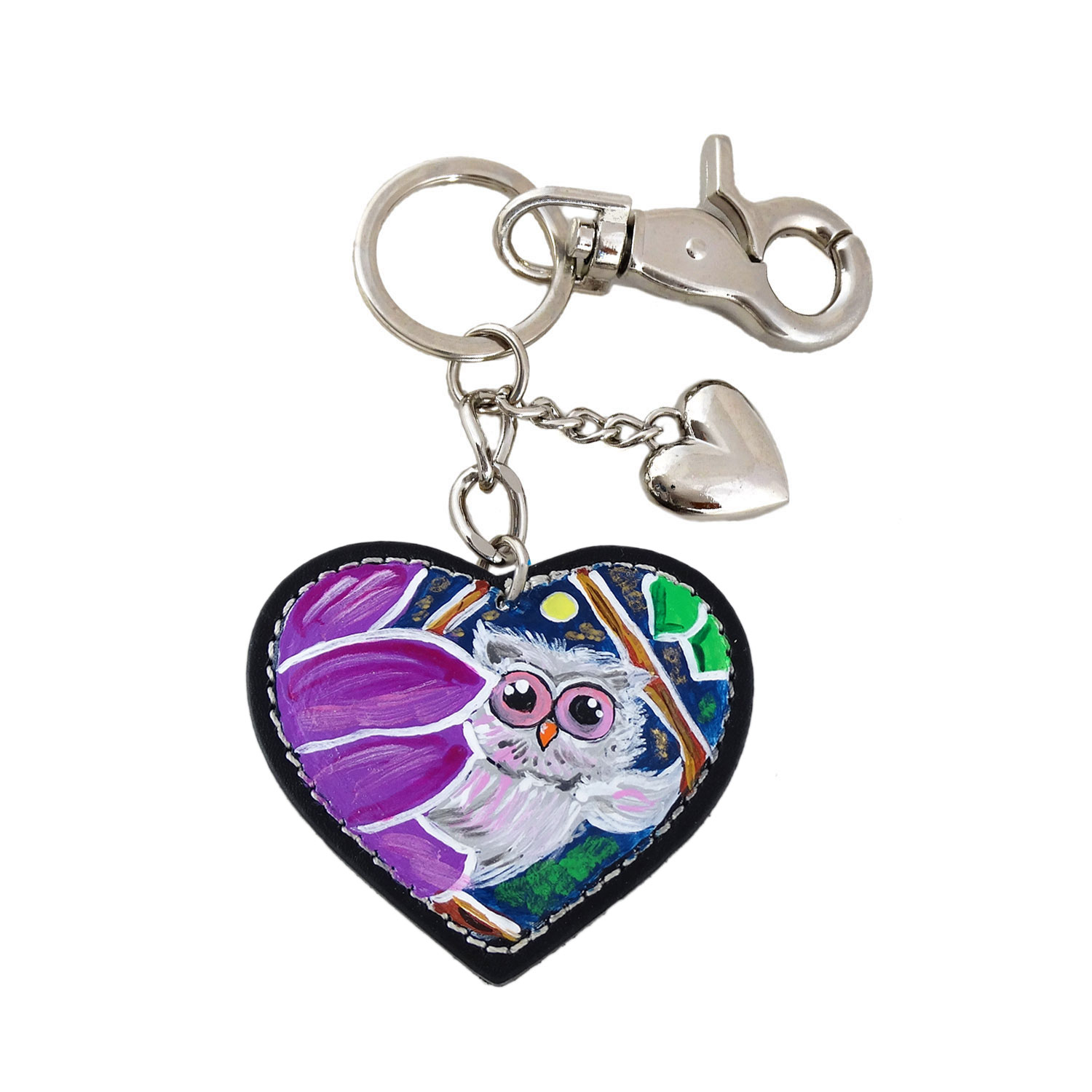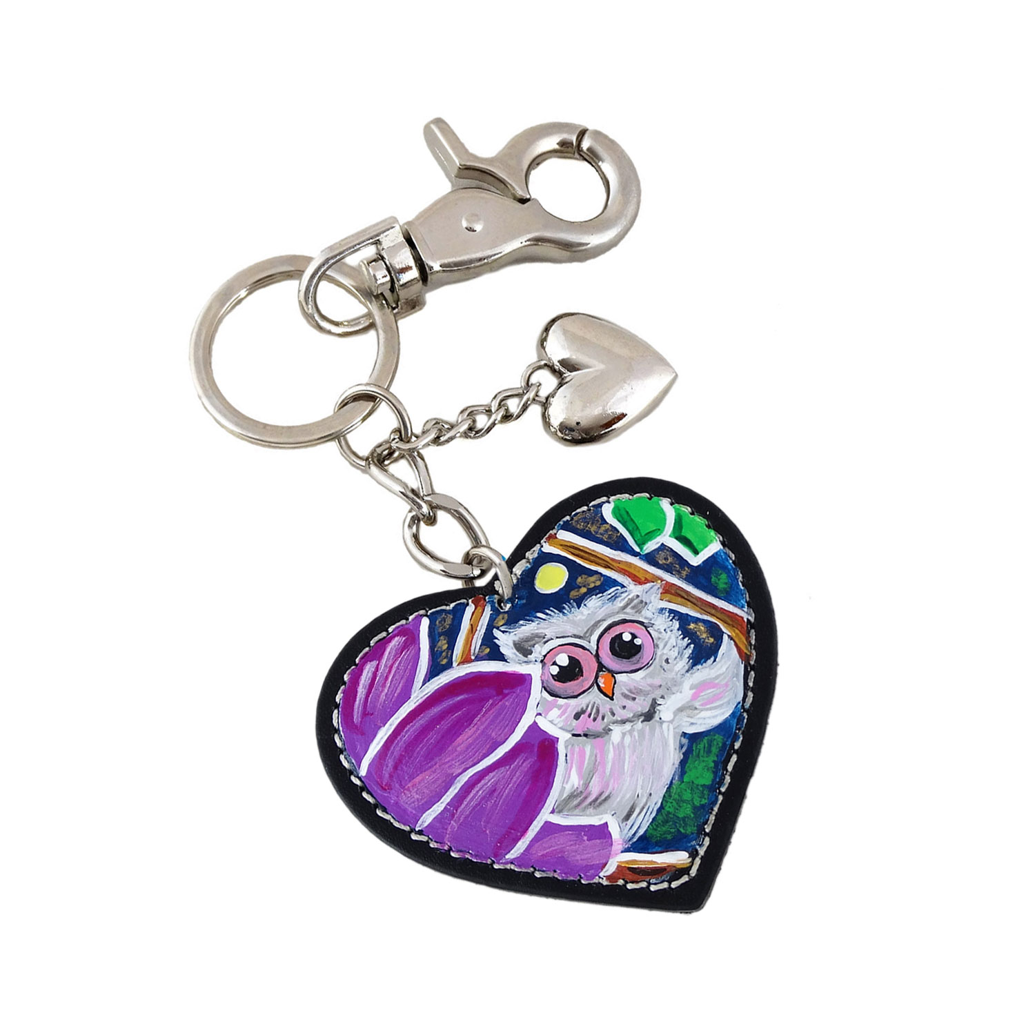 Dimensione: 6,5 cm. x 6 cm. Materiale: Pelle dipinta a mano. Minuteria: Toni color argento, Dotato di moschettone, Charm a forma di cuore toni color argento.