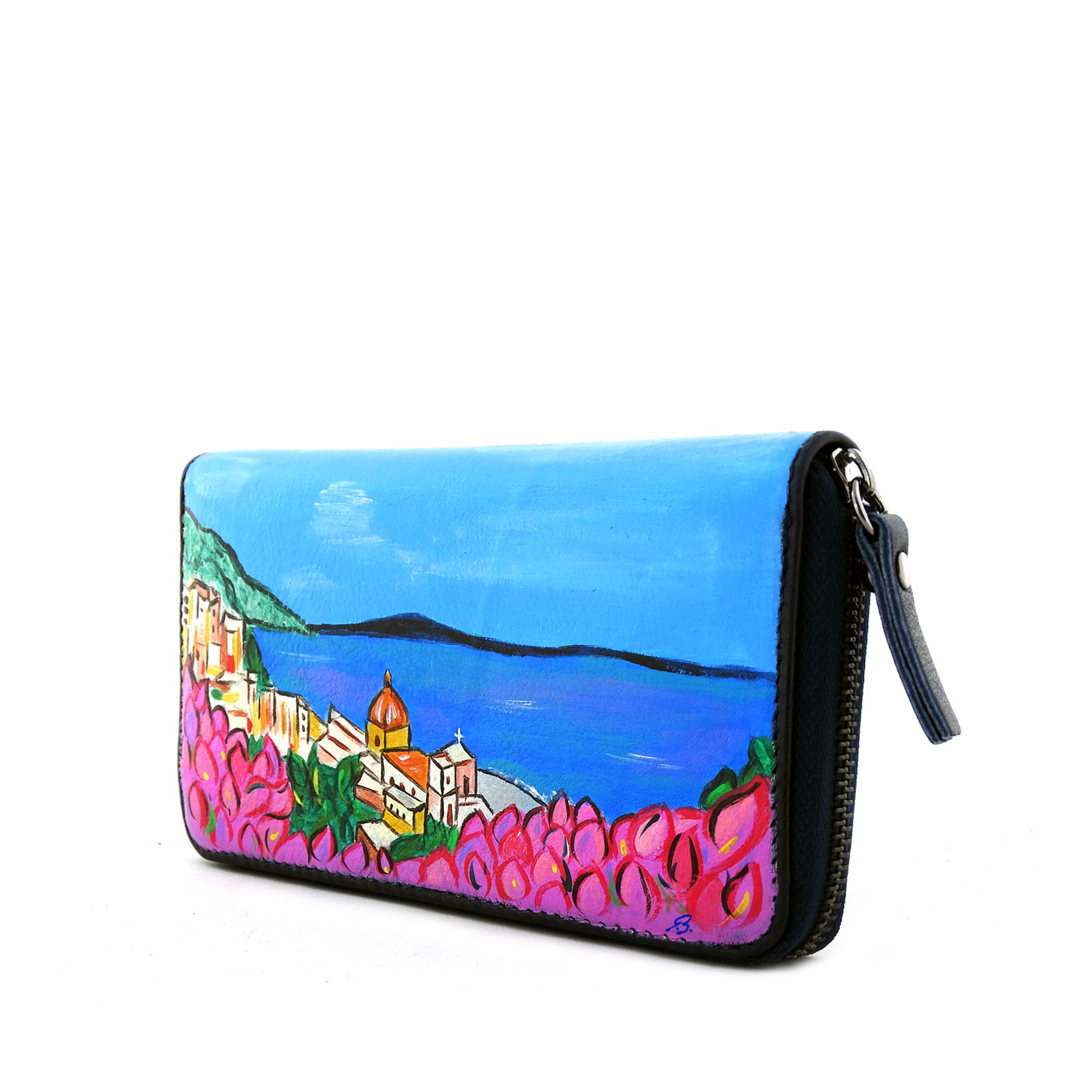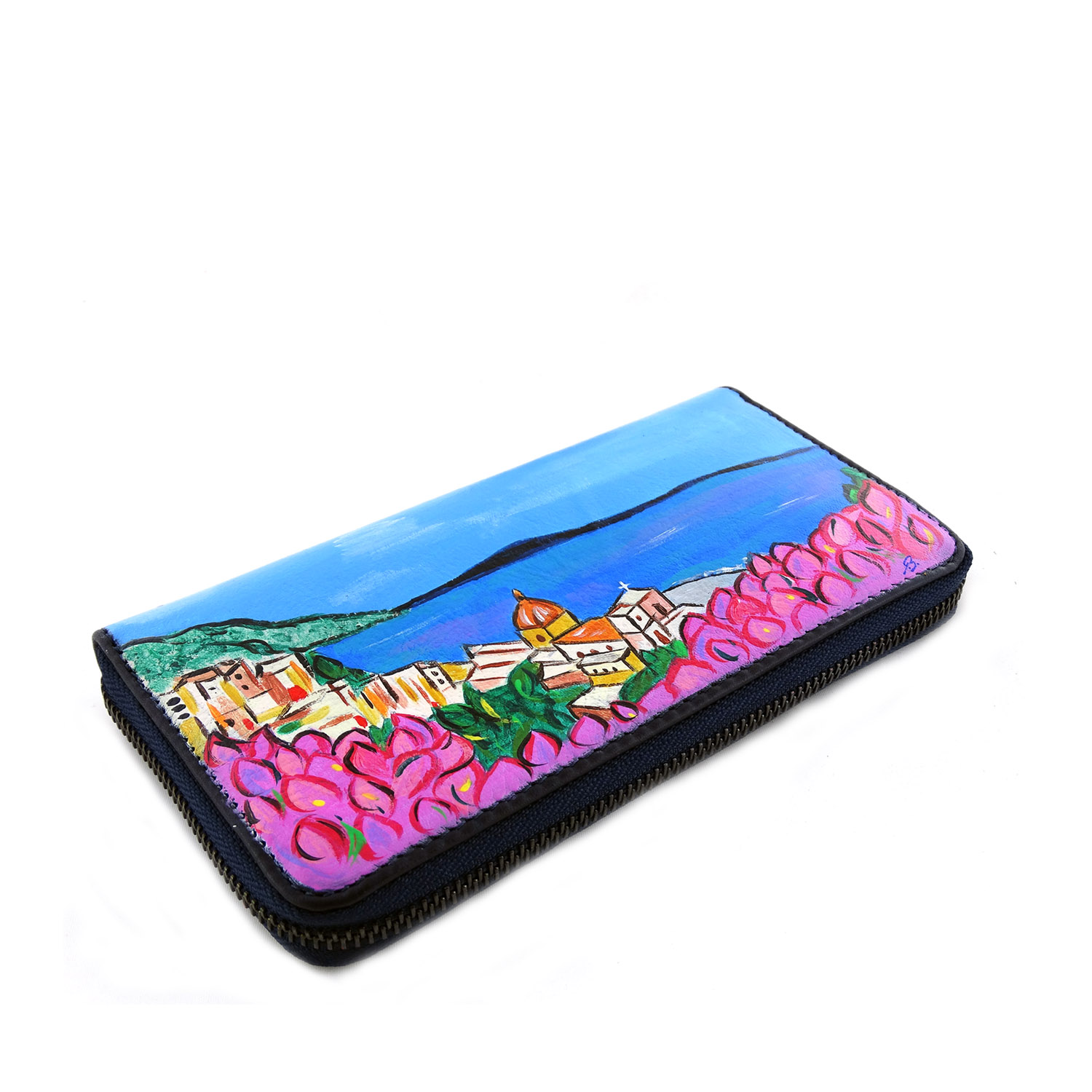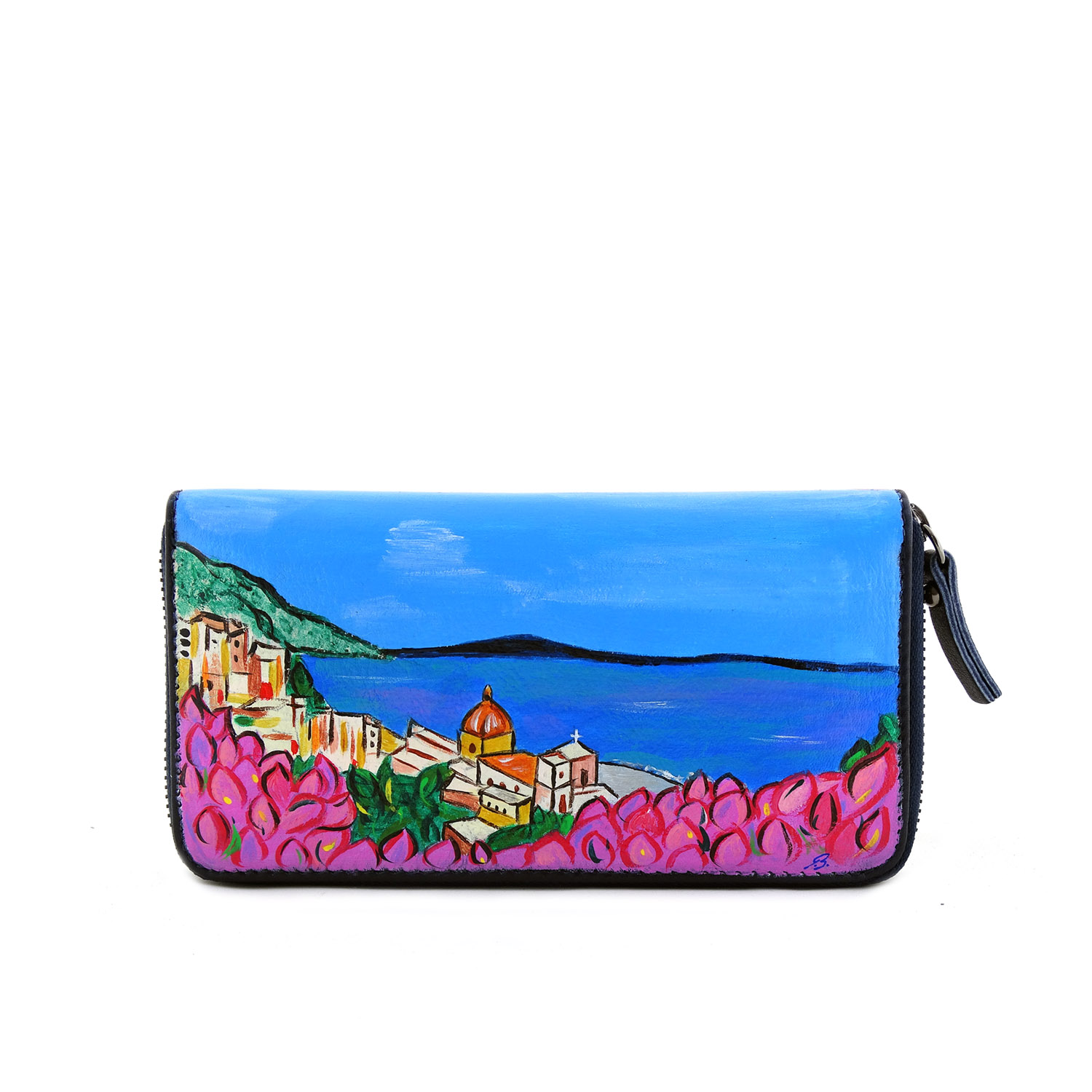 Portafogli dipinto a mano – Amalfi: luogo di incomparabile bellezza naturale della costiera Amalfitana, il mare che l’accarezza e la Boungaville in fiore incorniciano questo colorato portafoglio artigianale in pelle stravagante e unico.