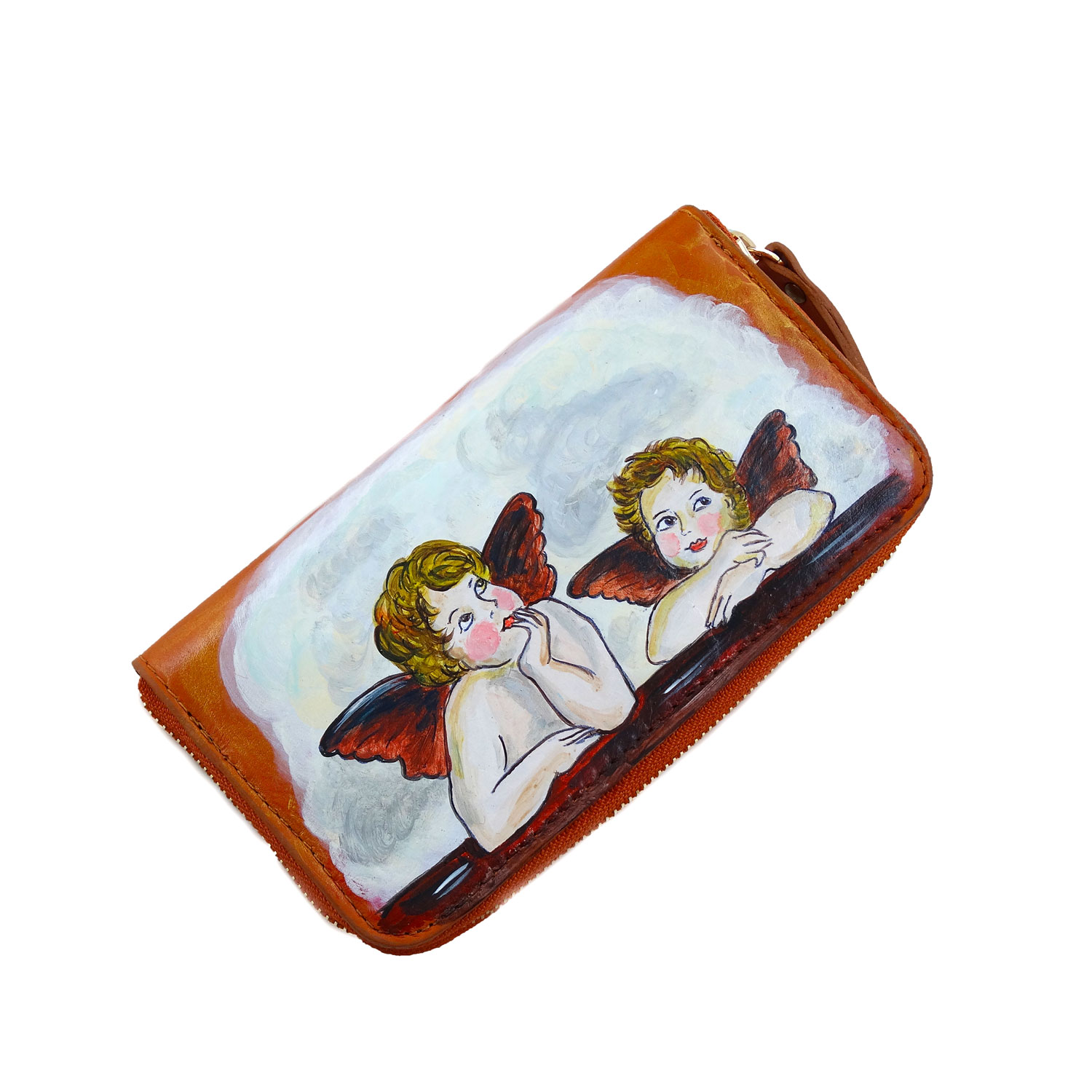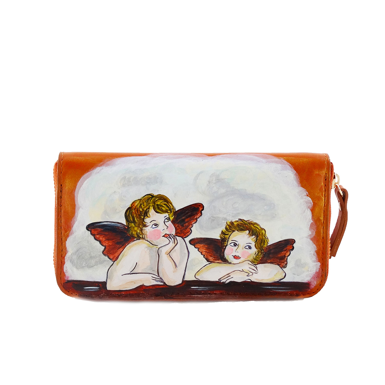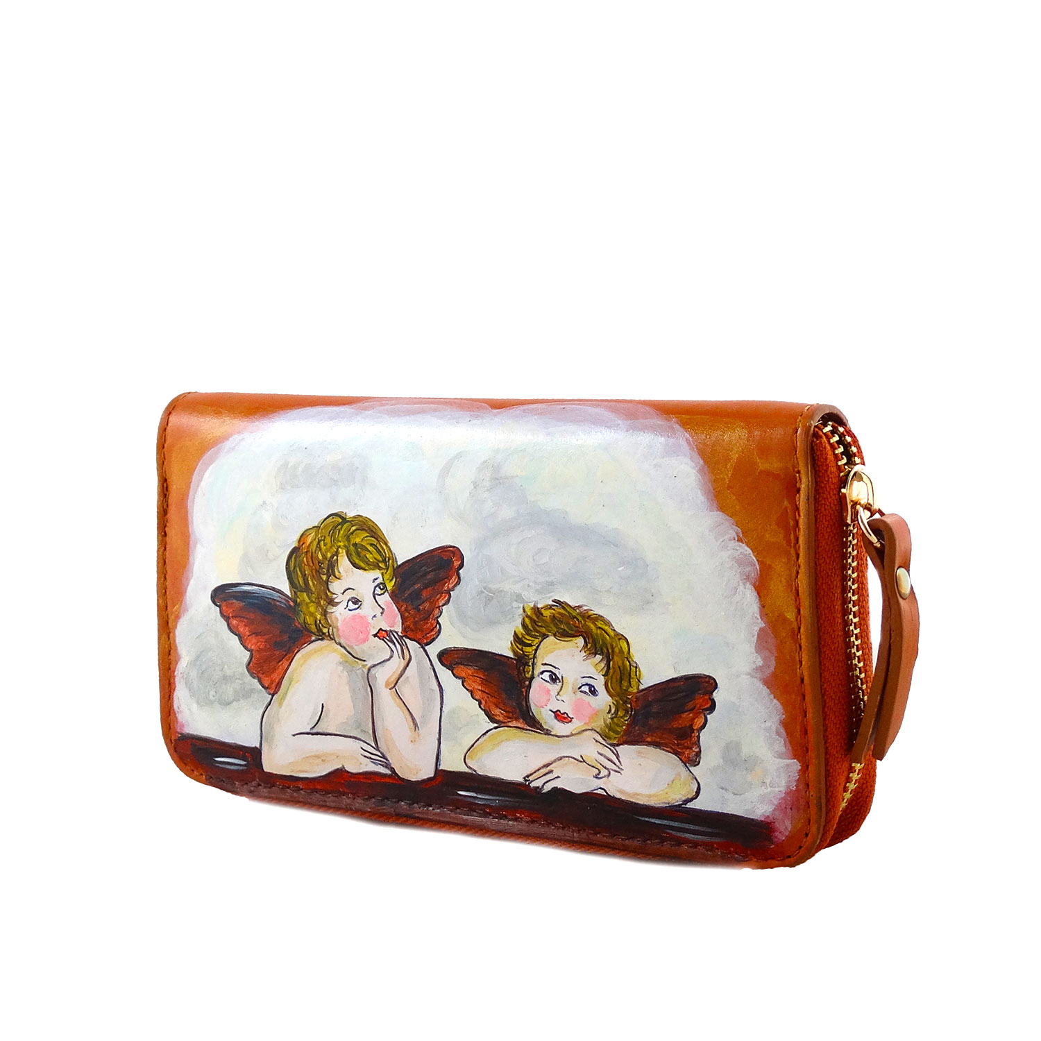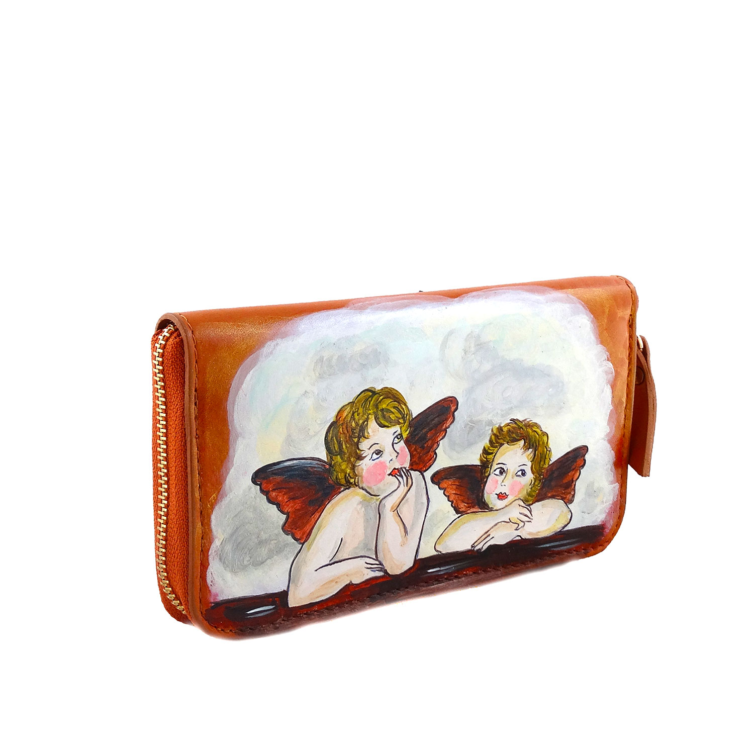 Portafoglio in pelle dipinto a mano – Cherubini di Raffaello Sanzio: I famosi e dolcissimi Cherubini di Raffaello armonizzano un comodo portafoglio, adatto per il tempo libero per l’ufficio, dettagli oro si fondono ai toni cognac del portafoglio. Portafoglio con porta carte di credito e porta spicci.