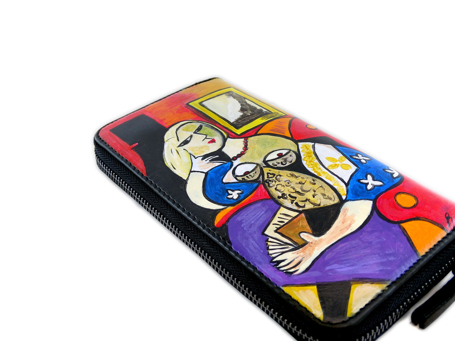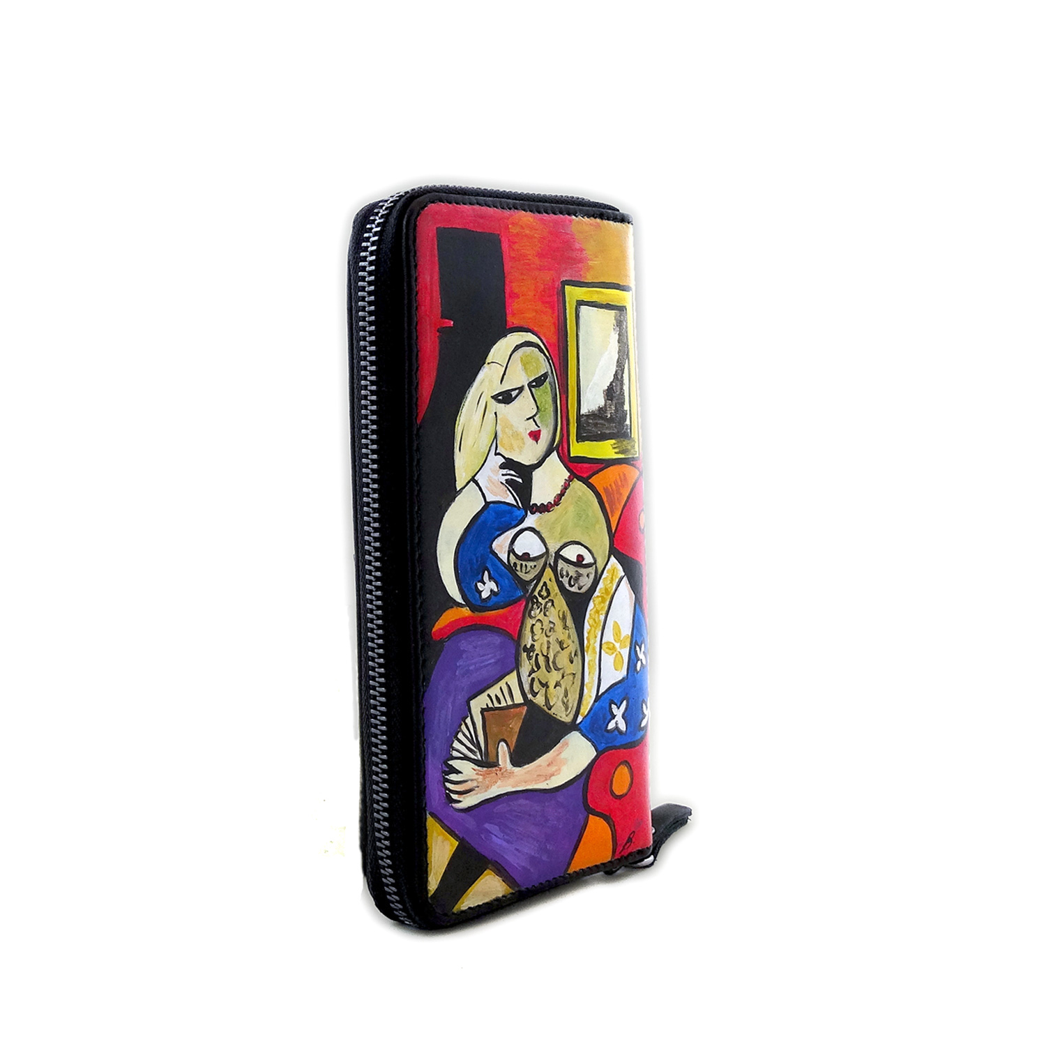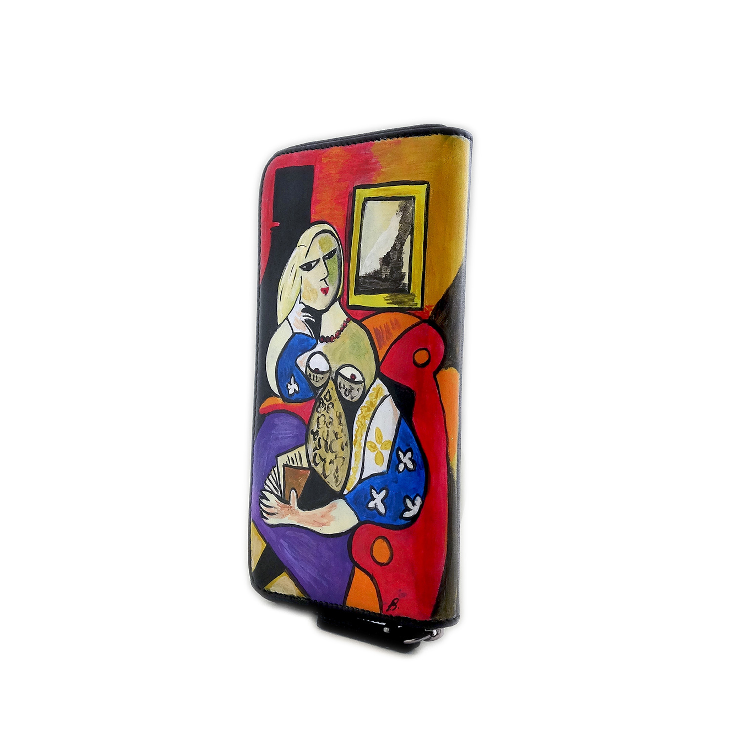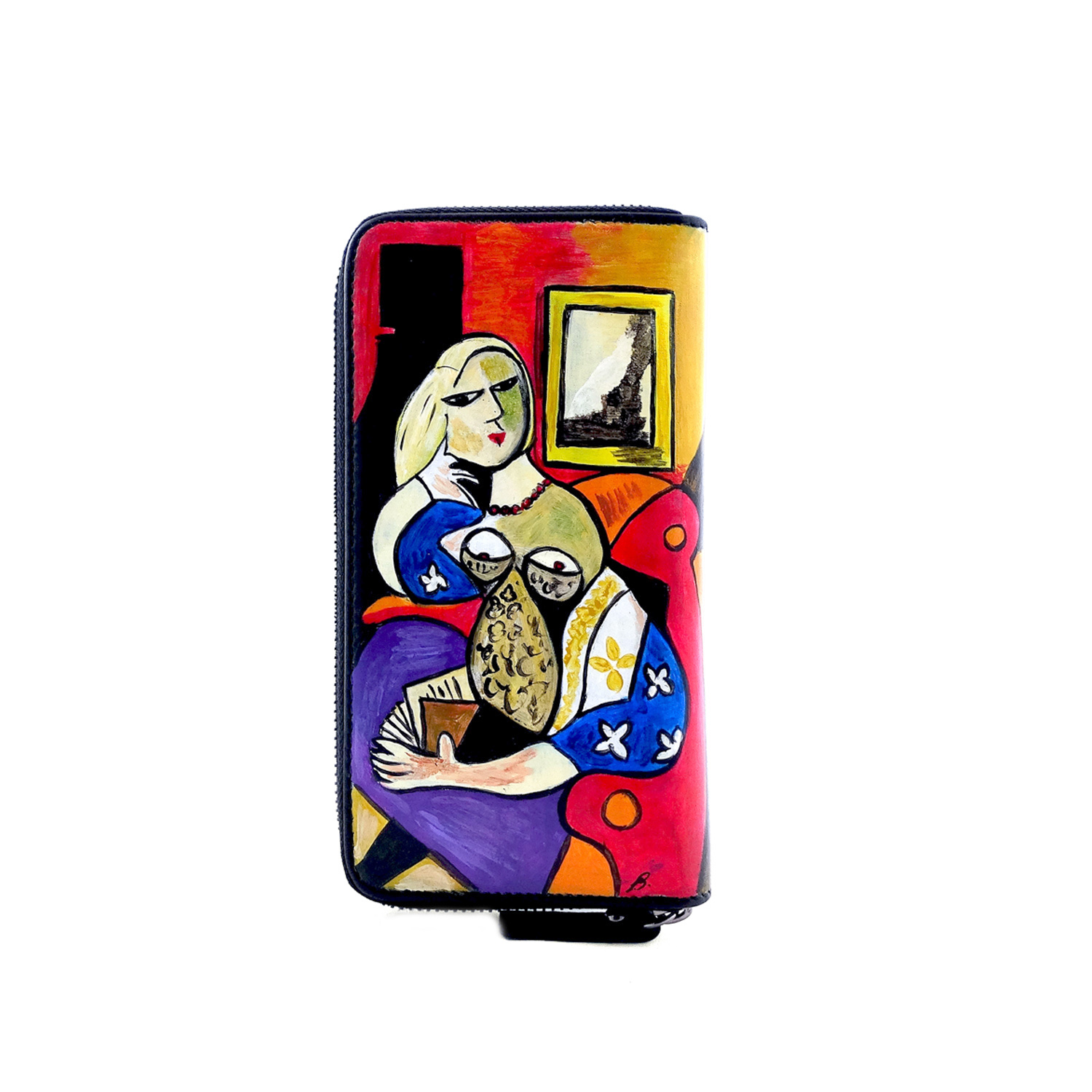Portafoglio dipinto a mano – Donna che legge di Picasso: Una grande opera del maestro indiscusso del cubismo colora un meraviglioso portafogli in pelle creato interamente in Italia in maniera artigianale; tratti decisi e colori sgargianti per questo fantastico portafogli dipinto a mano.