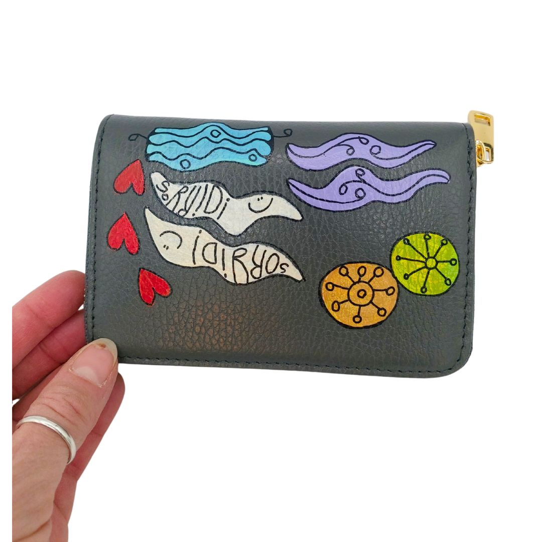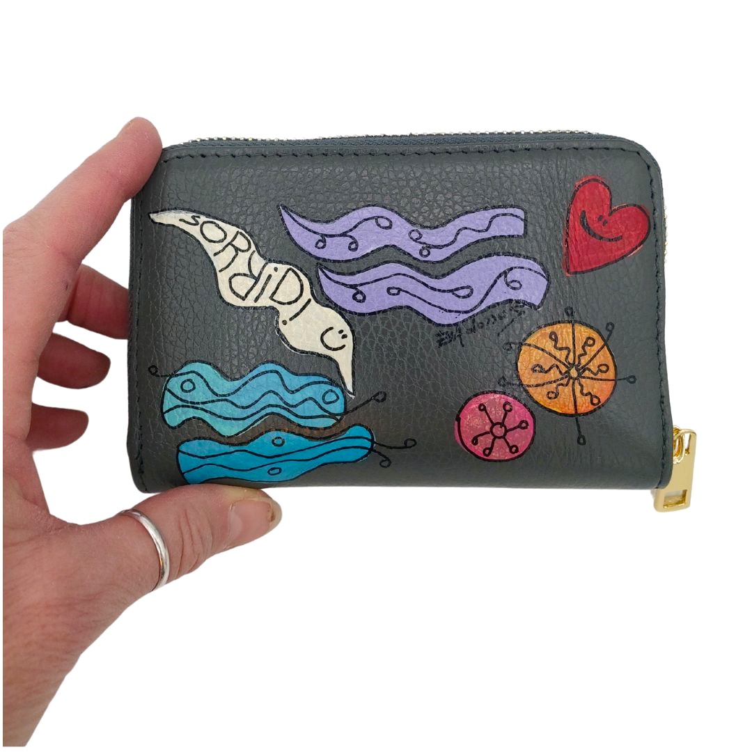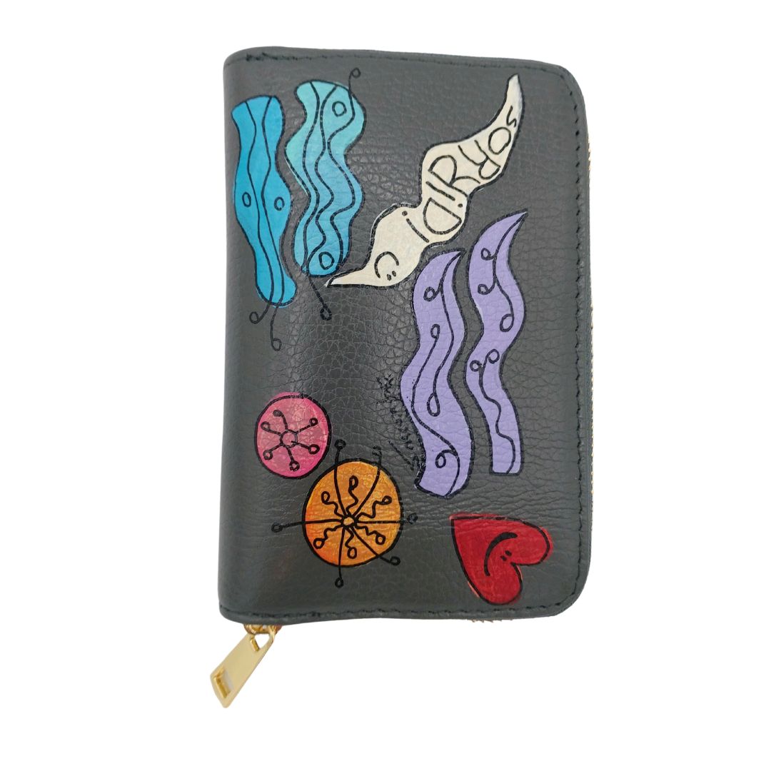 Questi portafogli sono davvero d’effetto! Hanno una misura media, cm.14,5x10x2, quindi sono ideali per borse medio-grandi. Le loro decorazioni colorate sono un colpo d’occhio meraviglioso! Elegantemente sgargiante quando viene tirato fuori dalla borsa, ha la taschina con cerniera per le monete nella parte centrale. Ognuno è un pezzo unico dipinto da Eva Zuccolo, perfetto per un regalo assolutamente unico e originale!