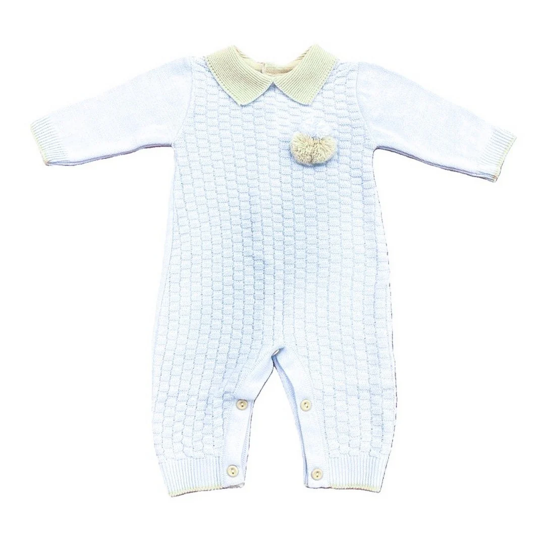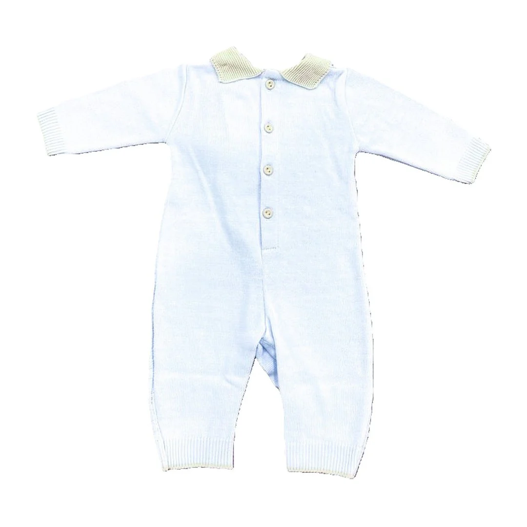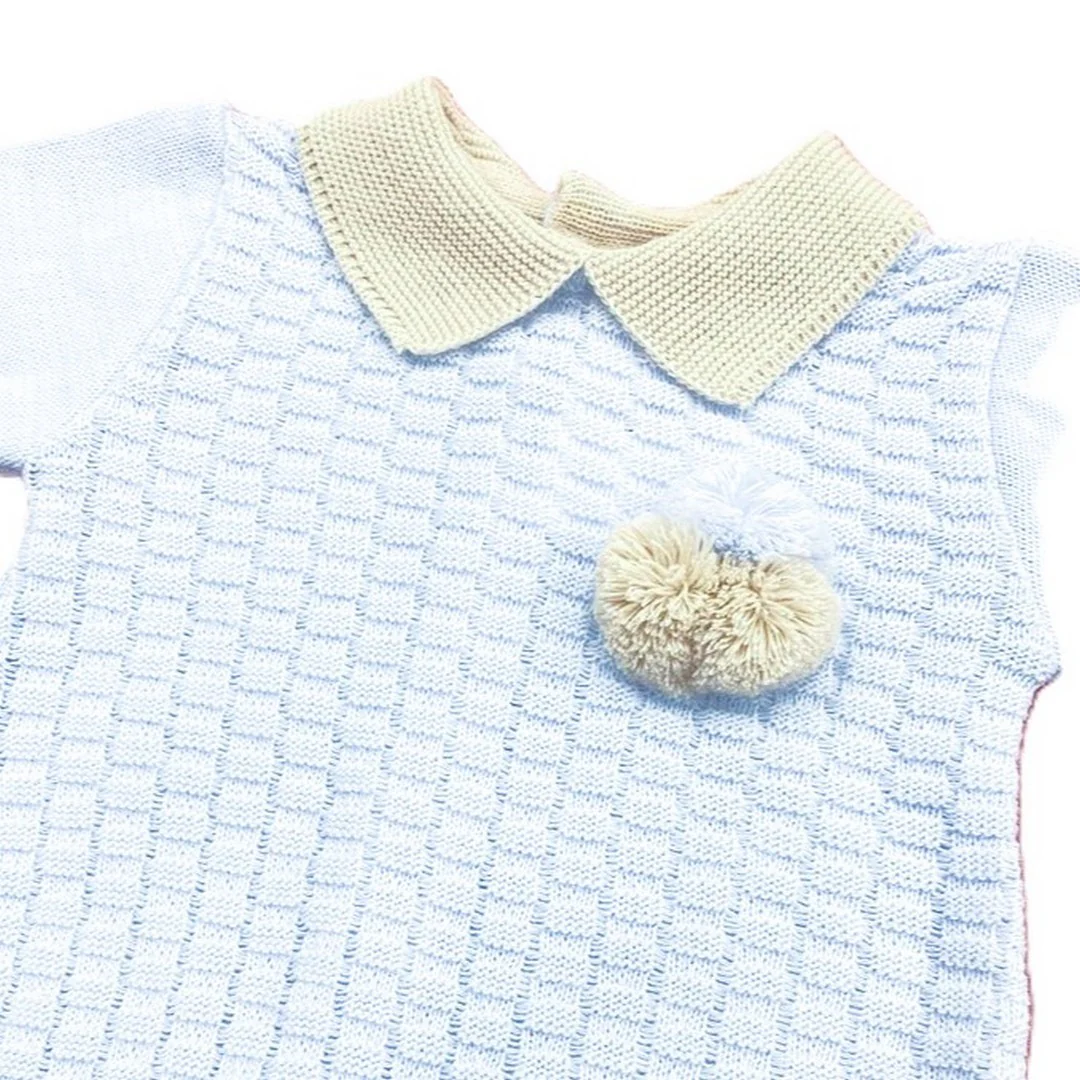 Il design elegante รจ impreziosito da una bordatura beige in lana lavorata, che valorizza il fondo celeste della tutina aggiungendo un tocco di classe senza rinunciare alla praticitร . I bottoncini sul retro e lungo i gambali consentono un cambio del pannolino semplice e veloce.