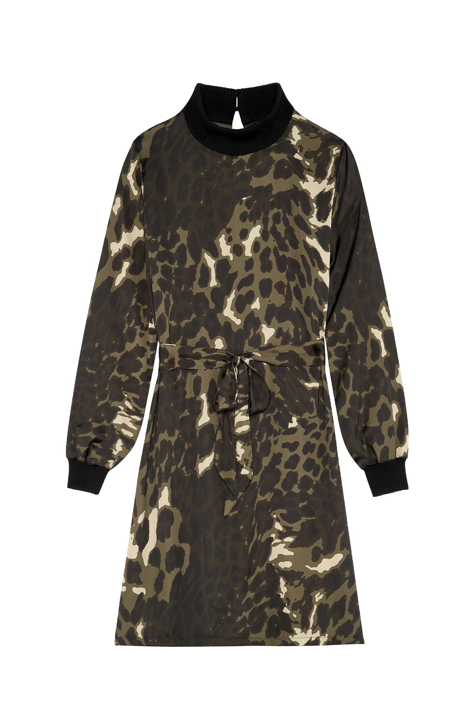 Contrasting and mixing materials, the flowing satin is adorned with ribbed finishes at the collar and the cuffs. The dress REBECCA elegantly plays with volumes. Its JUNGLE print can be tied at the waist for a working girl look or can be worn freely.