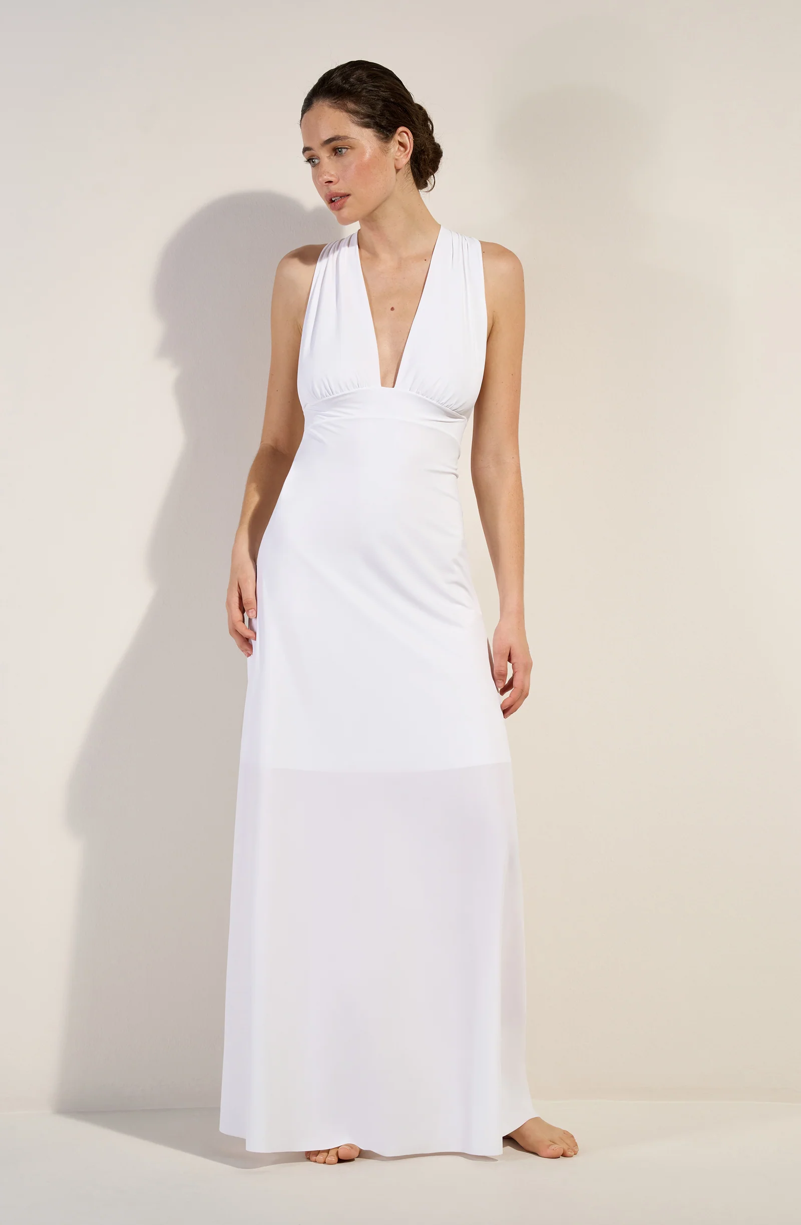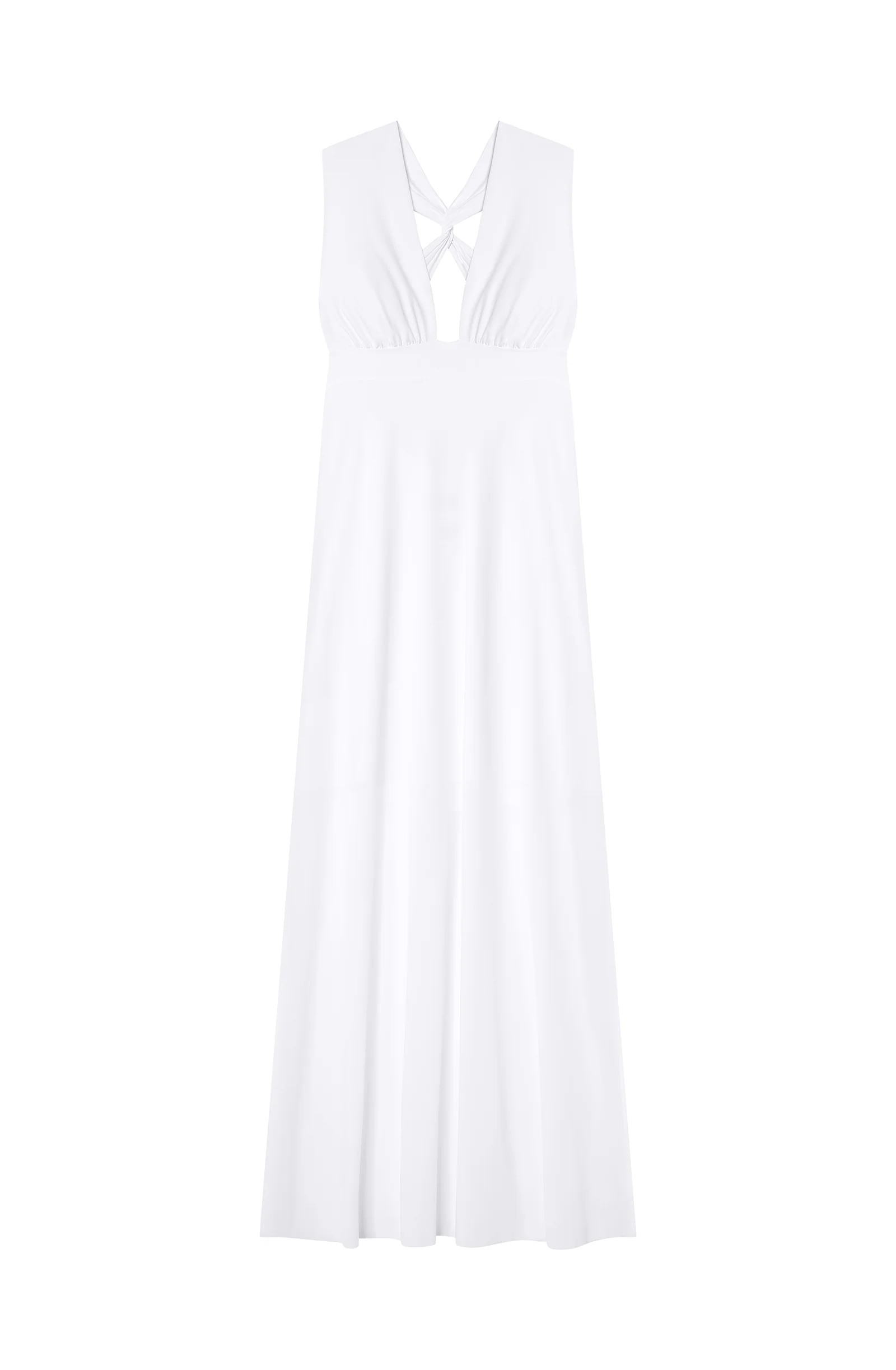 With its clean and dynamic lines, the REENA long fluid dress shapes the silhouette and enhances the curves. At the front, the wide gathered cups highlight the neckline. At the back, the crossed straps adjust to flatter the bare back. Pure and delicate, white brightens the complexion.