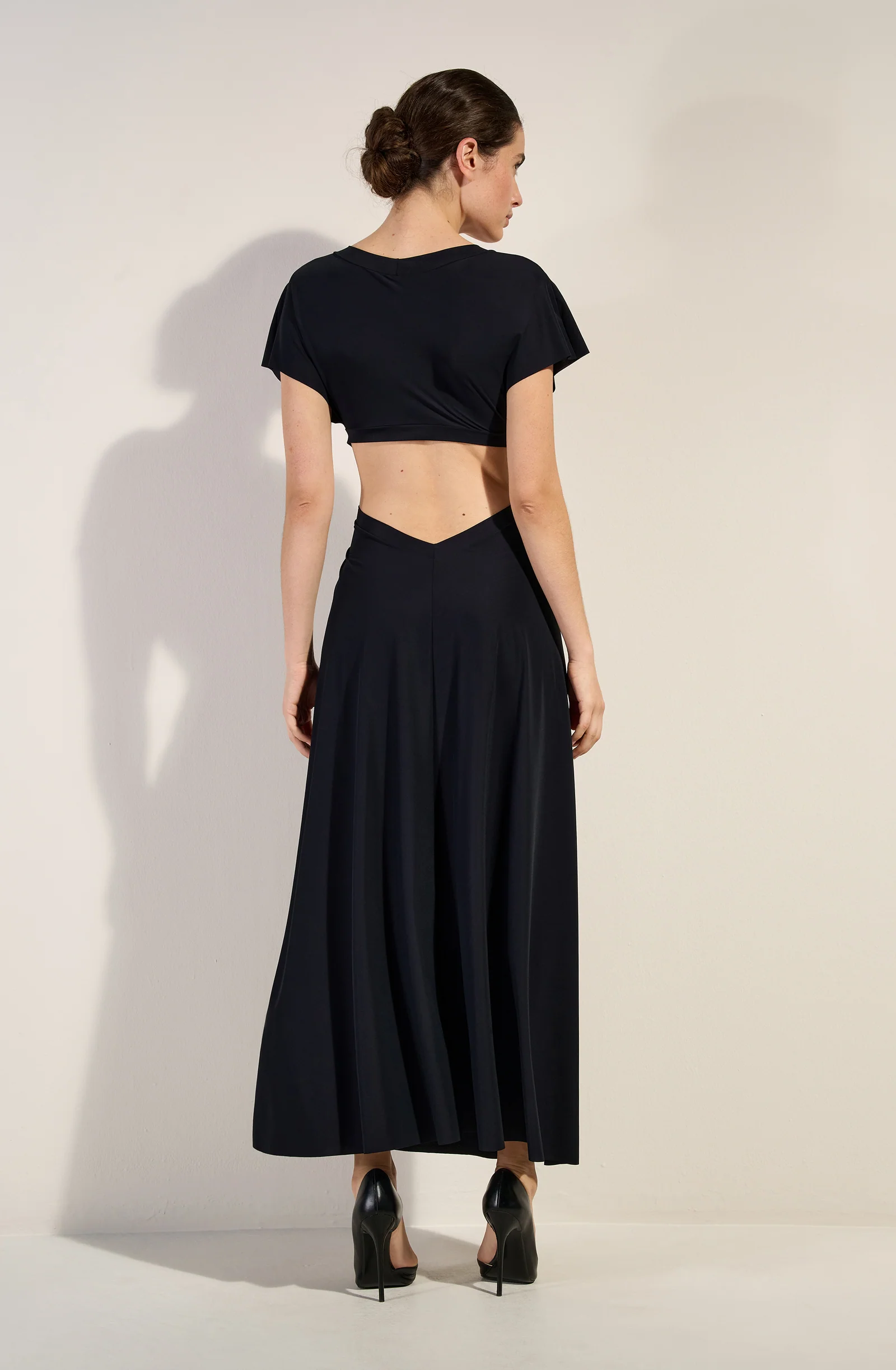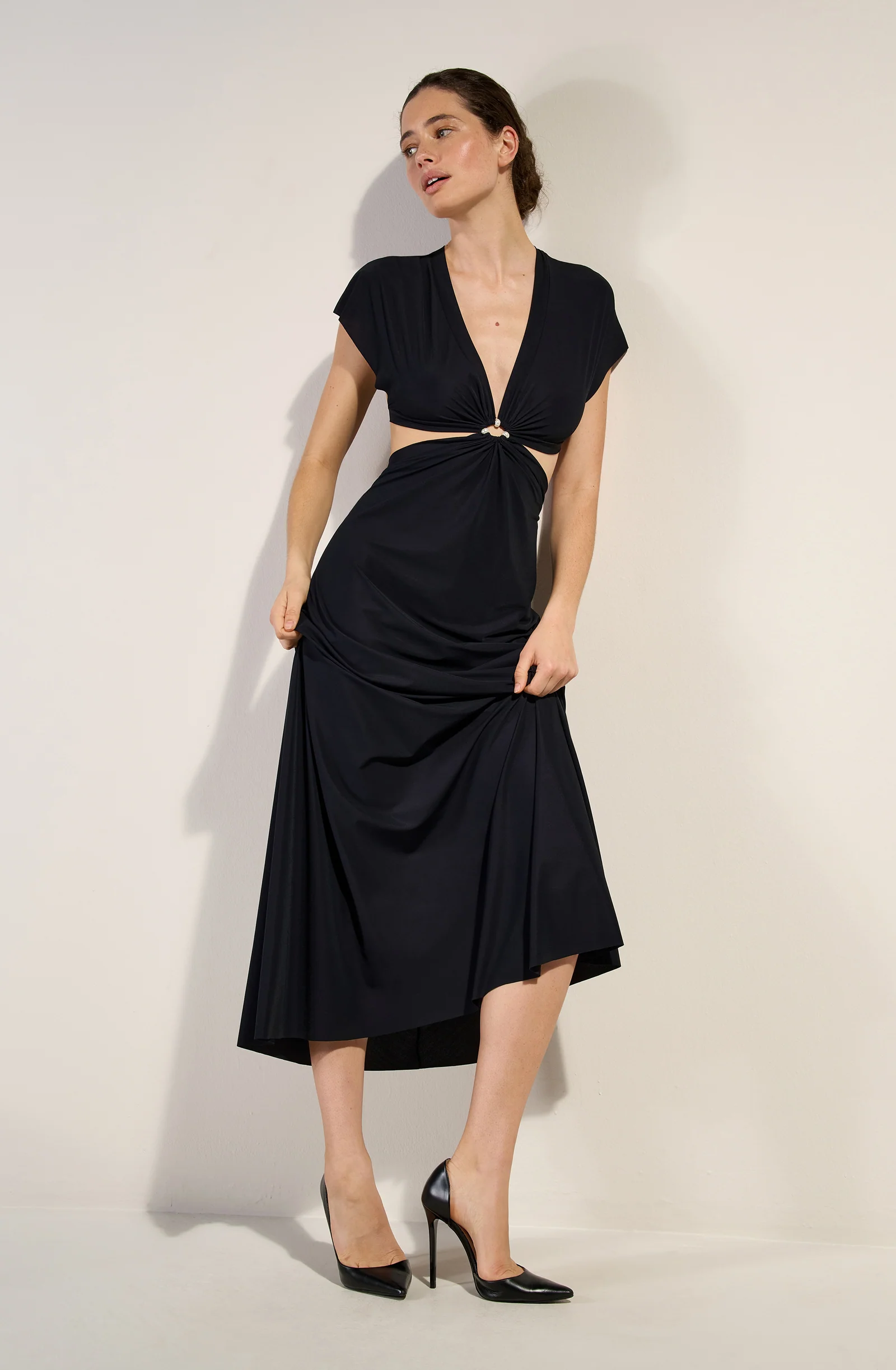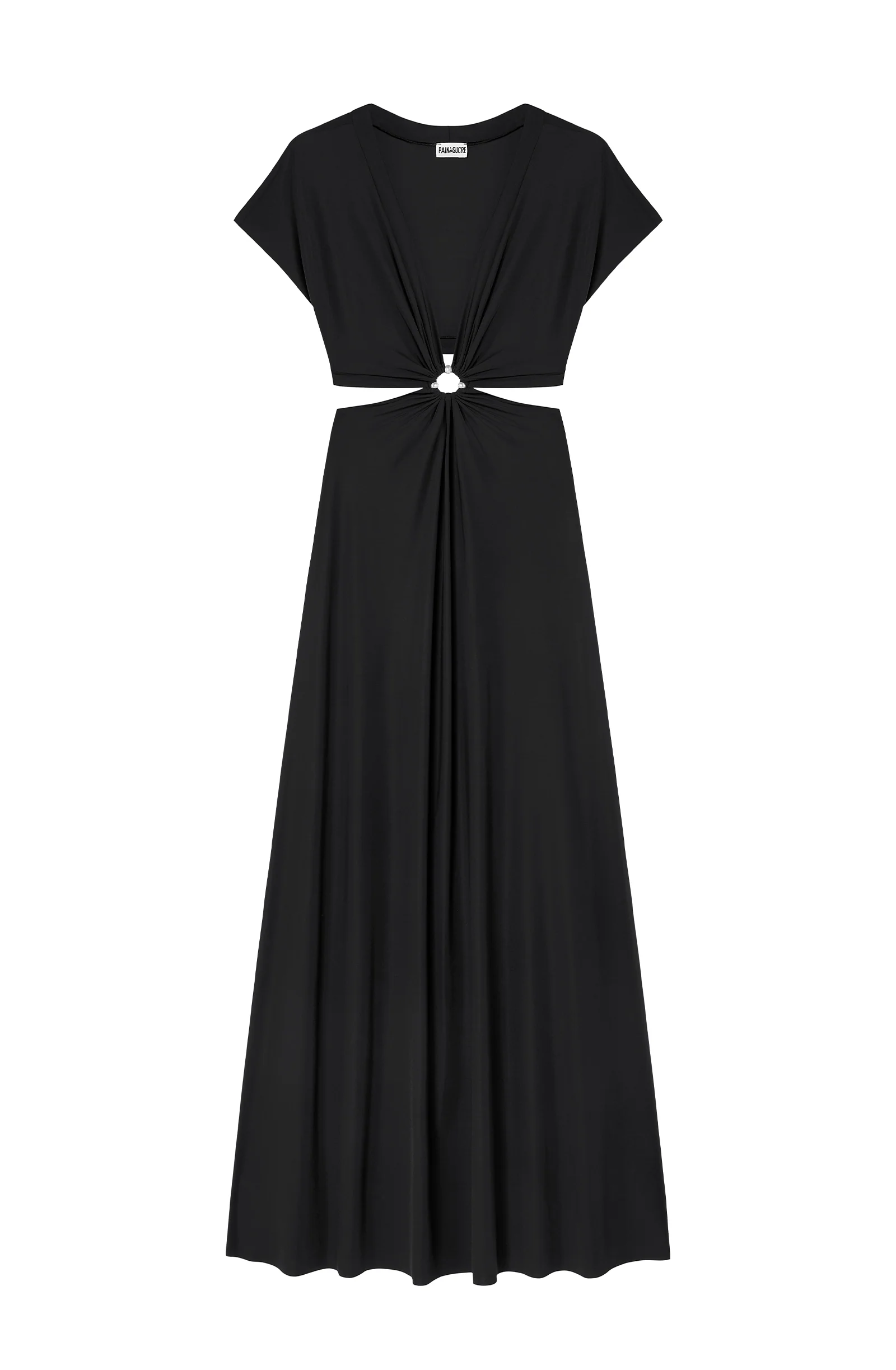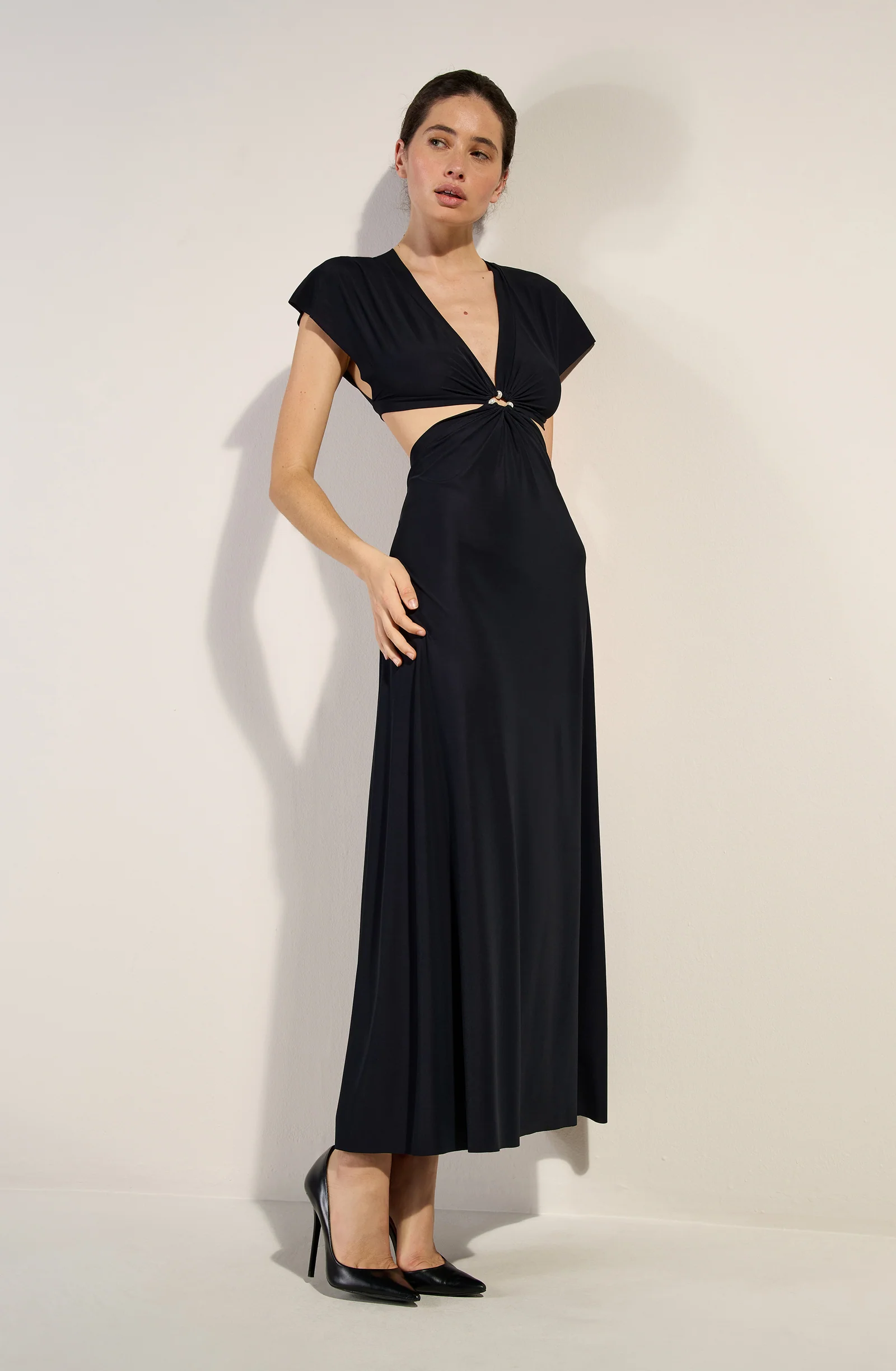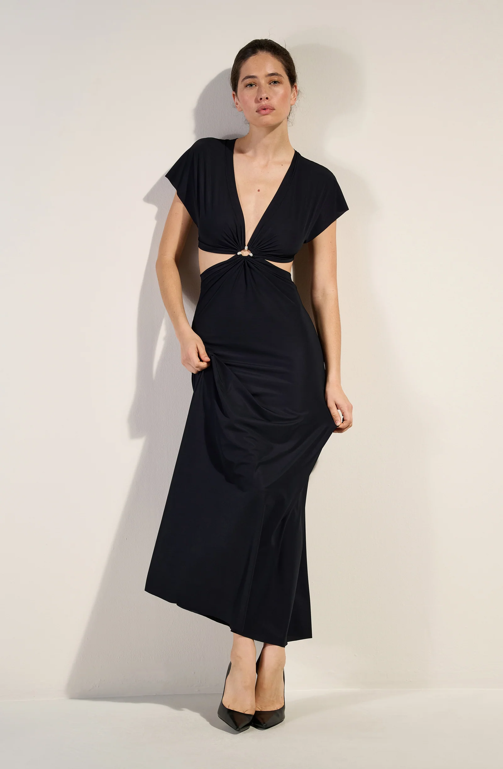 The RISLENE long cut-out dress offers a modern and bold look. Its short-sleeved top drapes around a cut-out, revealing three pearly beads, and flows into a long, fluid skirt. Black, a timeless and always elegant color.