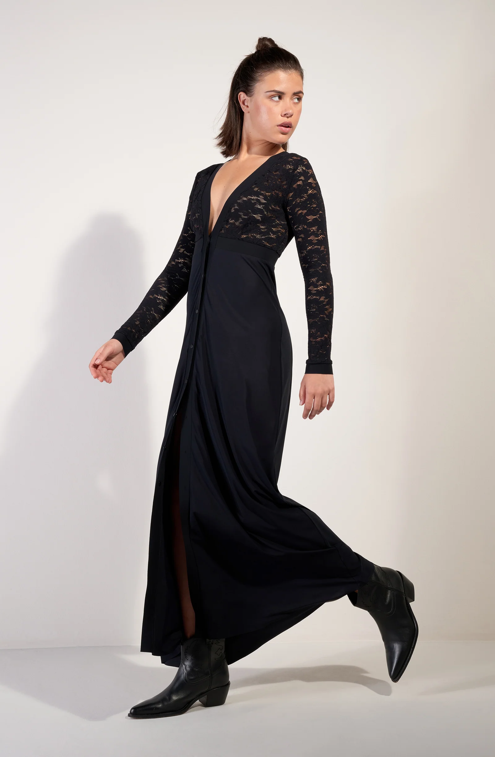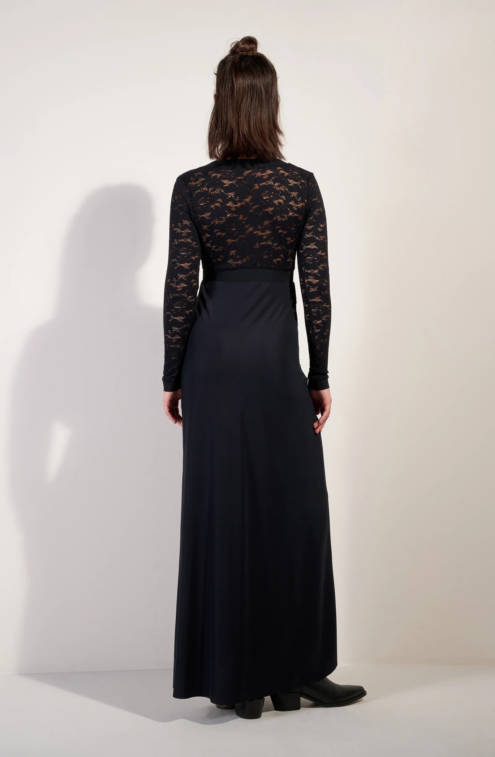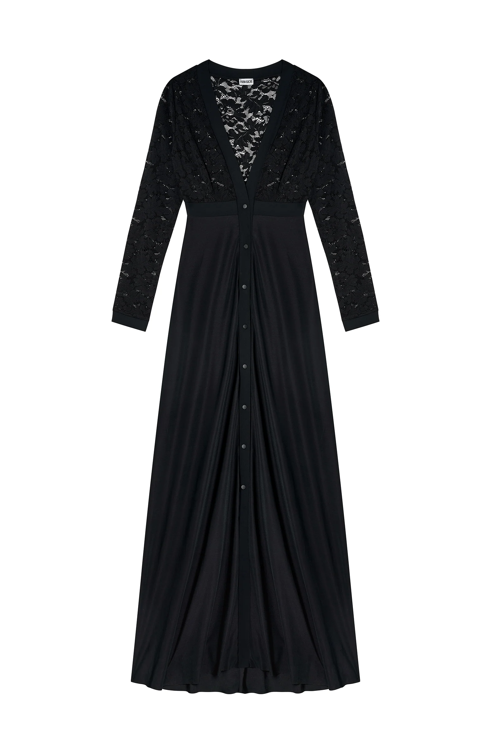 French lace top Plain fabric for the bottom of the dress Bonded underbust band V-neckline   The studio model is 1.76 m tall and wears size XS.