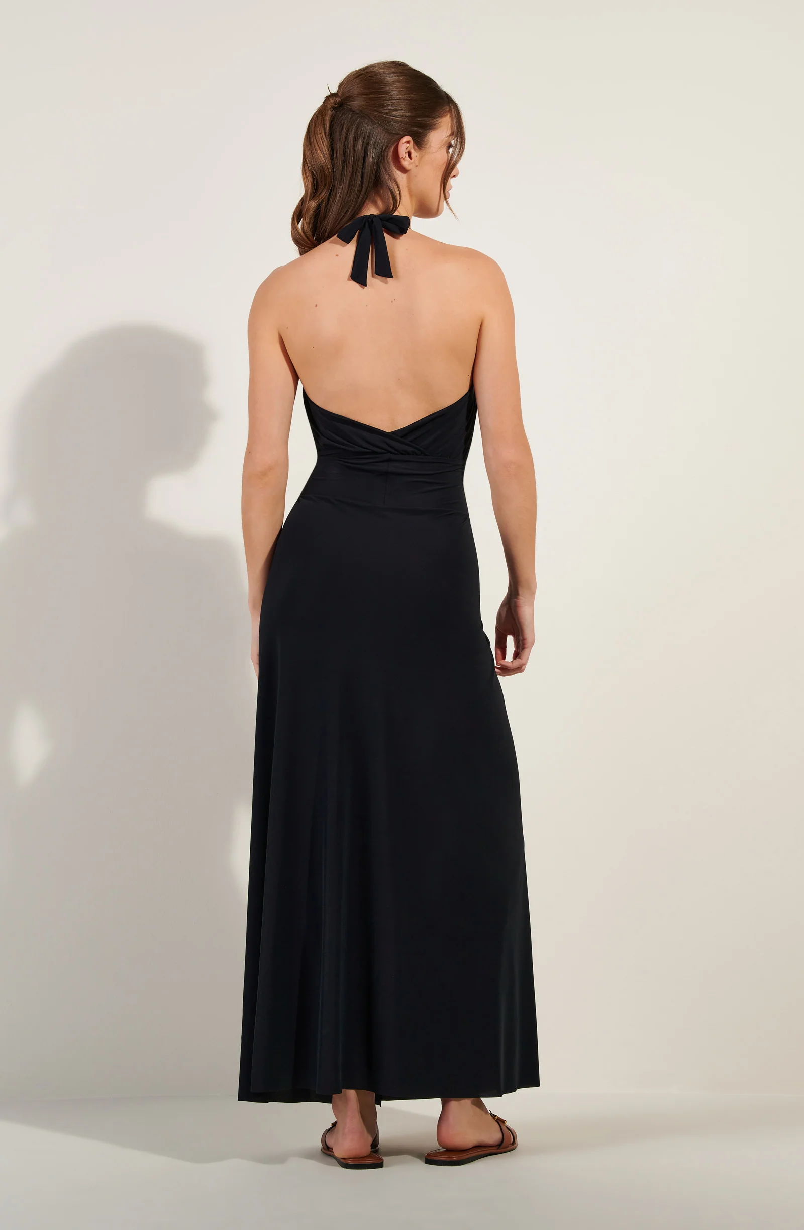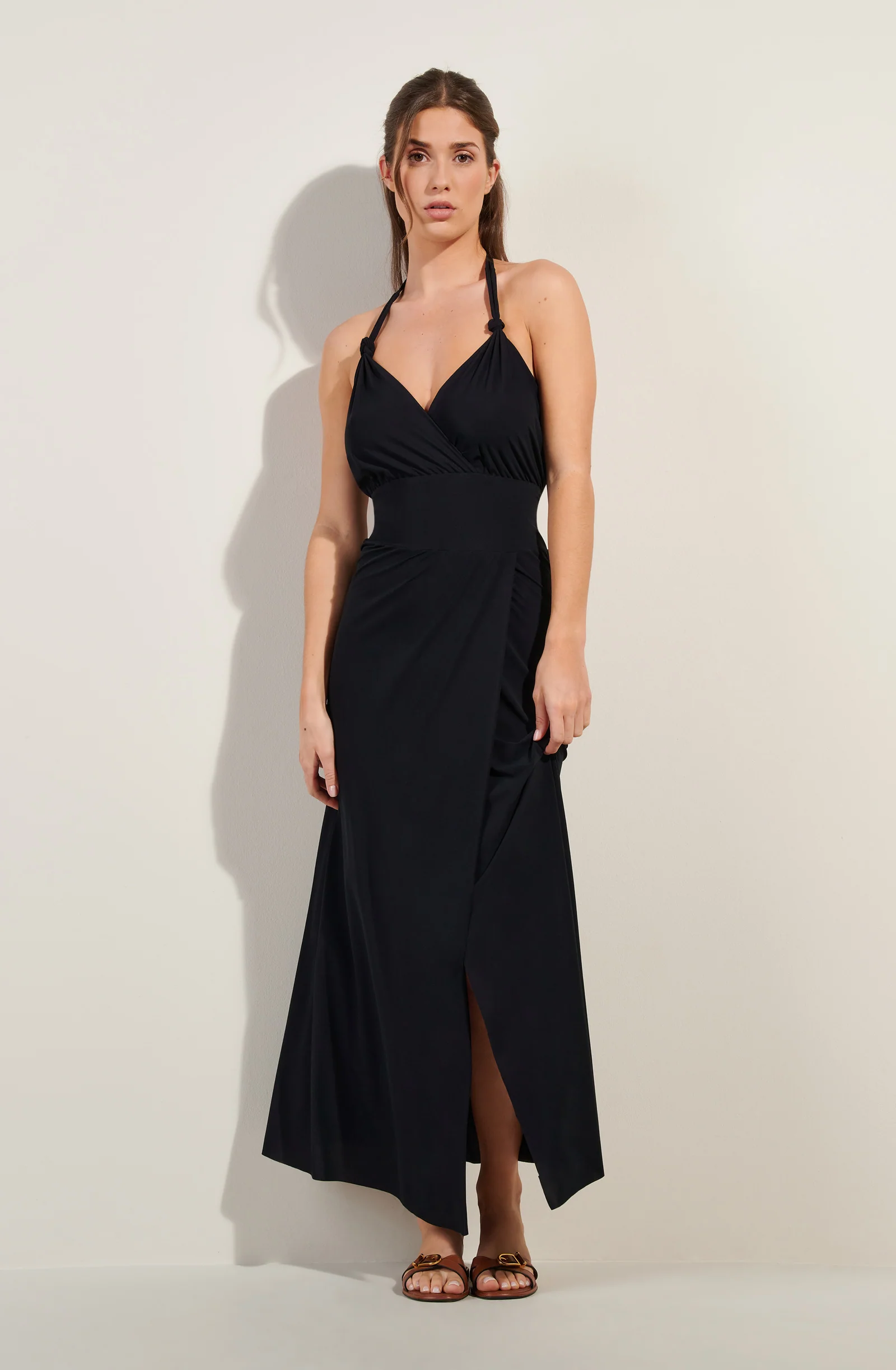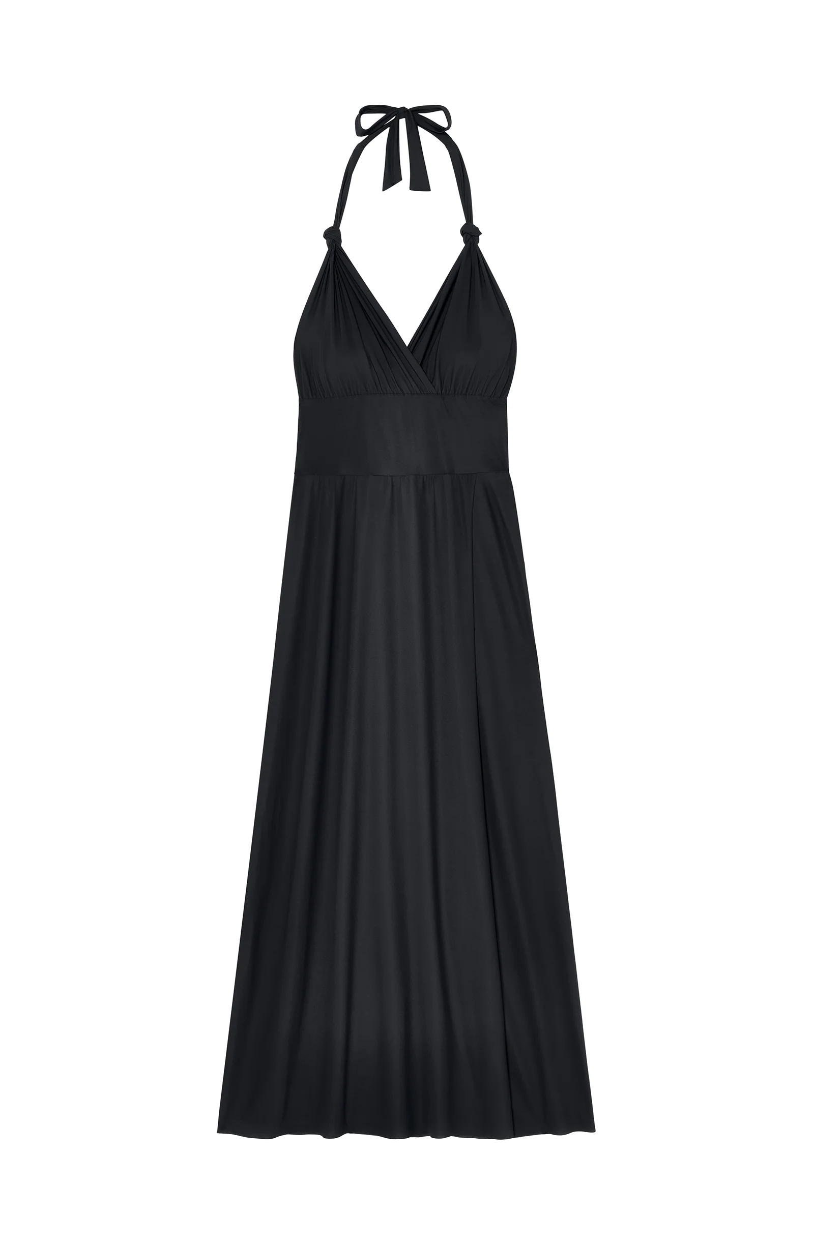 The loose dress RONA delicately enhances feminine curves. Its wrap-top cut highlights the neckline and its wide belt underlines the waist. Flowing and light, the voile of this halter neck dress ensures comfort and freshness. This is a must-have piece to face the intense summer heat. Black, a timeless colour that is always elegant.