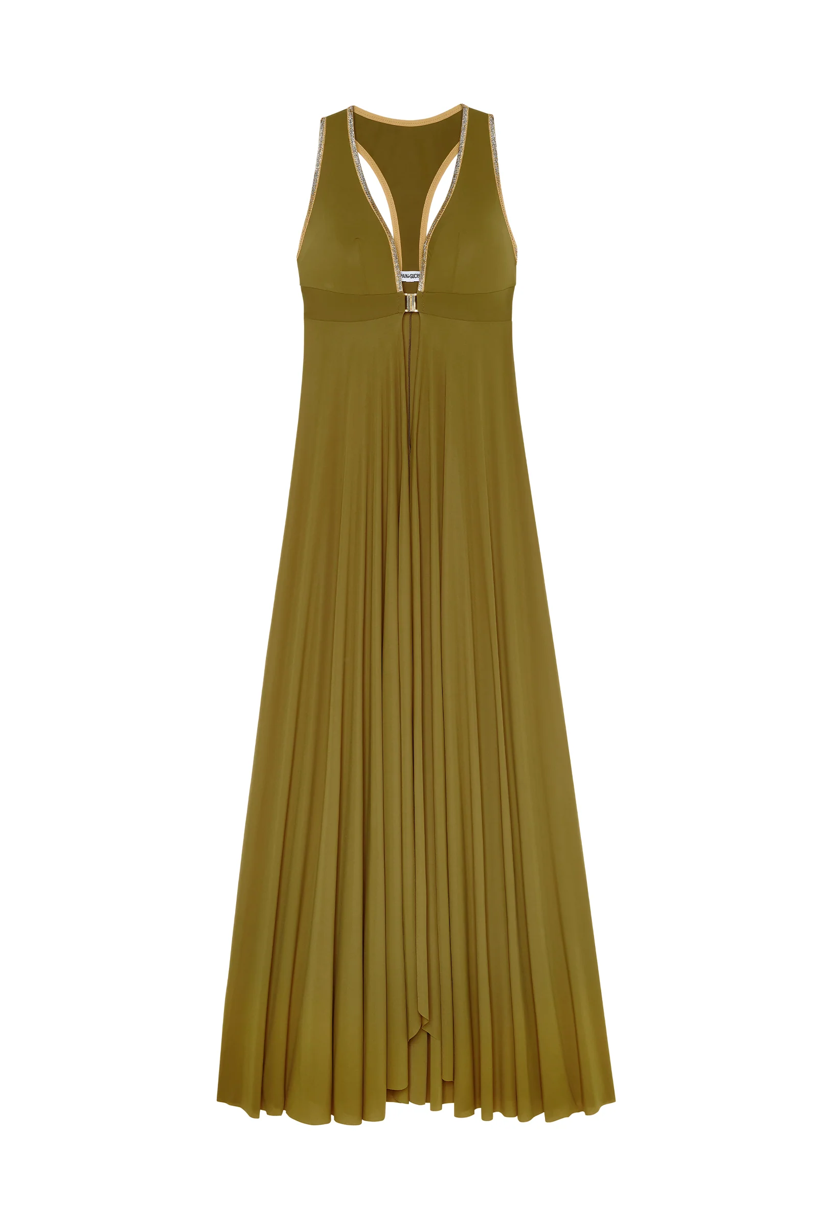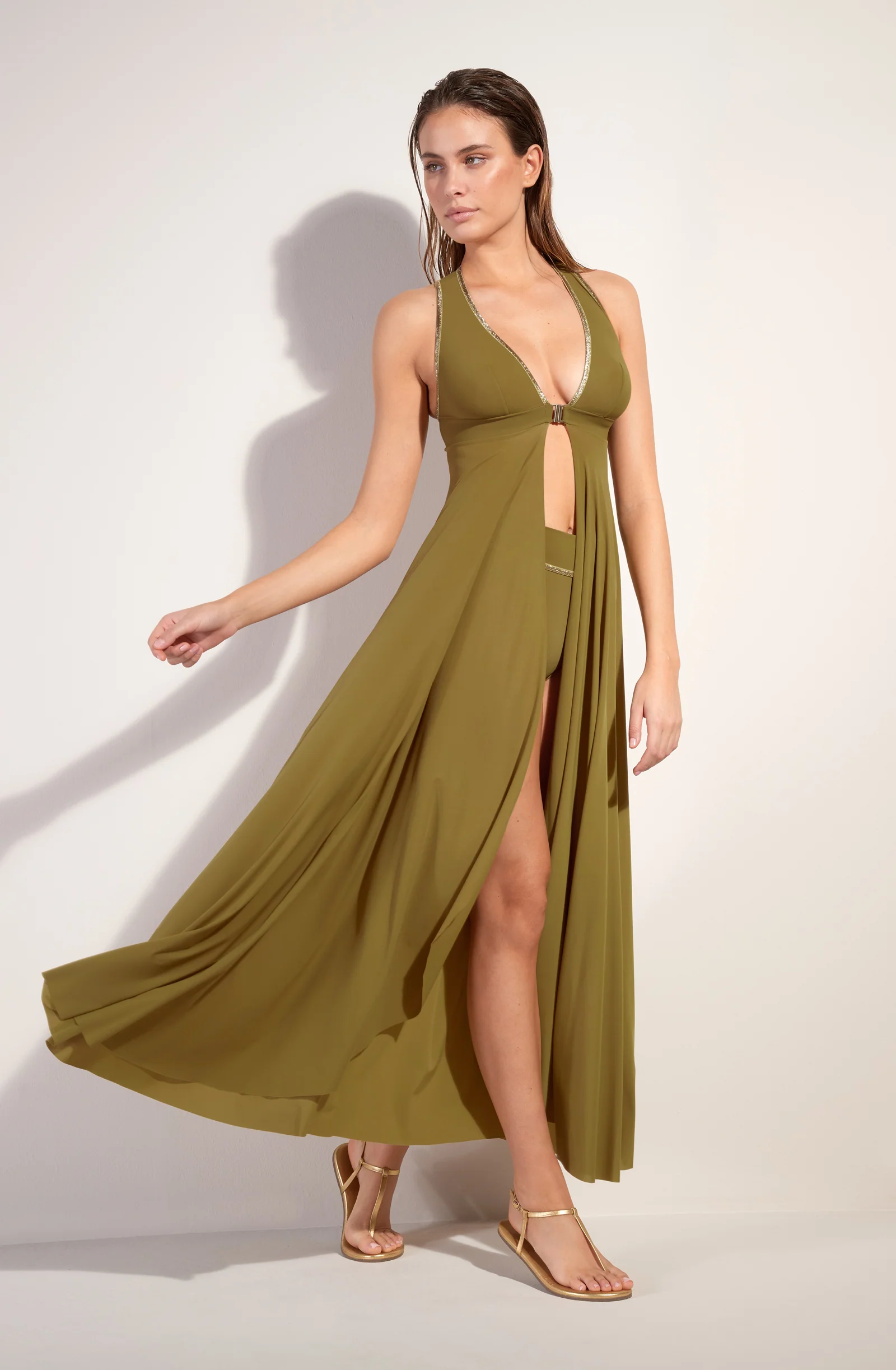 ROSANE elegantly plays with volumes. In Lycra® voile, this long opened dress is delicately fastened between the breasts. The American armholes and the neckline are adorned with golden Lurex to make the silhouette shine. Bronze, an authentic mineral shade, a blend of yellow and green.
