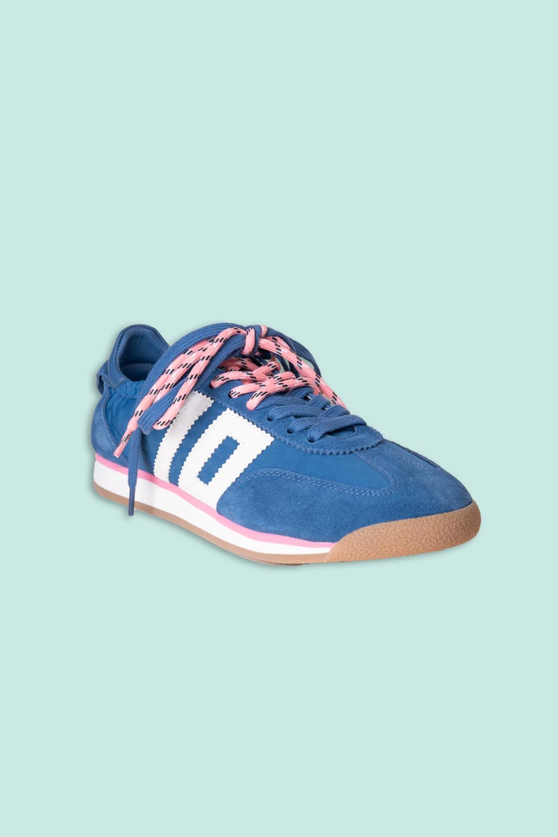Elemento distintivo è l’elastico che avvolge e chiude la caviglia, dettaglio funzionale ed estetico al tempo stesso, perfettamente in linea con le ultime proposte moda della Primavera 26. Questa soluzione dona stabilità alla calzata e aggiunge un tocco sporty–chic di grande tendenza. La tomaia combina nylon tecnico e inserti in pelle scamosciata in tonalità blu, creando un effetto materico ricercato e sportivo. Il logo laterale a contrasto dona riconoscibilità al modello, mentre i lacci rosa con trama grafica aggiungono un tocco vivace e distintivo. La suola in gomma flessibile (1,5 cm in punta e 2,5 cm al tallone) con inserto…