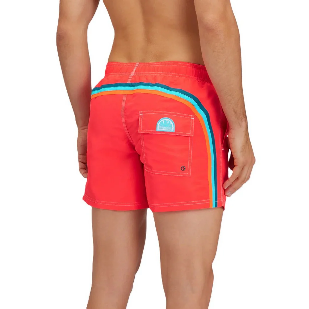Shorts uomo mare corto e con vita elasticata, coulisse e iconico arcobaleno Sundek sul retro.