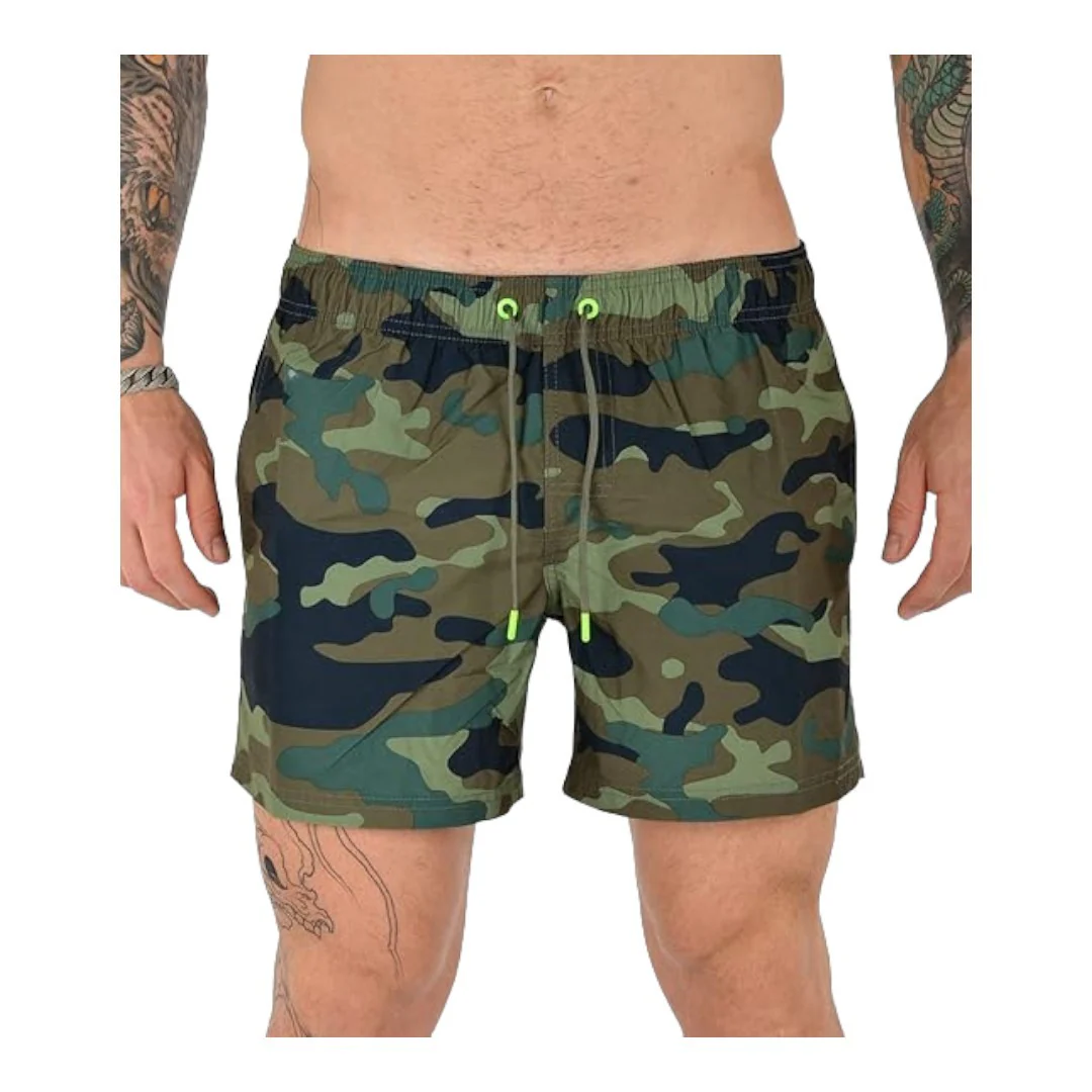 Pantaloncini da bagno SUNDEK nella variante verde. Vita elastica e coulisse. Due tasche laterali e una tasca con patta e velcro sul retro. Due strisce verdi e bianche sul retro e sul lato. Lunghezza 14″.