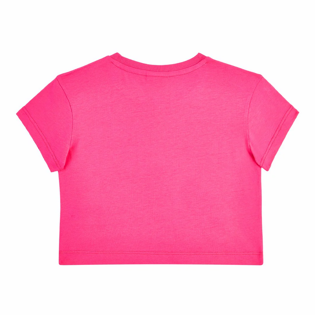 T-shirt bambina crop da indossare sopra jeans o gonne. Modello immancabile per il guardaroba della tua bambina Specifiche: GirocolloLogo stampato a contrasto davantiProfili a costine 100% CO